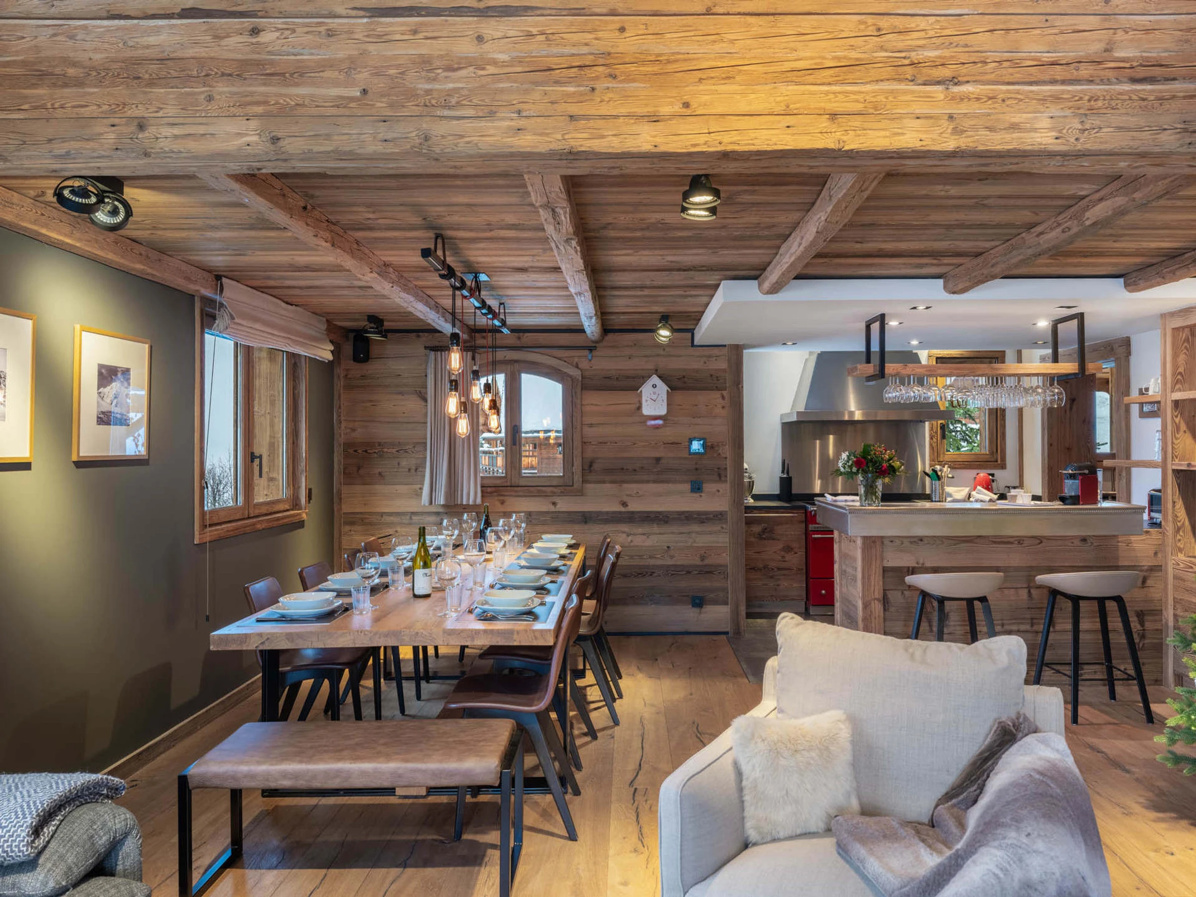 - Cuisine équipée : réfrigérateur/congélateur, piano de cuisson, lave-vaisselle, micro-onde, mixeur, batteur, gaufrier, bouilloire, grille-pain, cafetière électrique, Nespresso, service à fondue, appareil à raclette