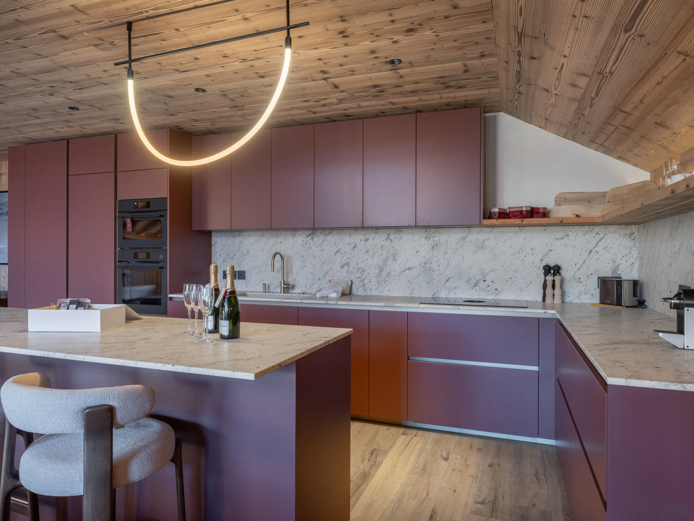 - Grand séjour de 90m2 avec cheminée centrale à l'éthanol, cuisine ouverte bien équipée avec four, micro-onde, réfrigérateur, lave-vaisselle, bouilloire, cave à vin et toaster. Espace repas donnant sur une terrasse de 23m2