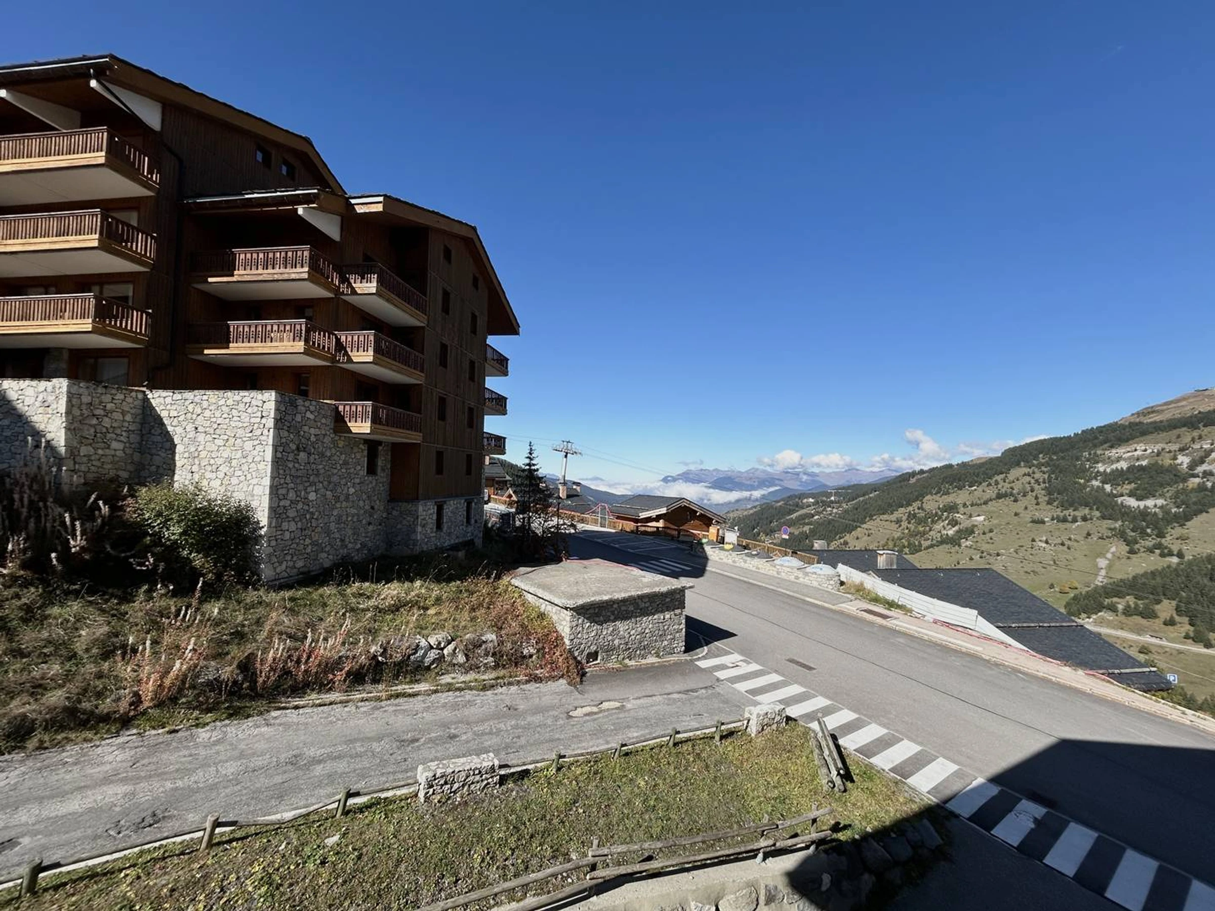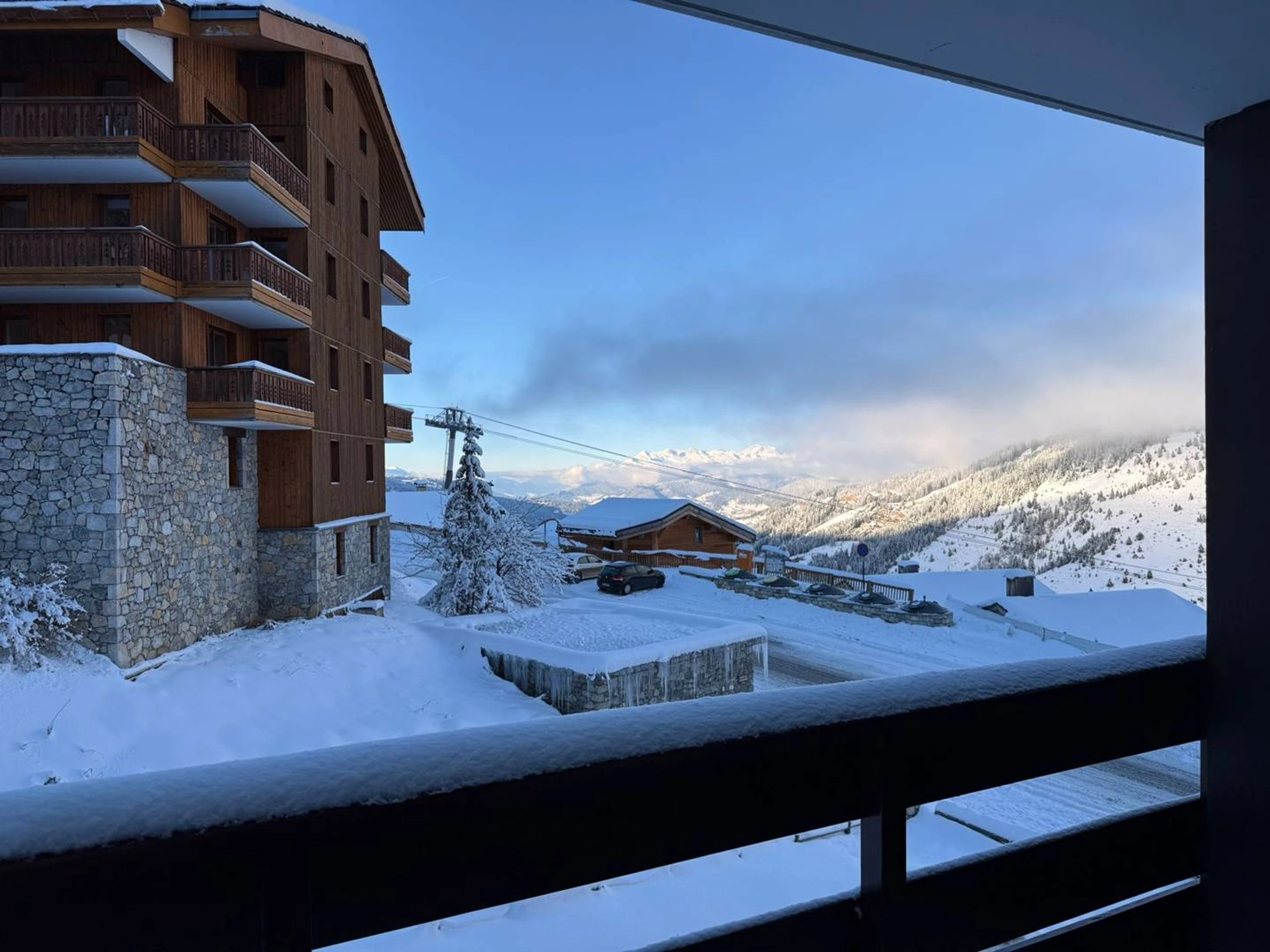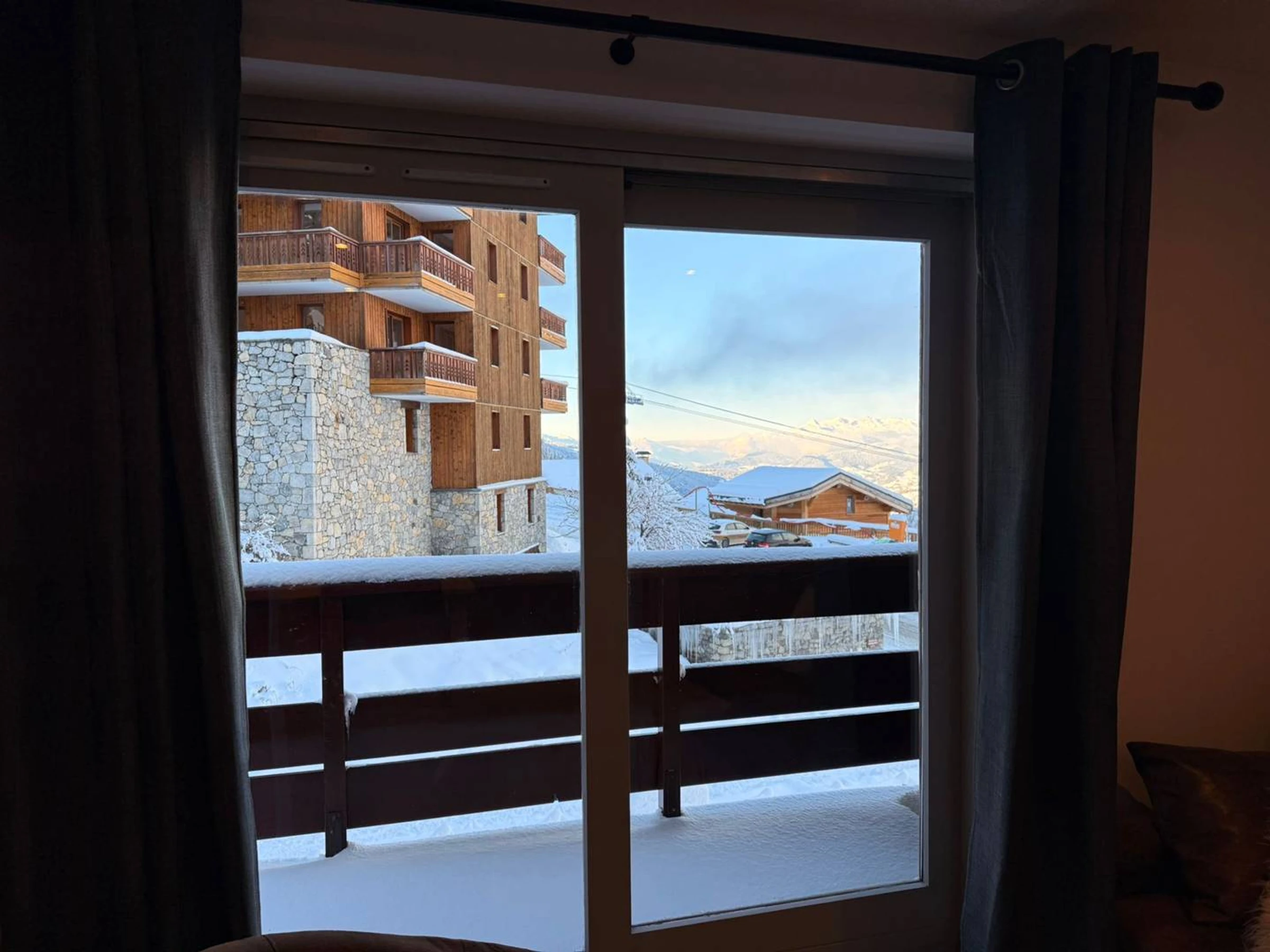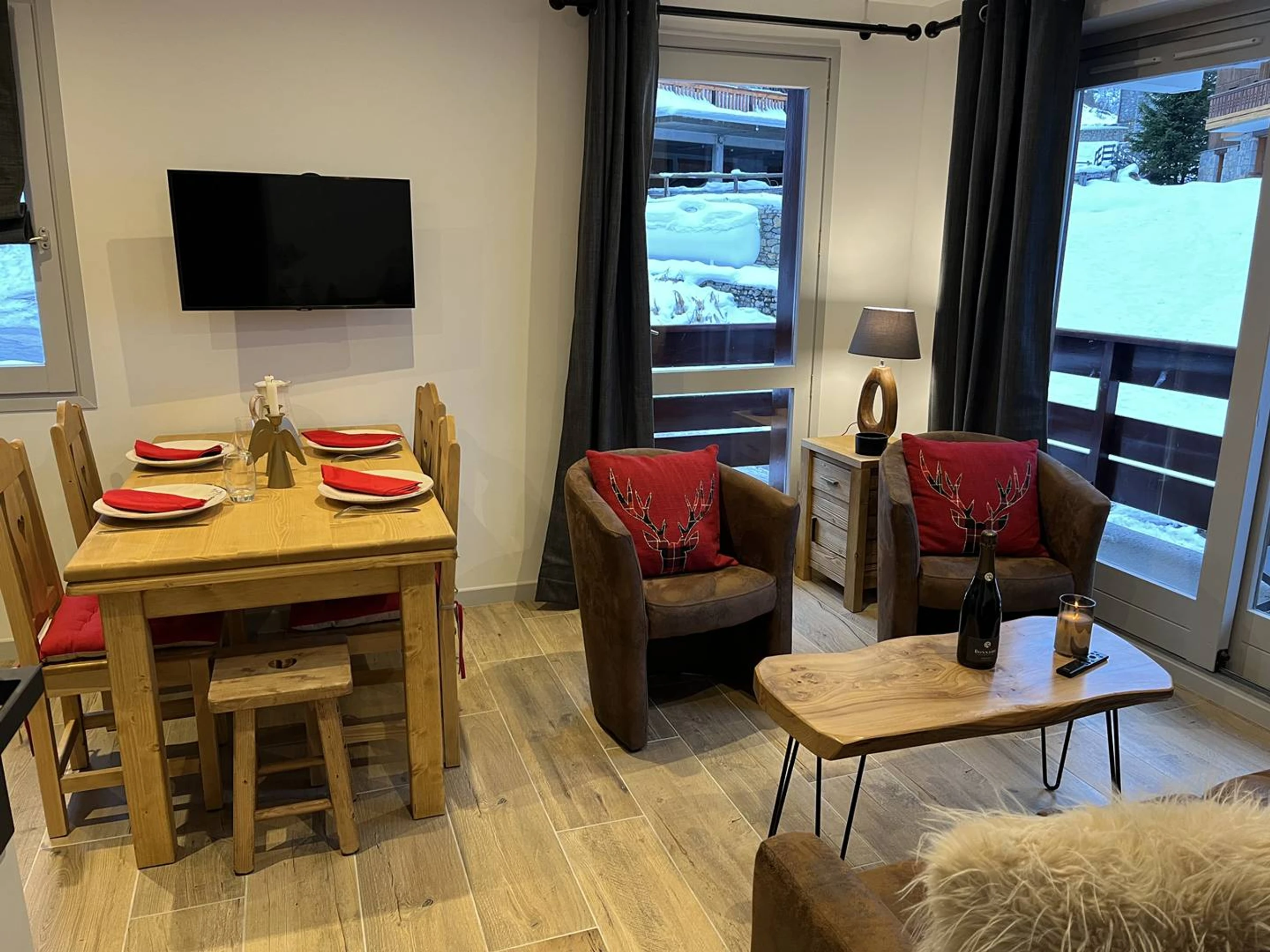 Le séjour en angle avec TV et wifi, sans couchage, profite de grandes ouvertures donnant sur deux larges balcons, offrant une impression d’espace et de clarté rare à la montagne.