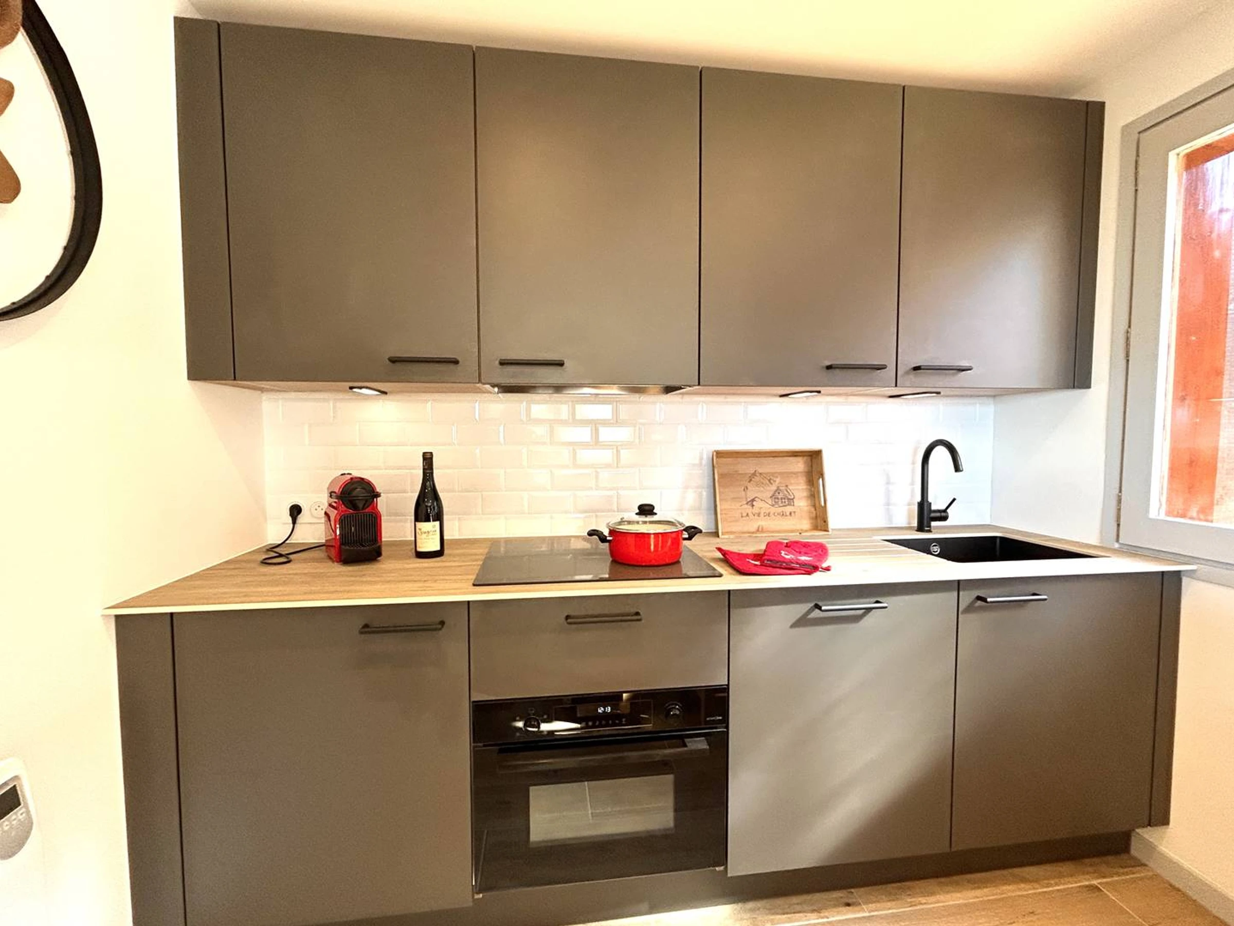 La cuisine ouverte sur le séjour, moderne et entièrement équipée (plaques vitrocéramiques, four à micro onde, lave-vaisselle, ustensiles complets), permet de préparer vos repas dans le confort d’un véritable chez-vous.