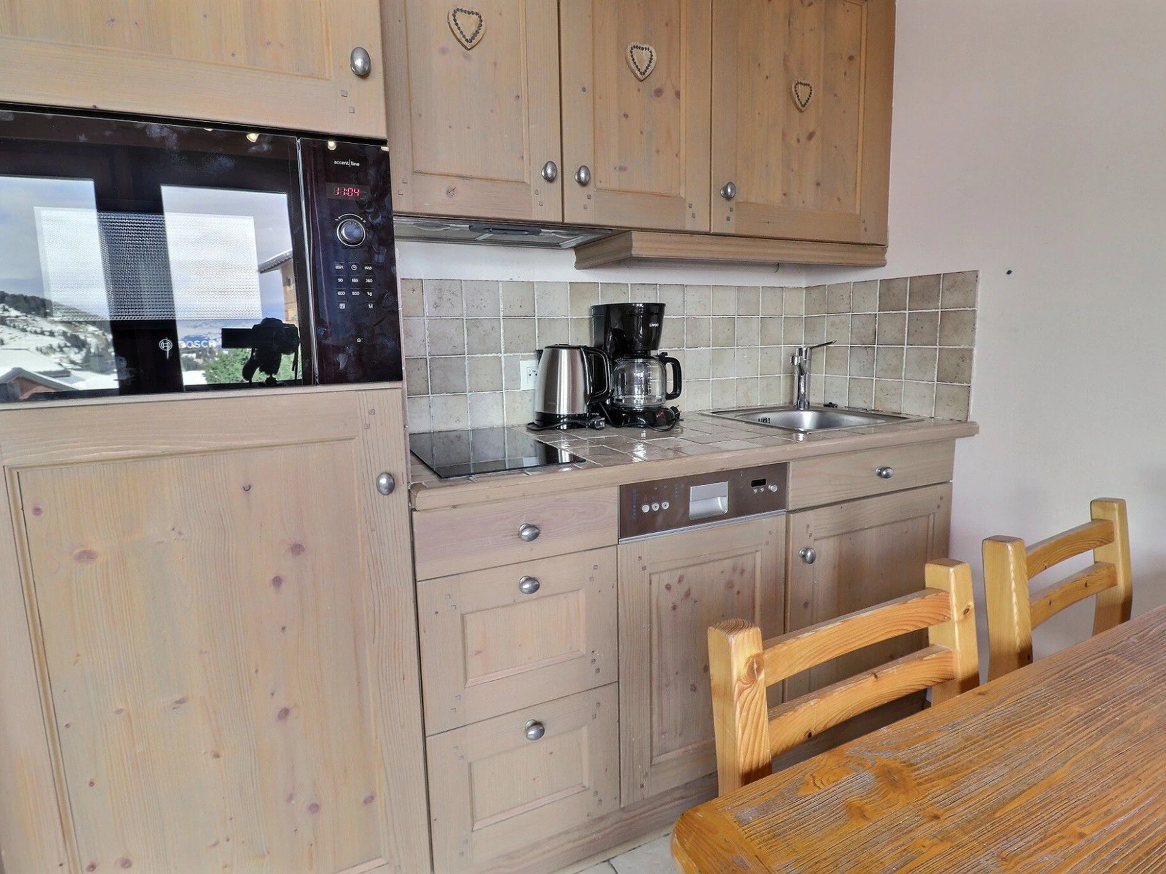 Kitchenette ouverte : 2 plaques vitro-céramiques, frigdaire, four micro-ondes & grill, lave-vaisselle, cafetière à filtre, grille pain, bouilloire, hotte
