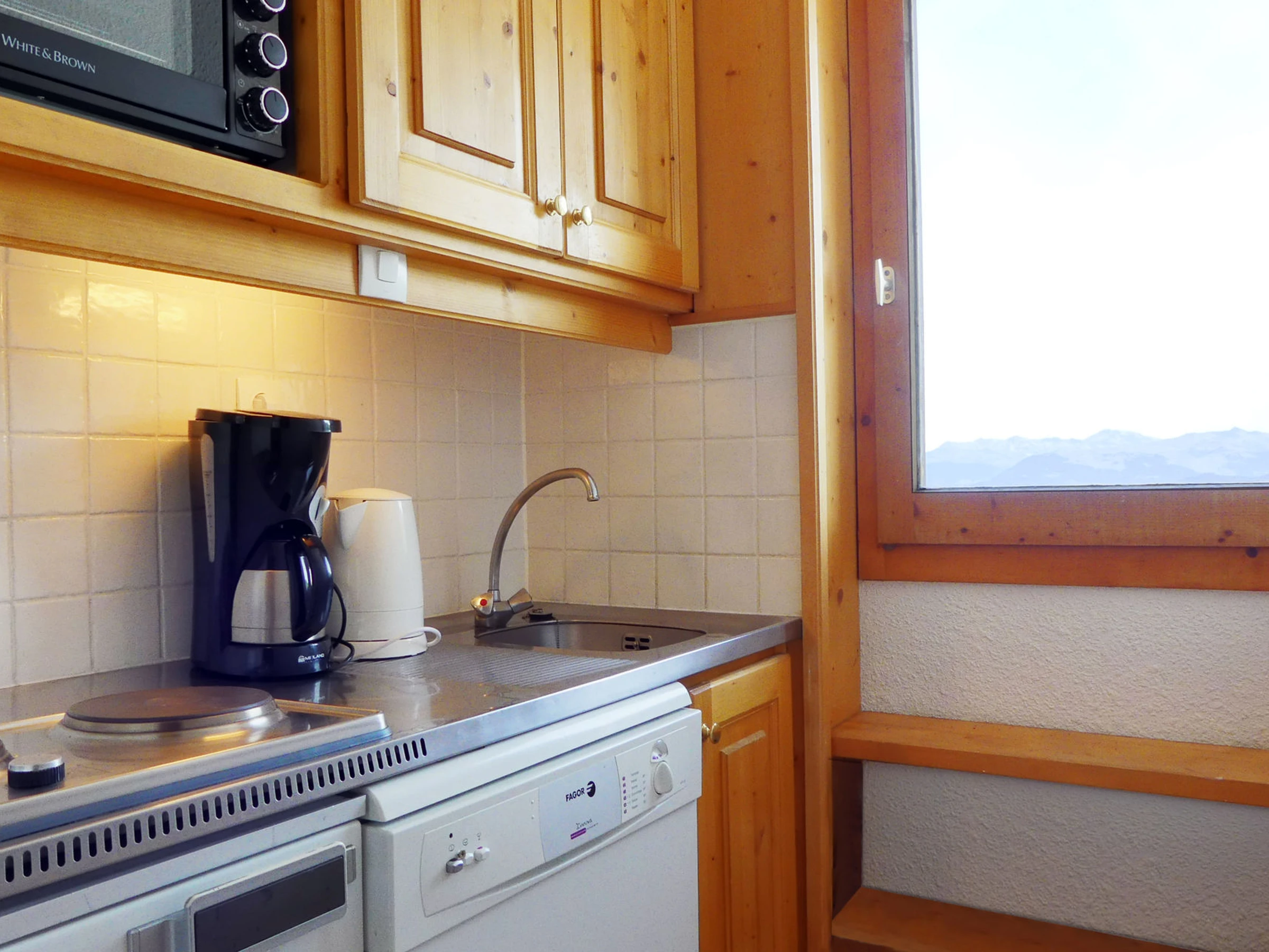 Kitchenette séparée par porte coulissante : four, frigidaire, lave-vaisselle, 2 plaques électriques, cafetière Dolce Gusto, cafetière électrique, bouilloire, grille pain