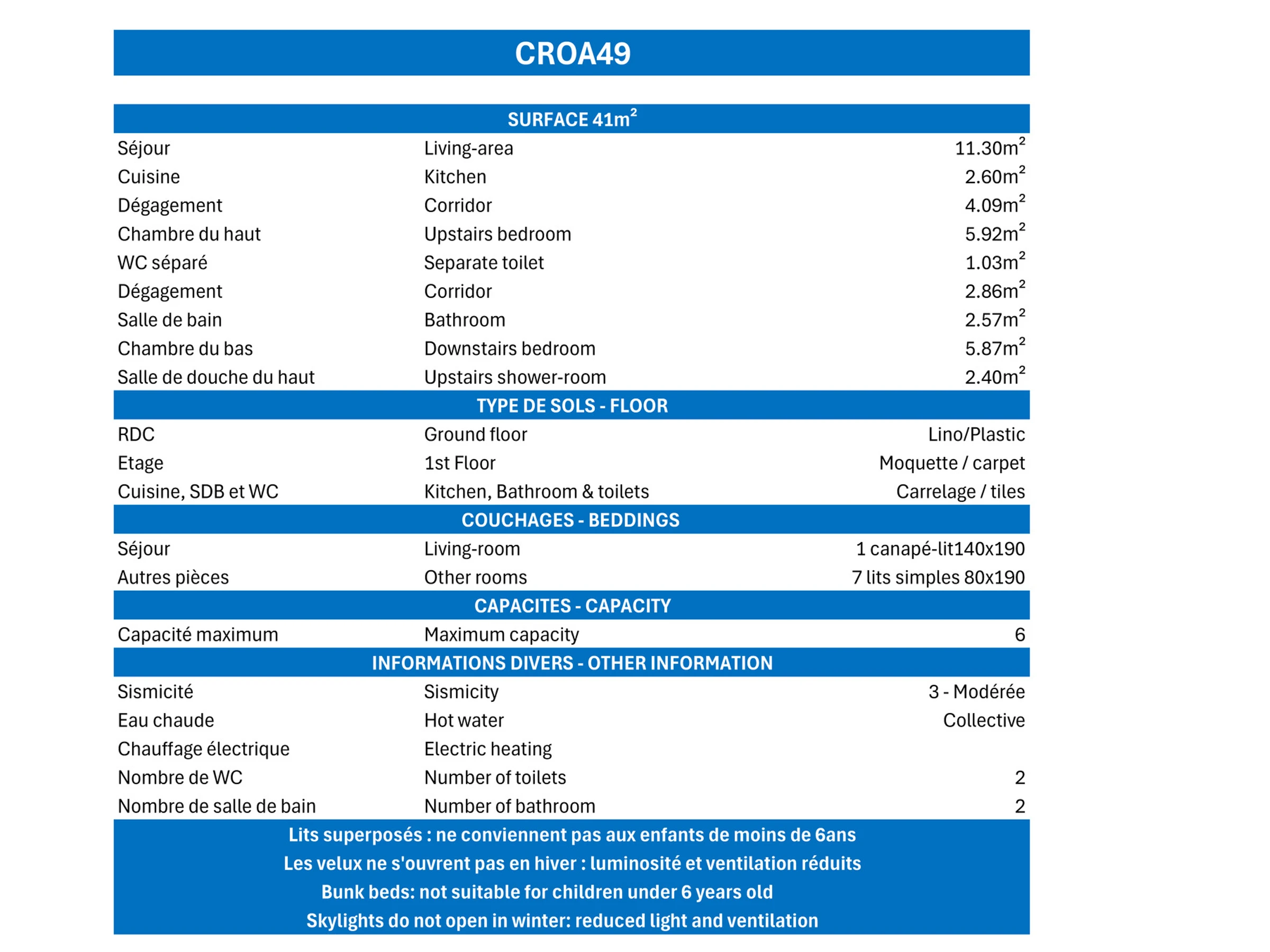 . Ménage 2 Pièces duplex/cabine : 85.0 € par séjour