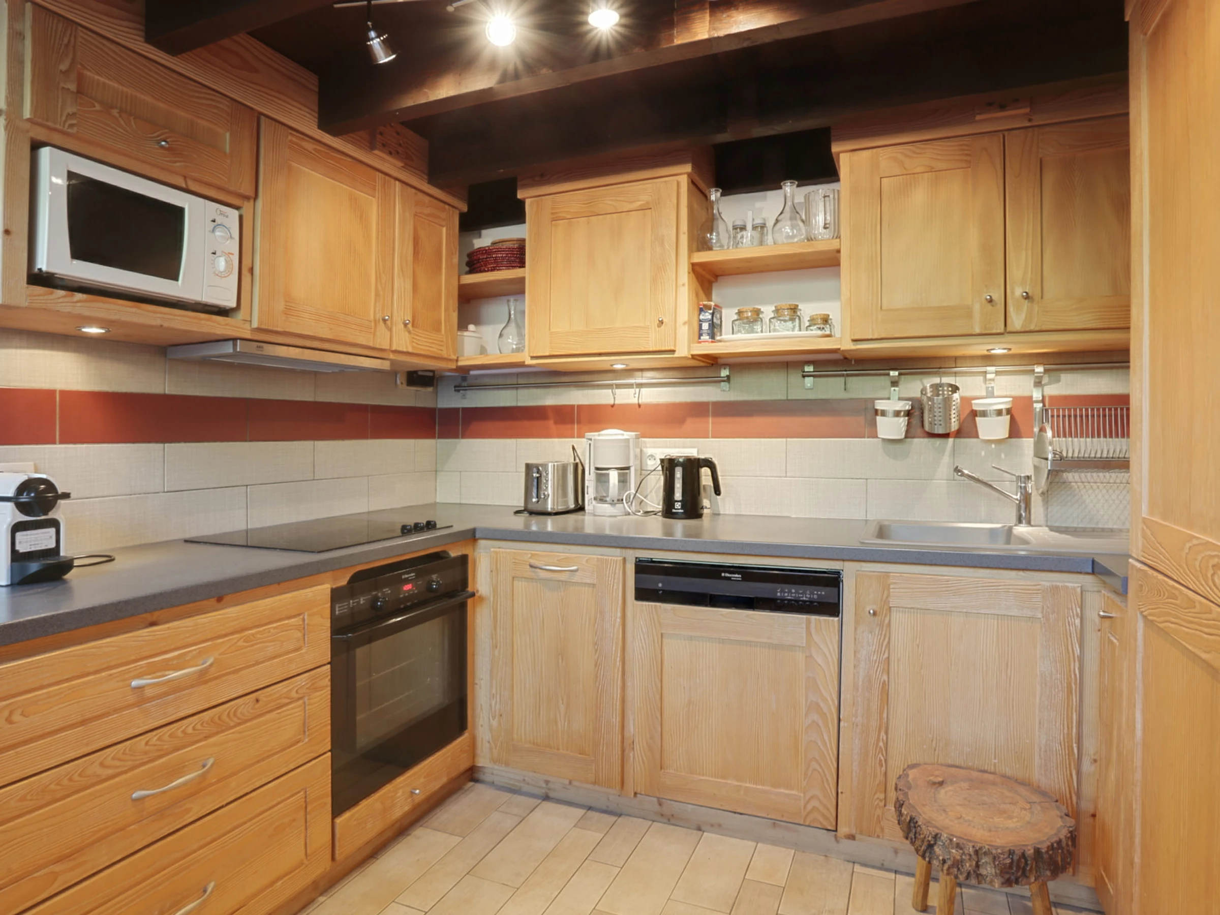 Il est équipé de plaques vitro-céramiques, d'un four, d'un micro-ondes, d'un lave vaisselle et d'un réfrigérateur avec congélateur.