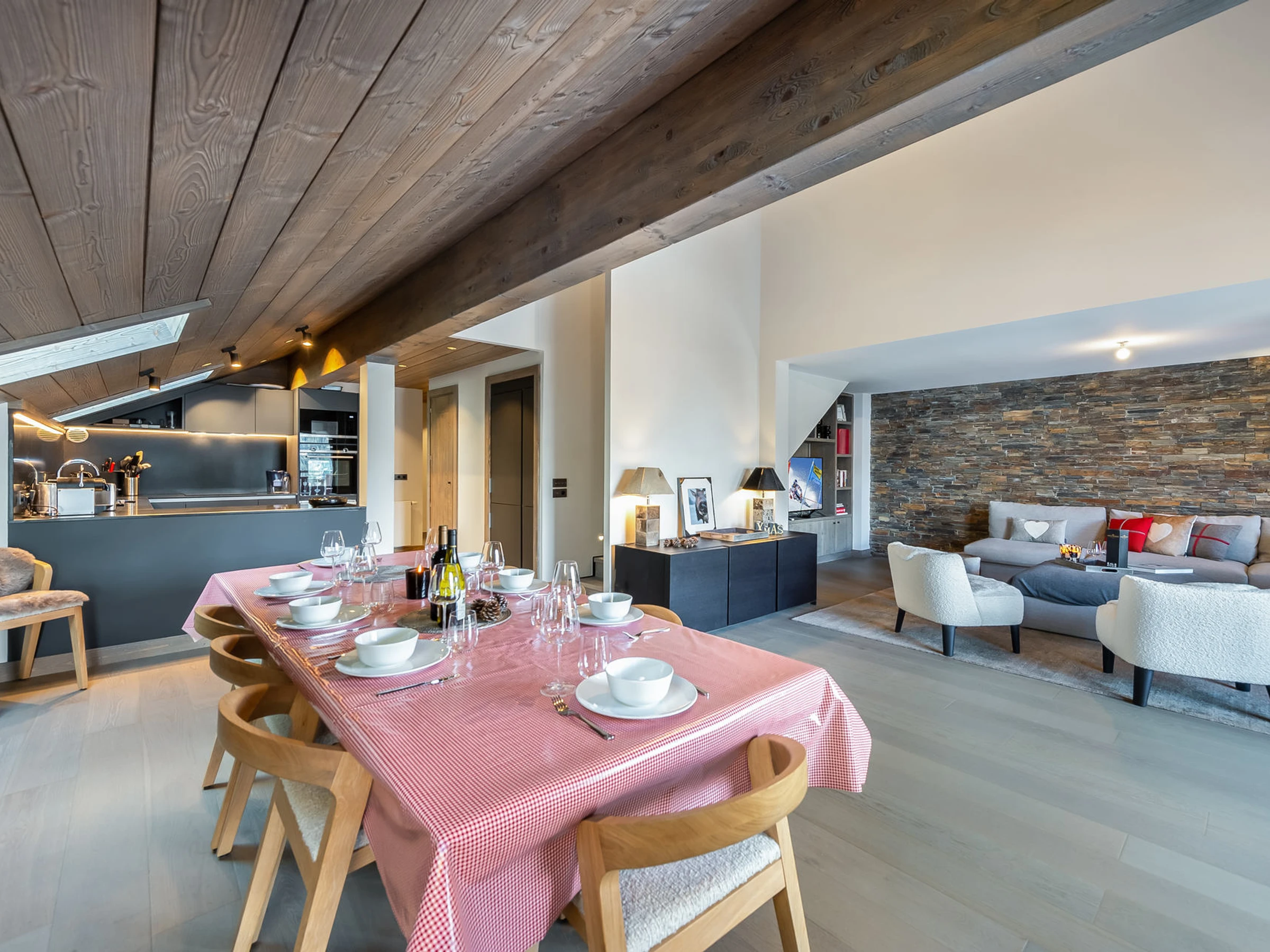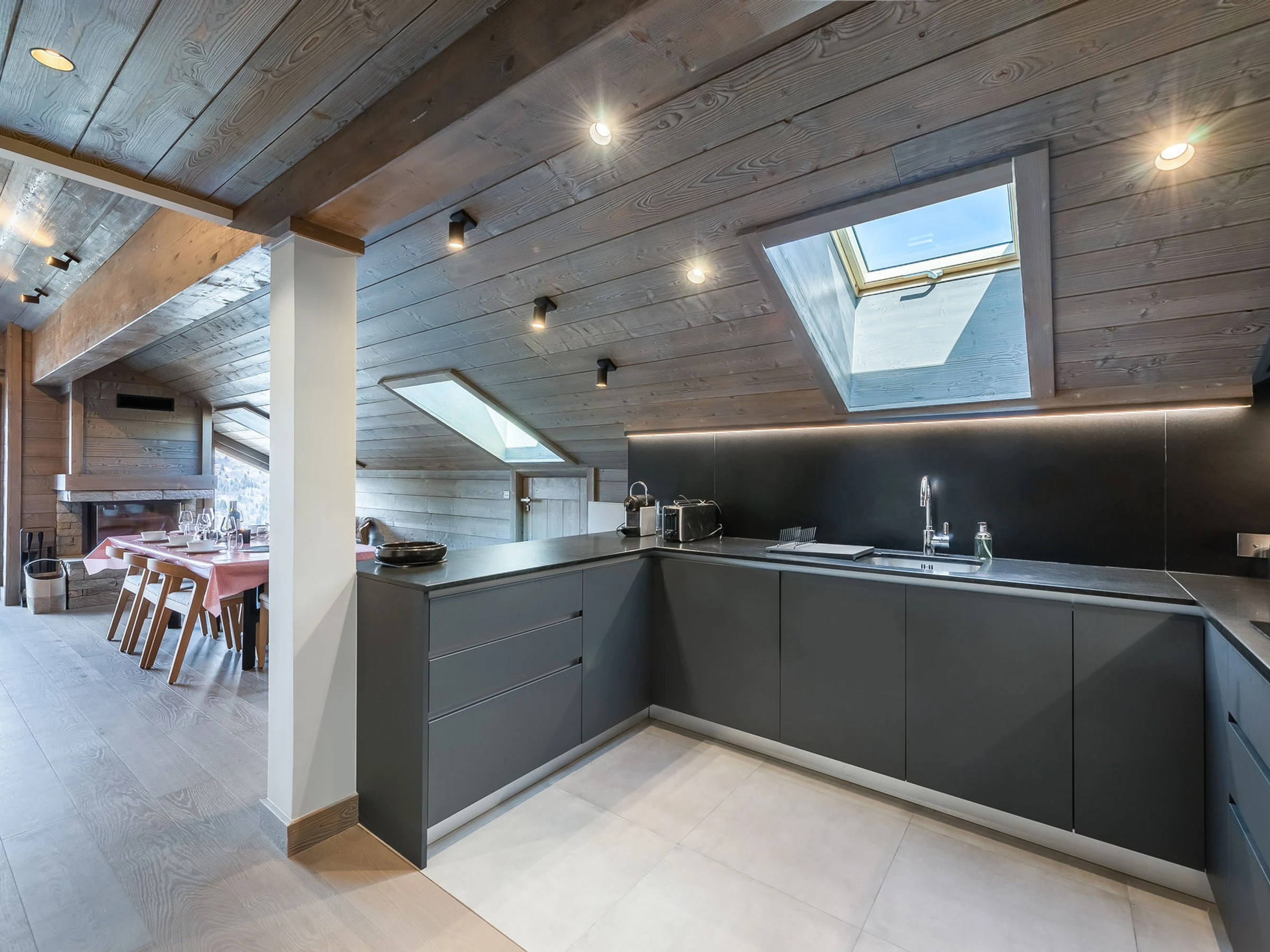 - Cuisine ouverte entièrement équipée : appareil à fondue, appareil à raclette et pierrade, bouilloire, Nespresso, cave à vin, micro-onde, four, congélateur, grille-pain, hotte, plaques à induction, robot, lave-vaisselle