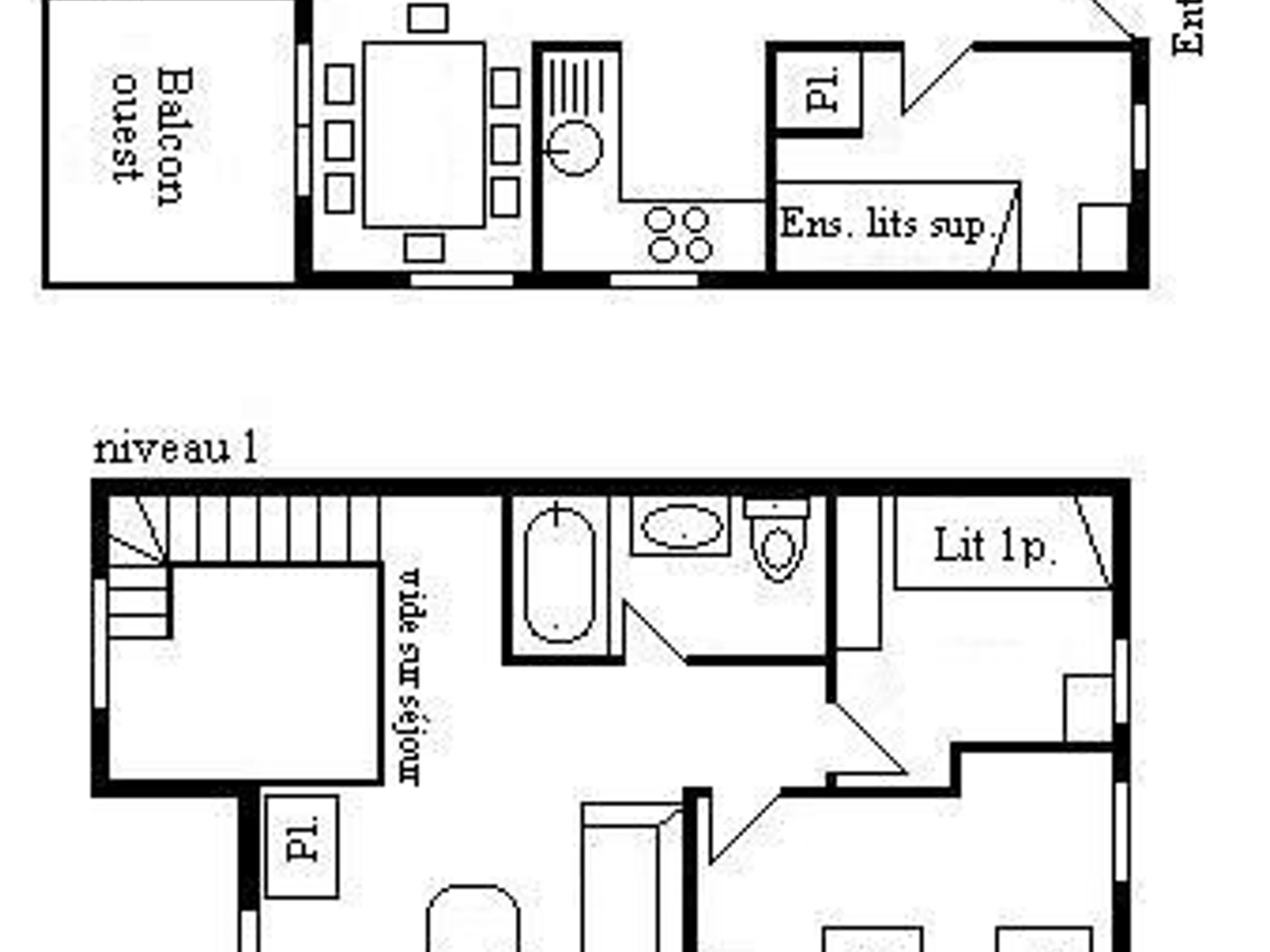 La résidence les Hauts de Chantemouche est située à environ 130m de l'arrêt de bus, à 150m des pistes du télésiège de Morel, à 300m des commerces et restaurants. Cet appartement de vacances en duplex, situé au deuxième étage, avec ascenseur, se compose d'une cuisine équipée ouverte sur le séjour avec un coin repas donnant sur un balcon Ouest, une chambre 1 ensemble de 2 lits superposés, une autre chambre avec 1 ensemble de 2 lits superposés, 1 salle d'eau avec wc. A l'étage, une mezzanine avec 1 lit 1 personne, une chambre avec 2 lits 1 personne, 1 chambre avec 1 lit 1 personne et 1 salle de bain avec wc.