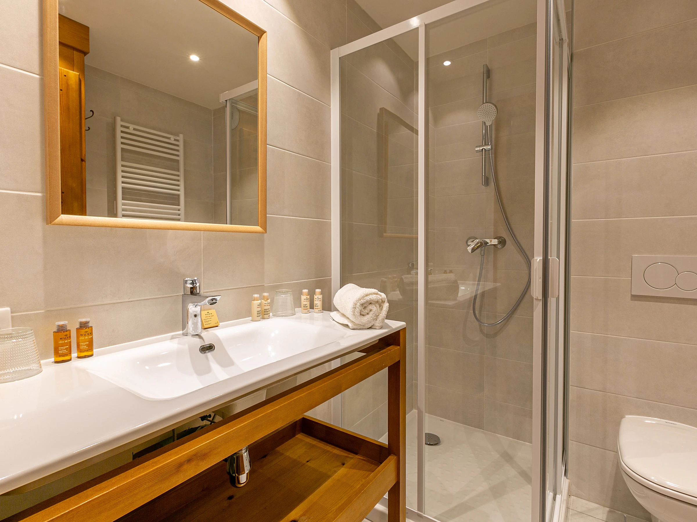 - Chambre avec lits jumeaux et salle de douche attenante avec WC
