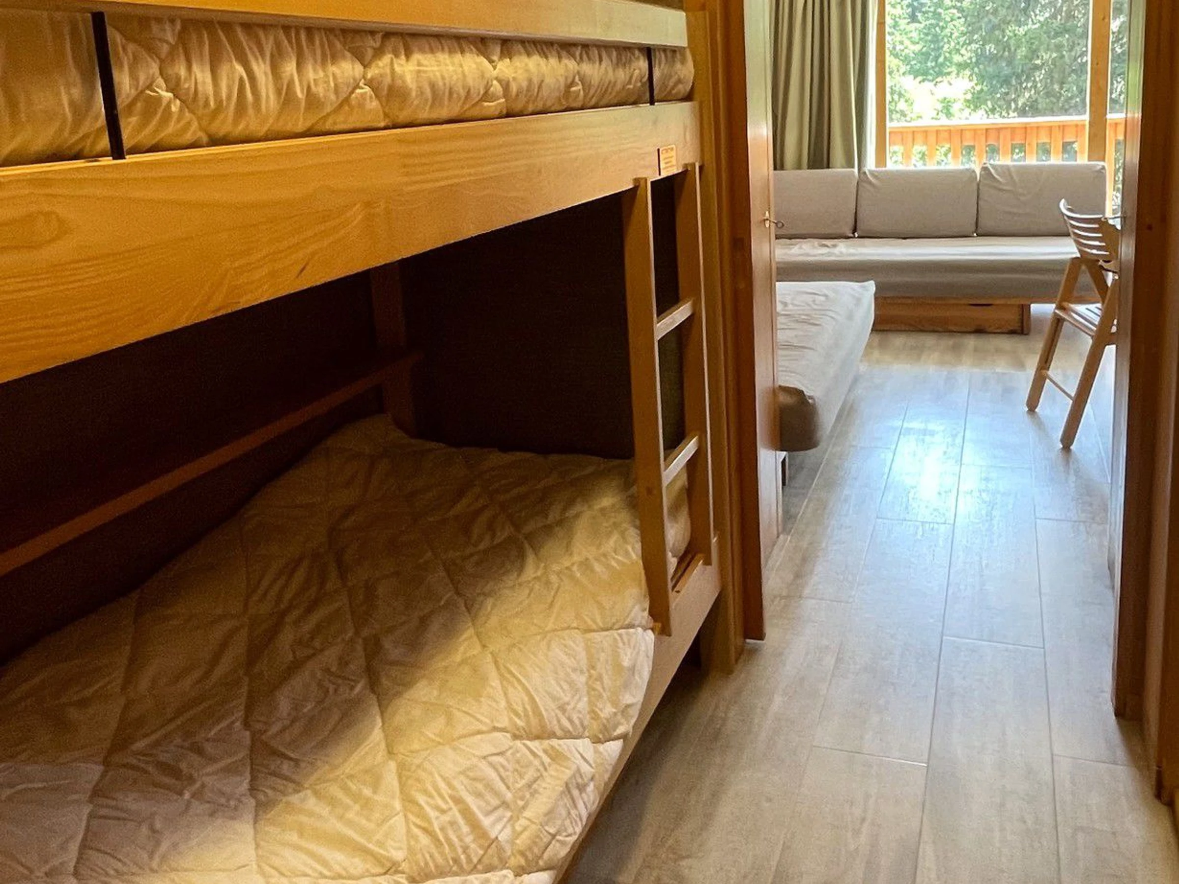 Un coin montagne avec 1 ensemble de lits superposés (2x80 cm). Merci de noter que le couchage en hauteur ne convient pas à des enfants de moins de 6 ans.