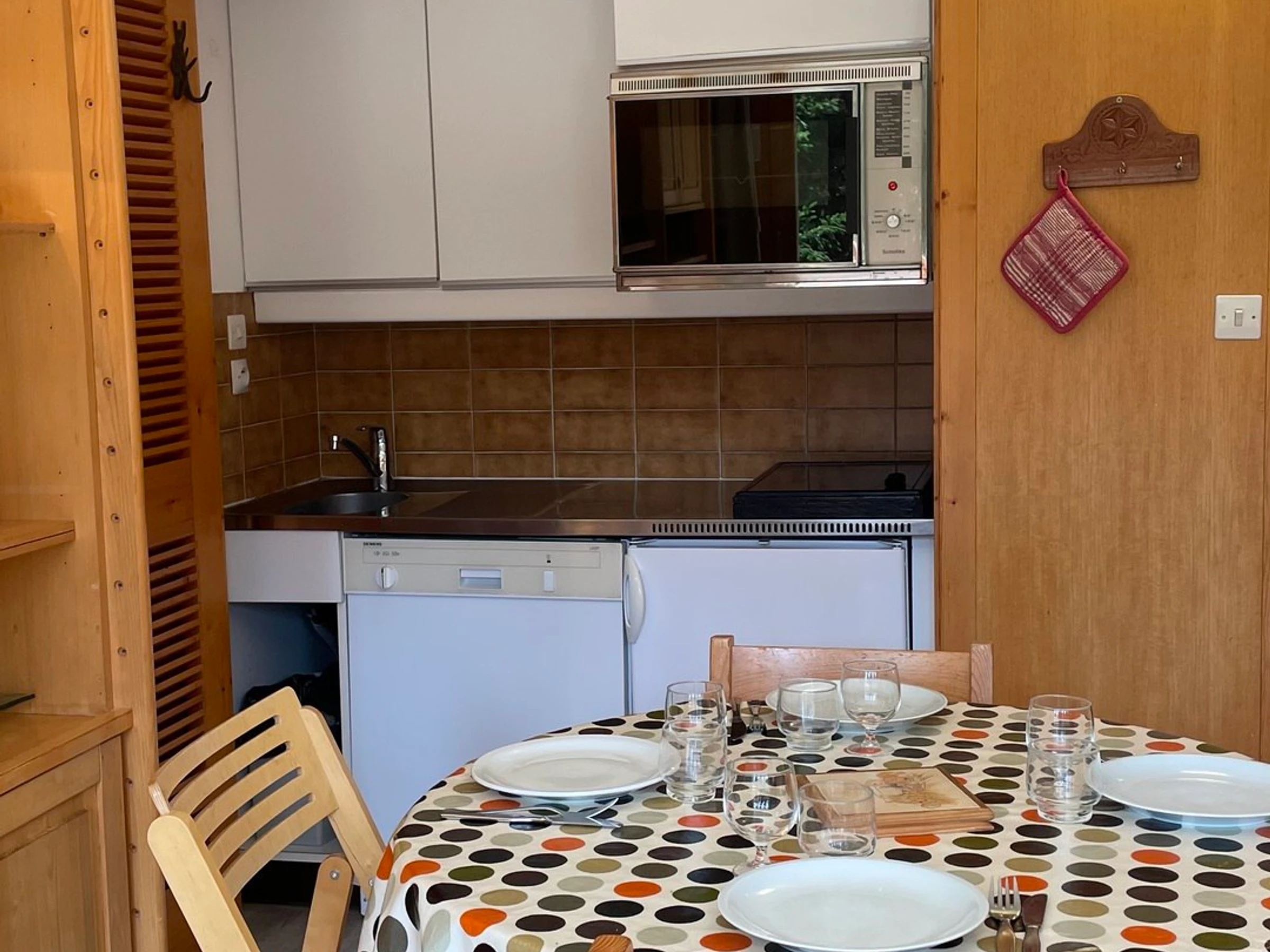Il est équipé de plaques électriques, d'un four, d'un four micro-onde, d'un lave vaisselle d'un réfrigérateur et d'une machine à laver.