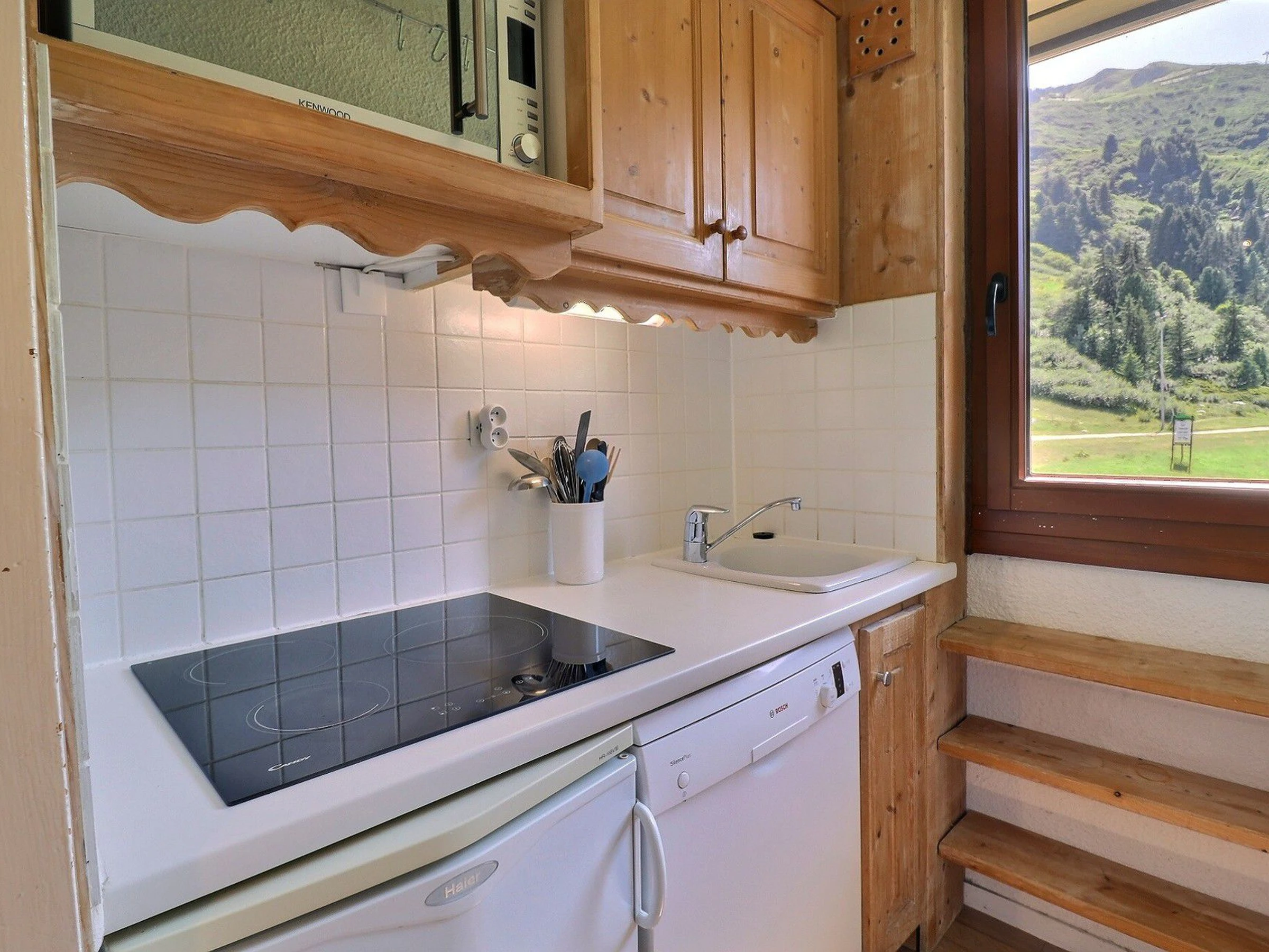 Cuisine ouverte : four combiné micro-ondes grill, frigidaire, lave-vaisselle, 3 plaques vitro-céramiques, cafetière à filtre, grille-pain, bouilloire