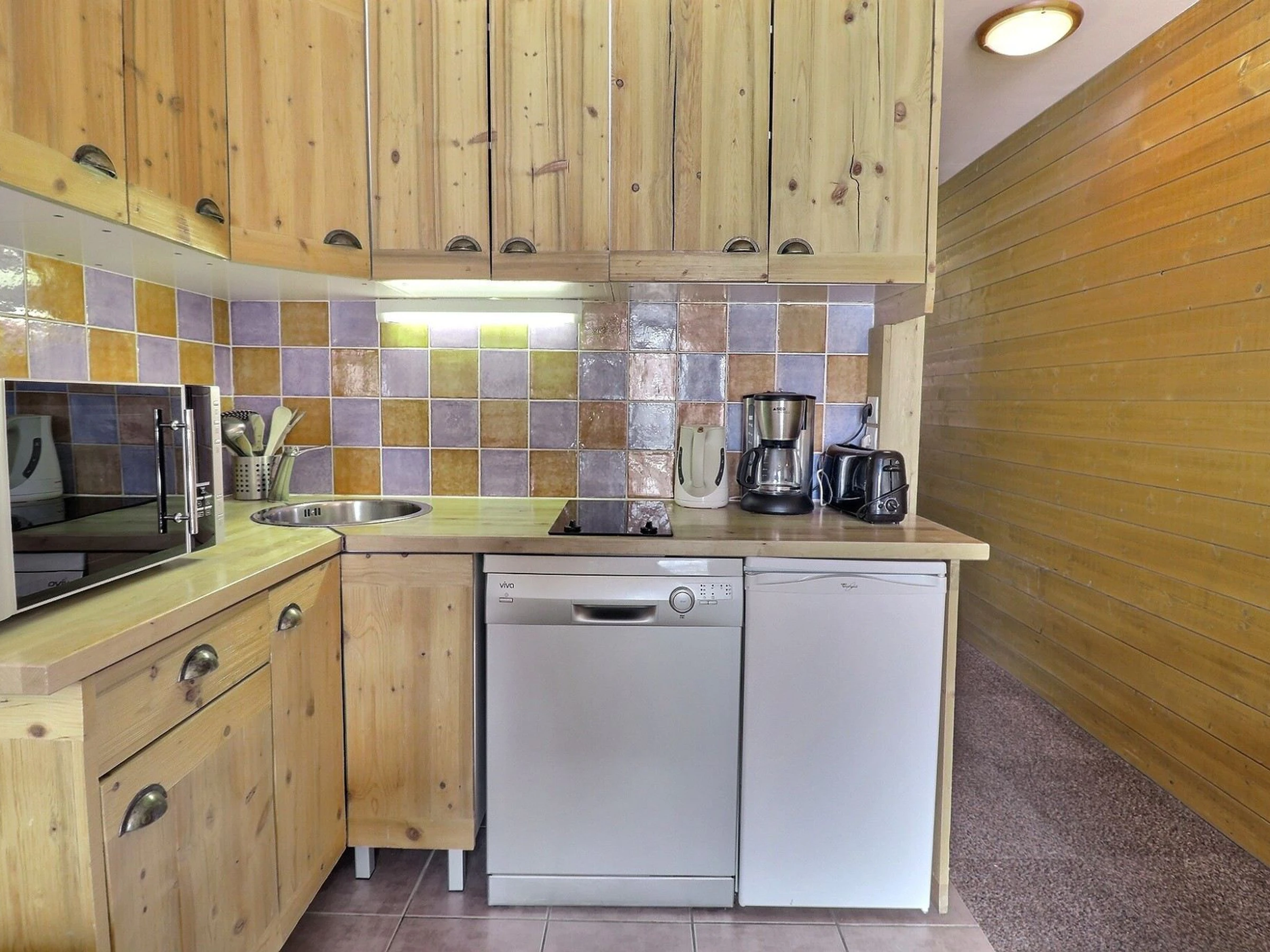 Cuisine ouverte : frigidaire, 2 plaques vitro-céramiques, lave-vaiselle, four combiné micro-ondes, cafetière à filtre, grille pain, bouilloire