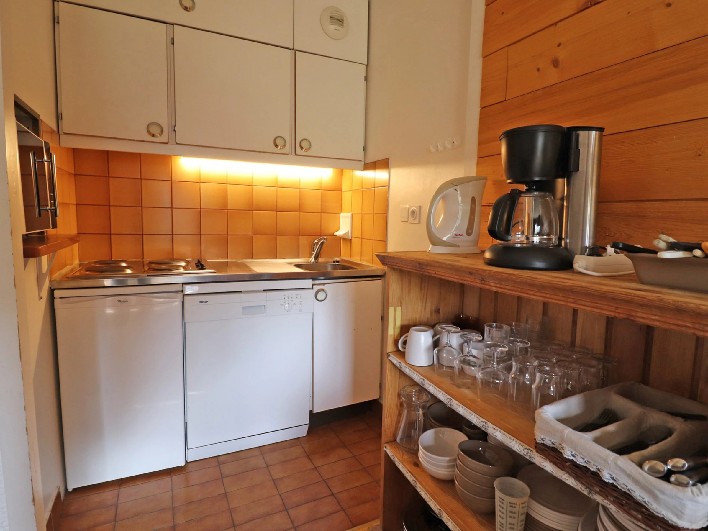 Kitchenette : frigo, lave-vaisselle, 4 plaques électriques, four combiné micro-ondes et grill, cafetière à filtre SEB, grille-pain SEB, bouilloire Philips
