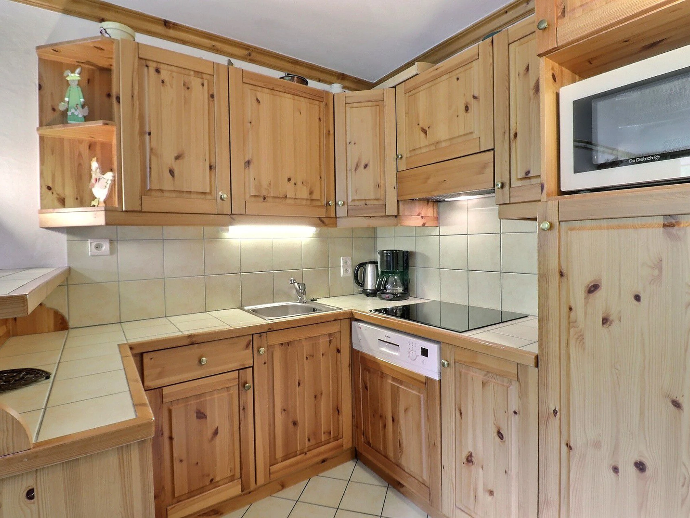 Cuisine avec bar : four combiné micro-onde, frigidaire, lave-vaisselle, 4 plaques vitro- céramiques, hotte, cafetière à filtre, grille-pain, bouilloire