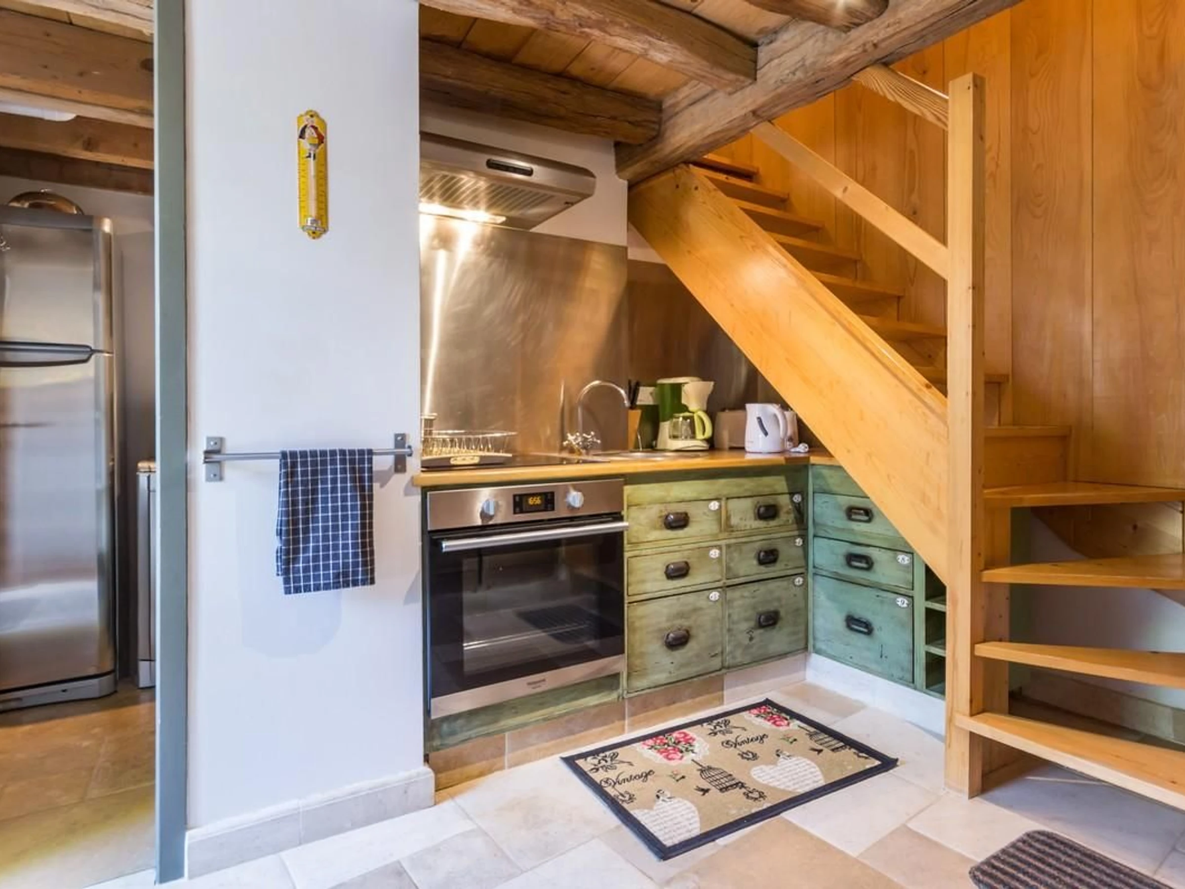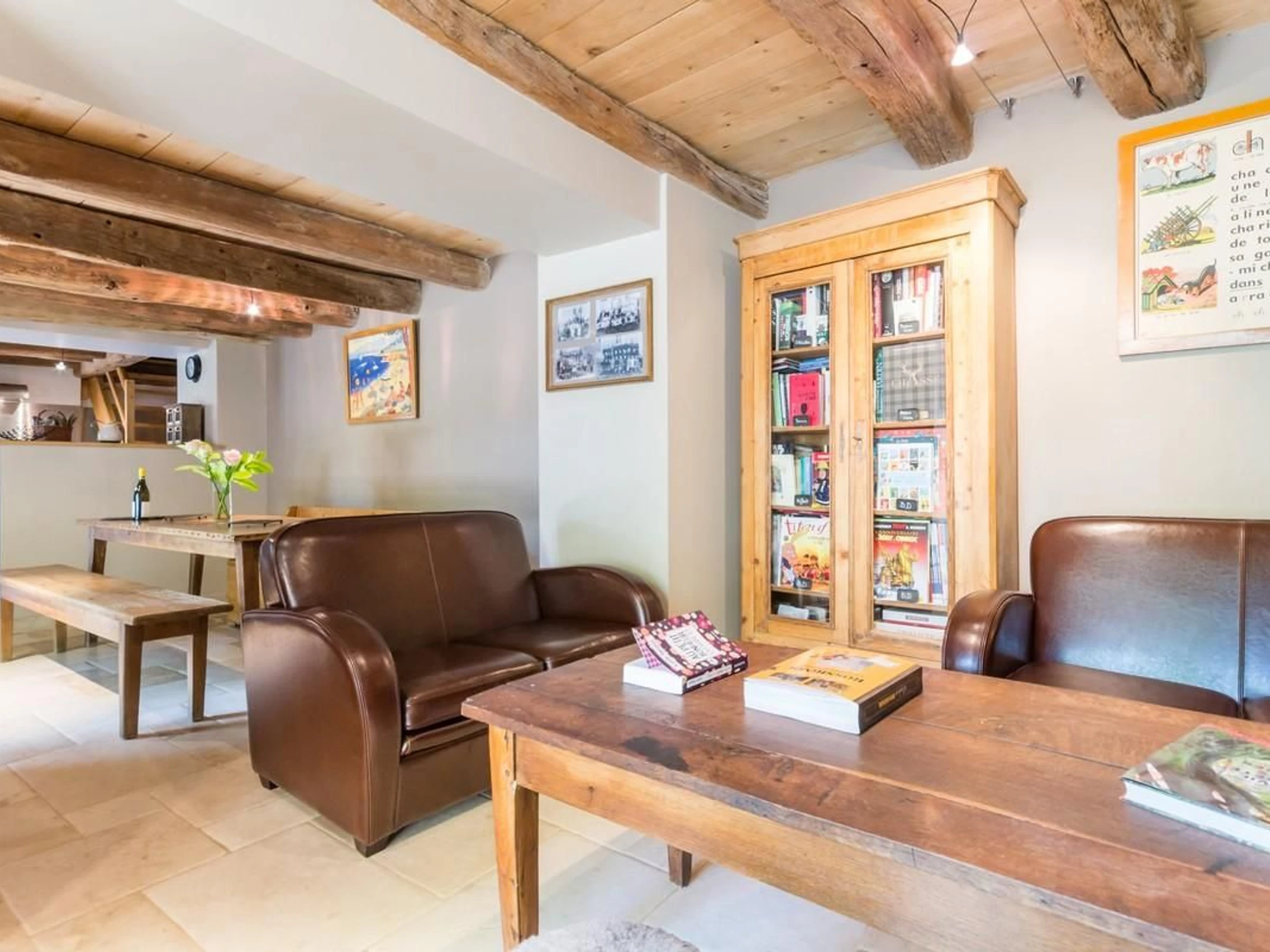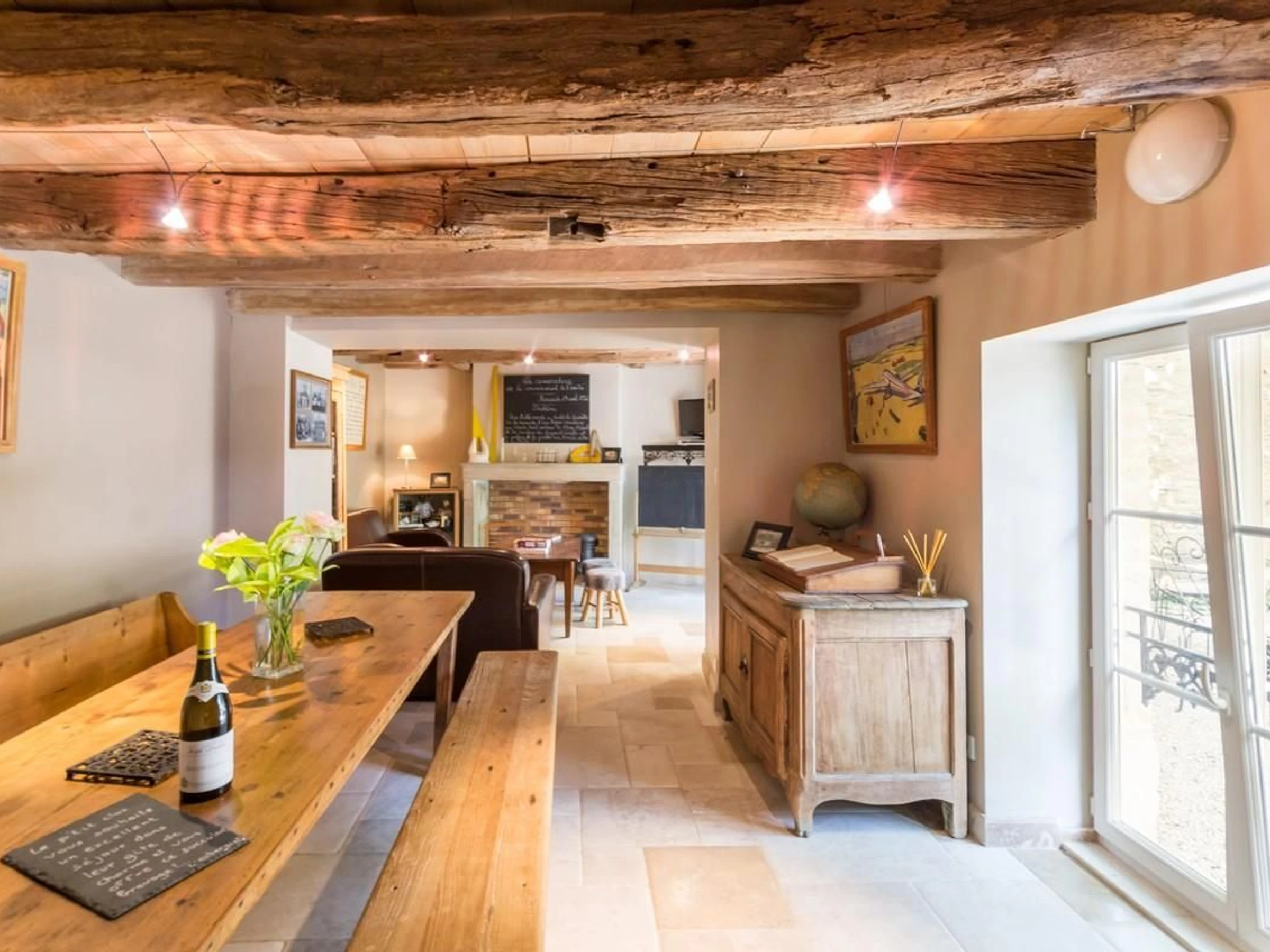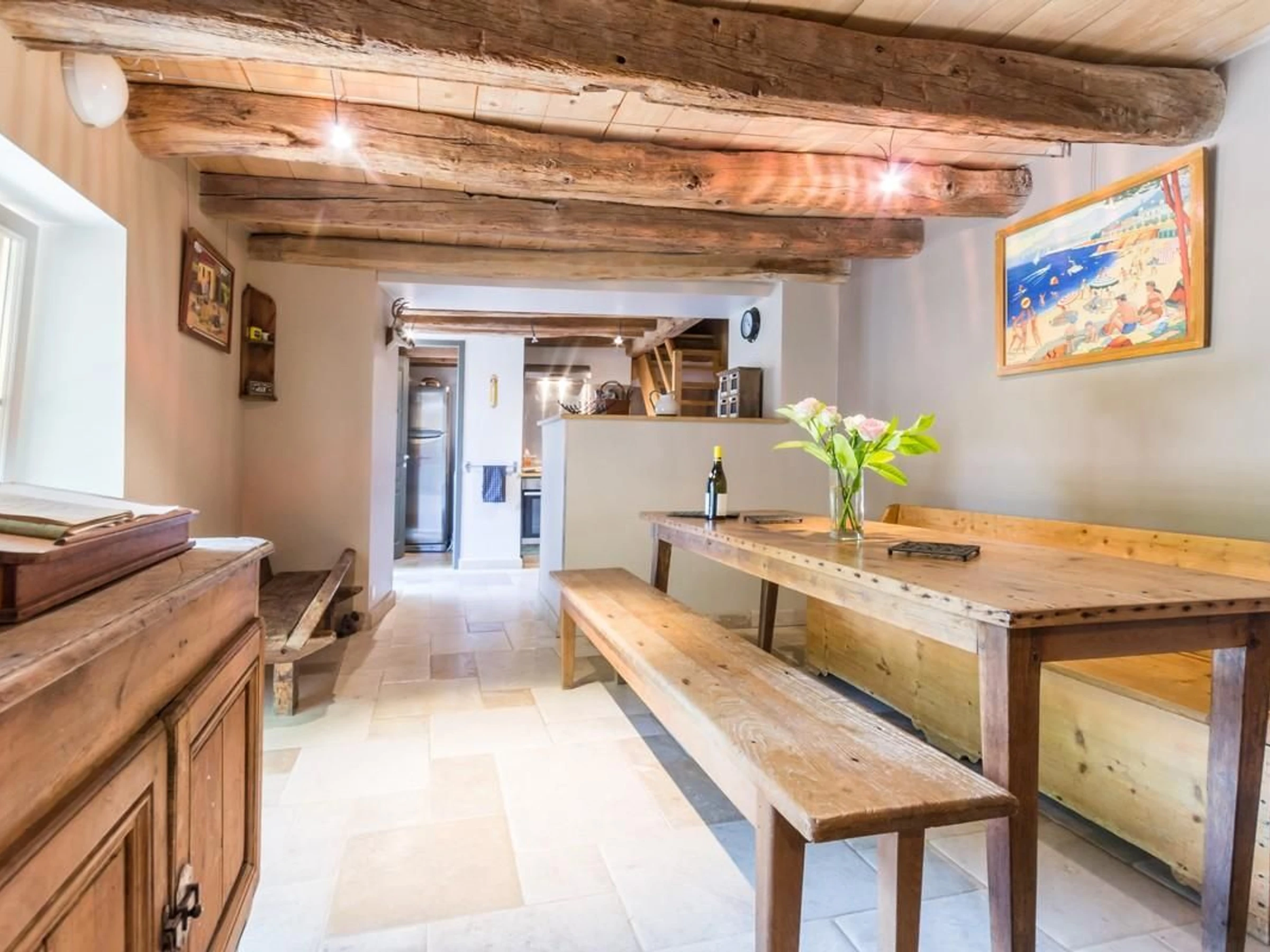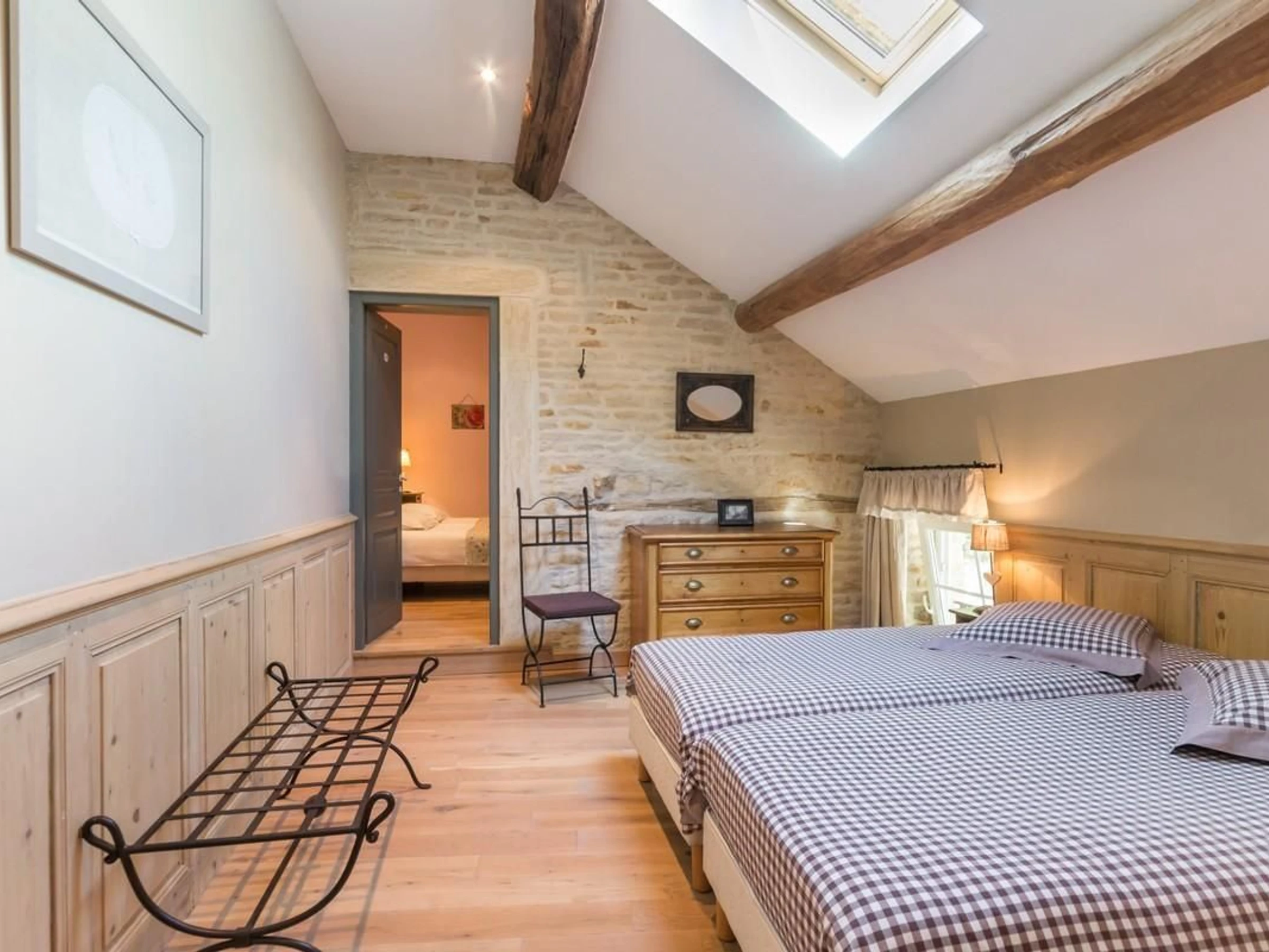 Rez-de-chaussée : cuisine ouverte sur salle à manger, salon avec poutres, dalles au sol. Cellier. 1er étage : 1 chambre avec salle d'eau privative et WC indépendant. 2 chambres communicantes avec salle d'eau et WC privatifs. Les chambres sont équipées de 2 lits de 80 cm jumelables en lits 160.