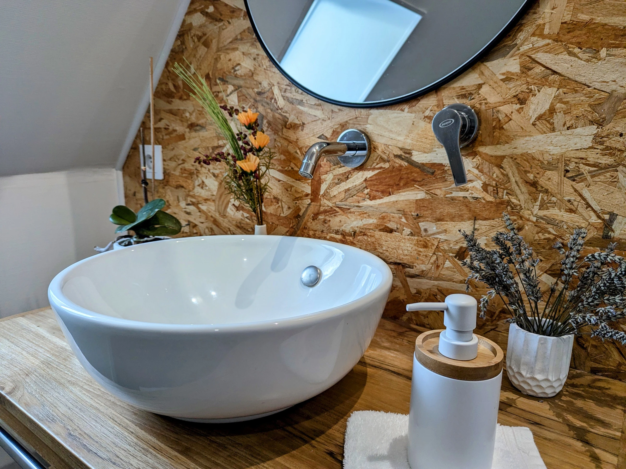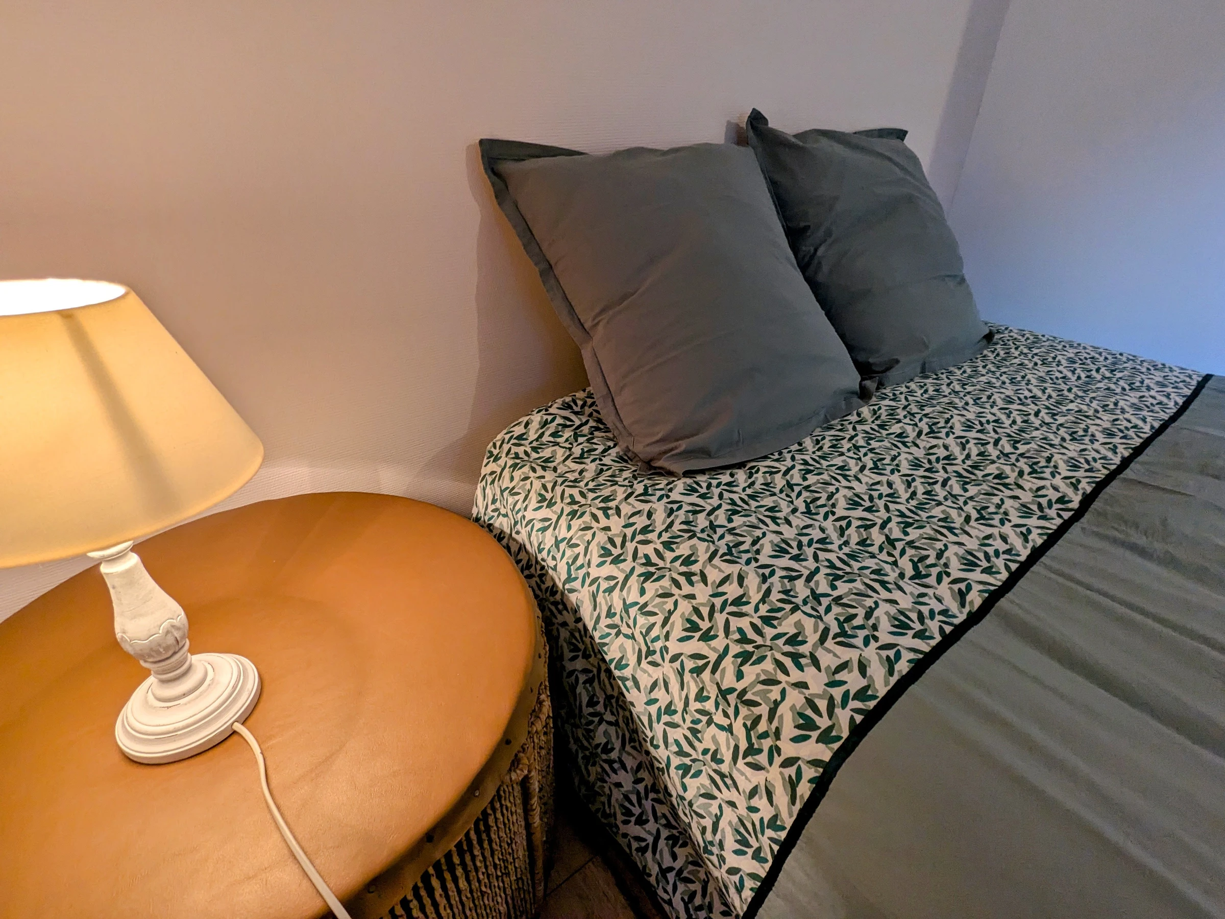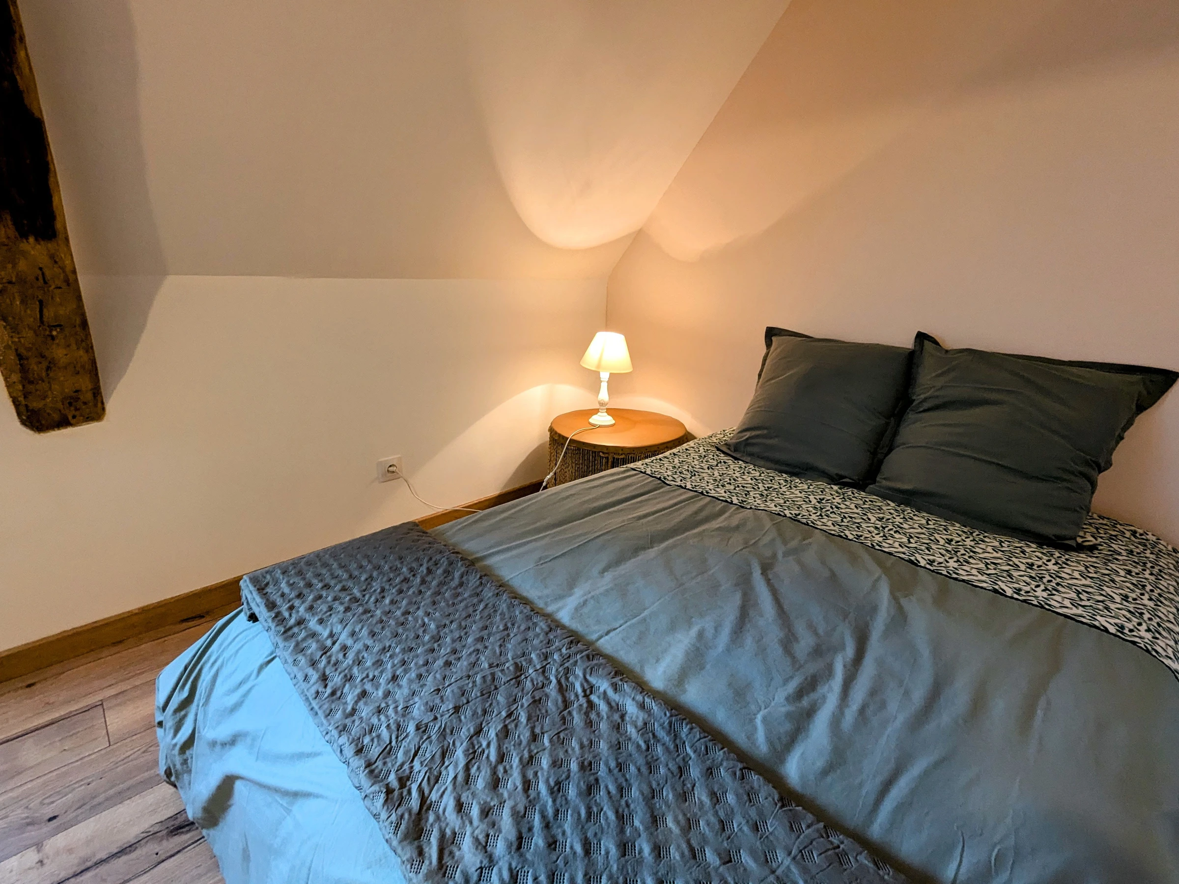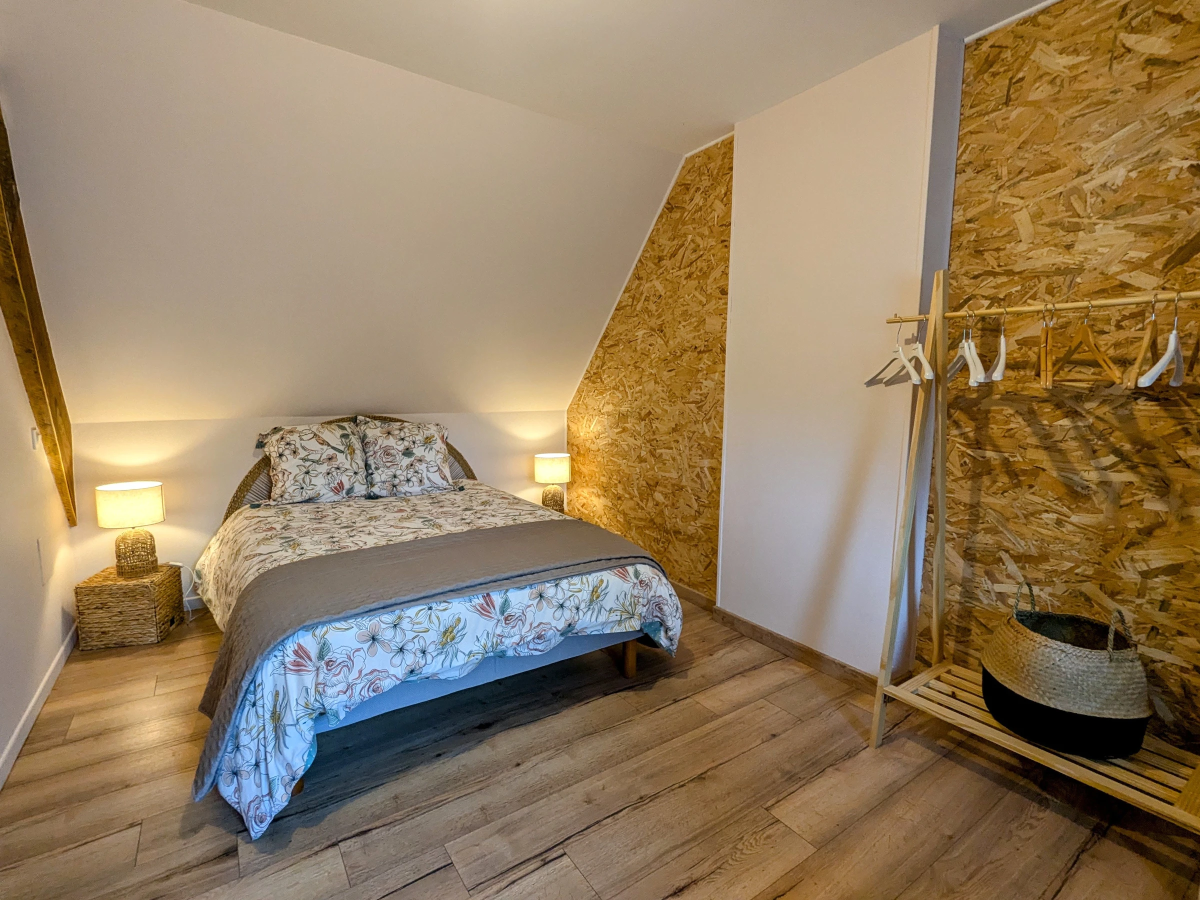 Au 1er étage une chambre avec un lit 2 personnes (140 x 190 cm) et un canapé convertible clic-clac. Une salle d'eau avec douche, wc et lavabo.