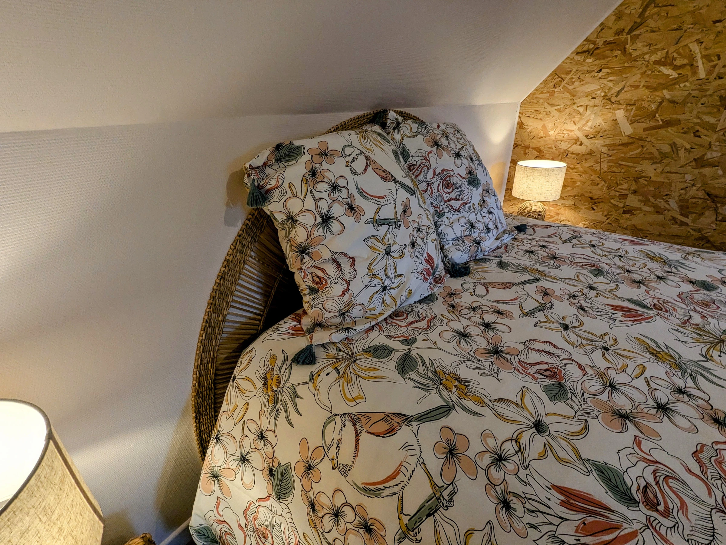 Au 1er étage une chambre avec un lit 2 personnes (140 x 190 cm) et un canapé convertible clic-clac. Une salle d'eau avec douche, wc et lavabo.