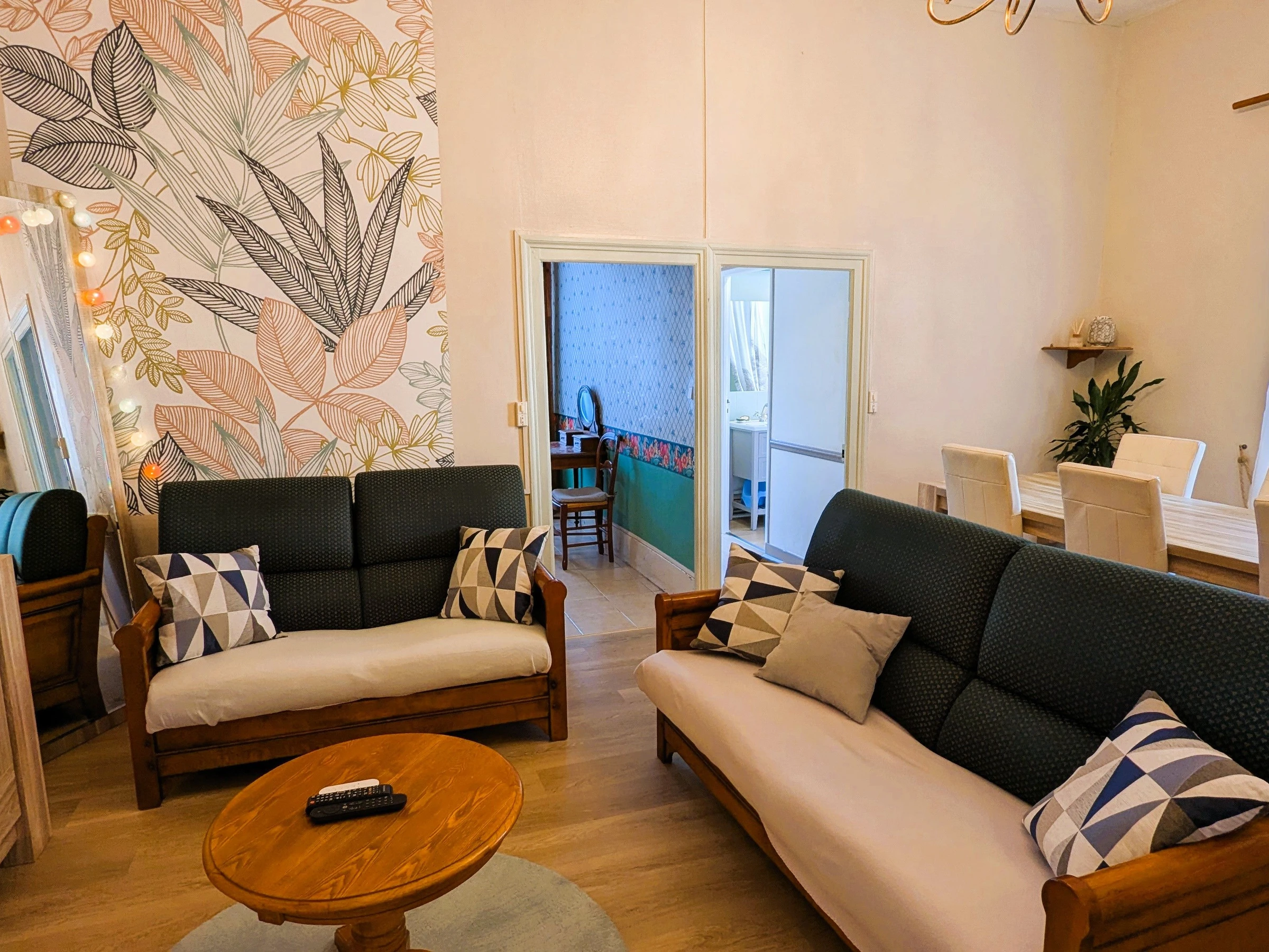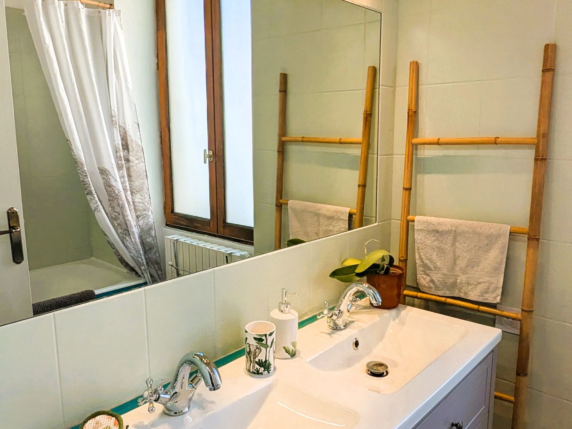1er étage : 2 chambres (1 avec 1 lit 140x190, et l'autre avec 2 lits 90x190), espace détente, wc indépendant avec lavabo.