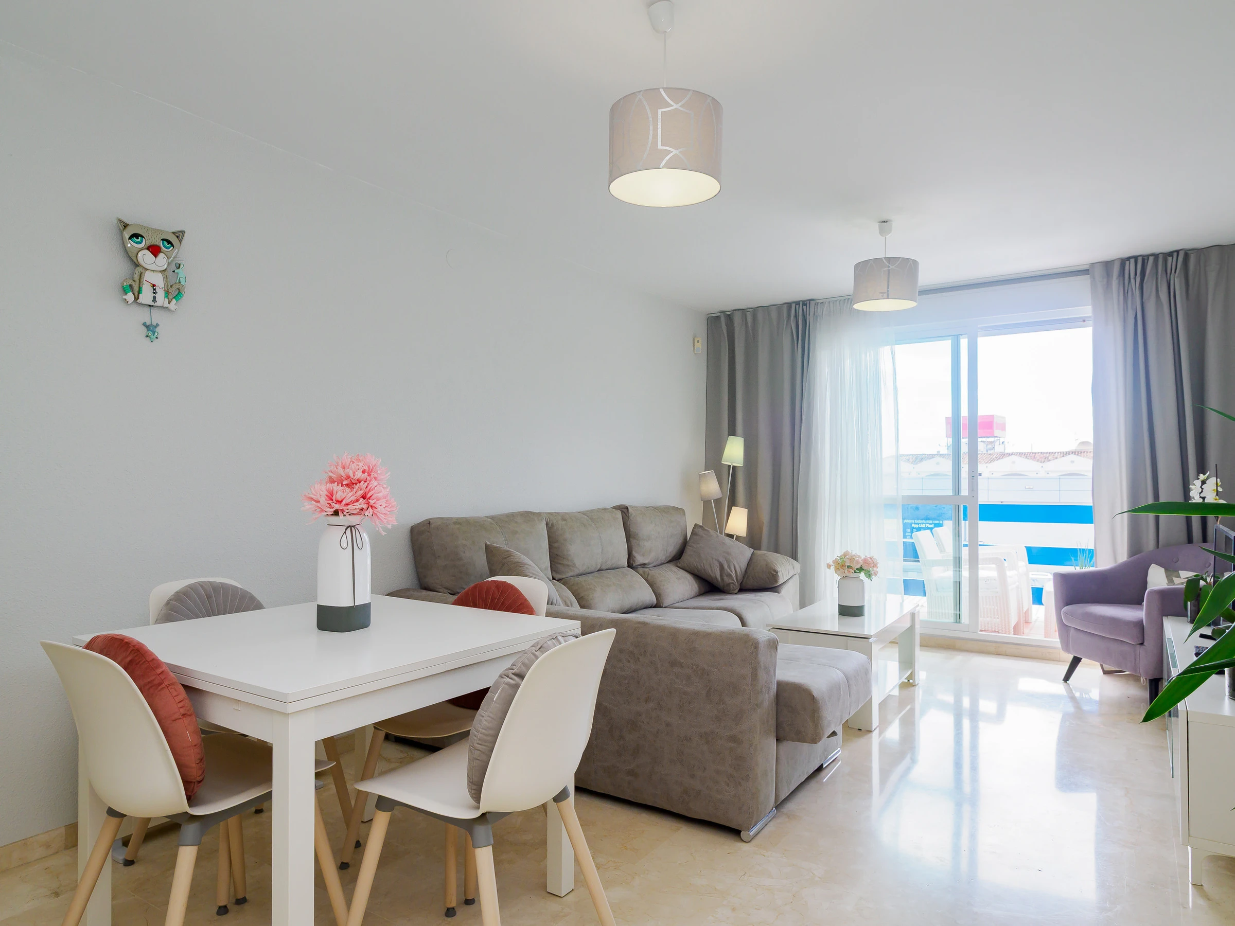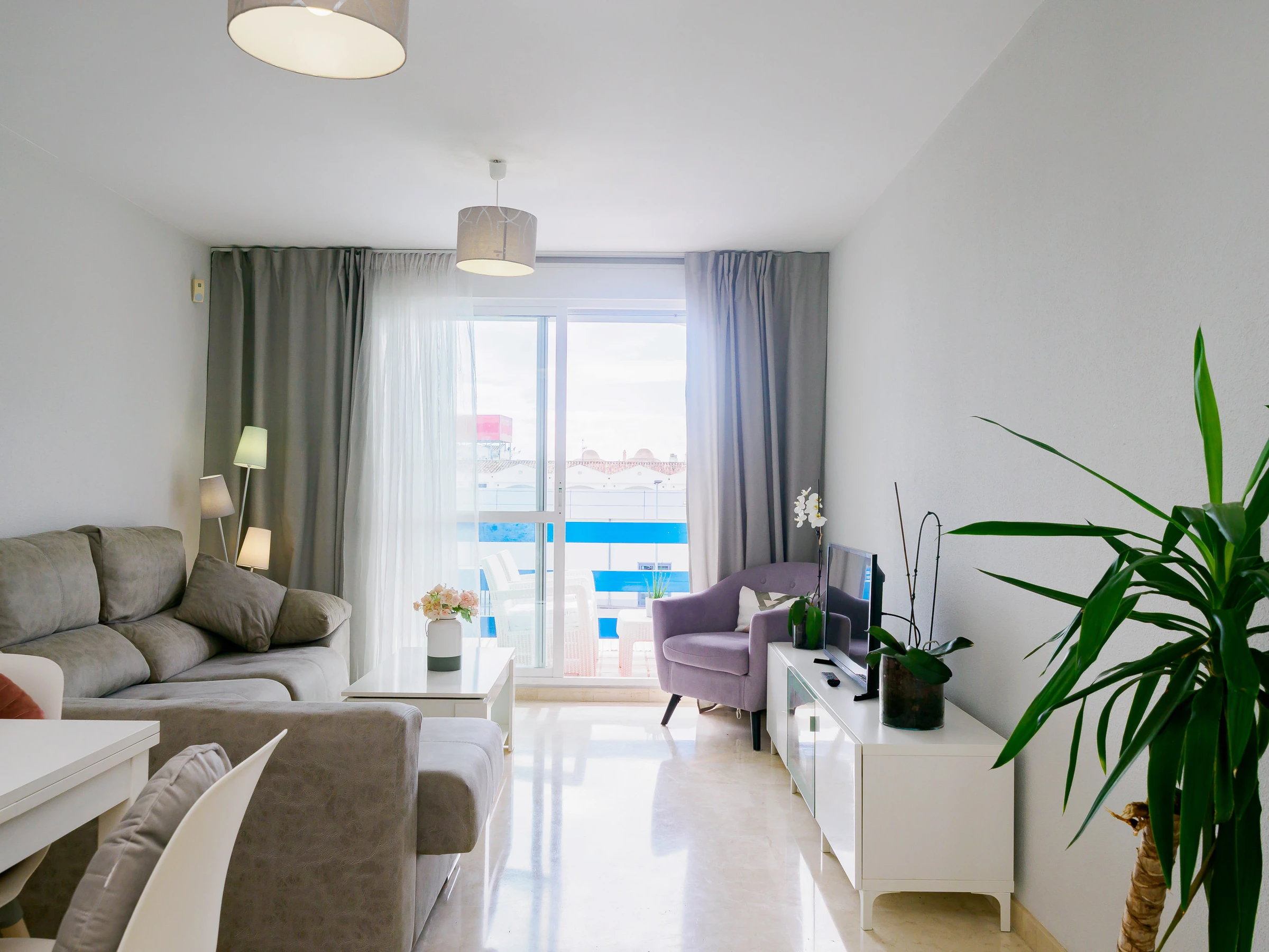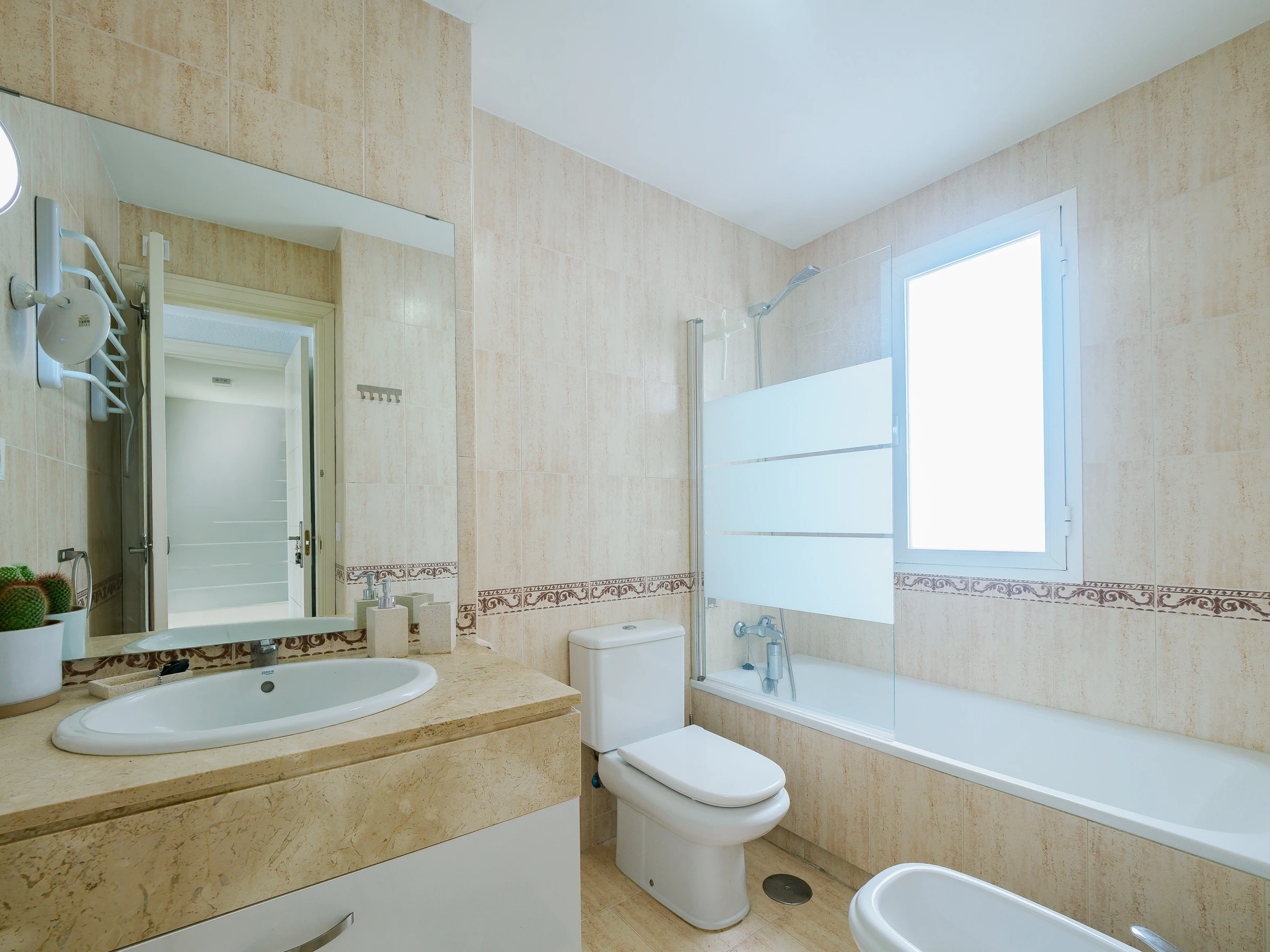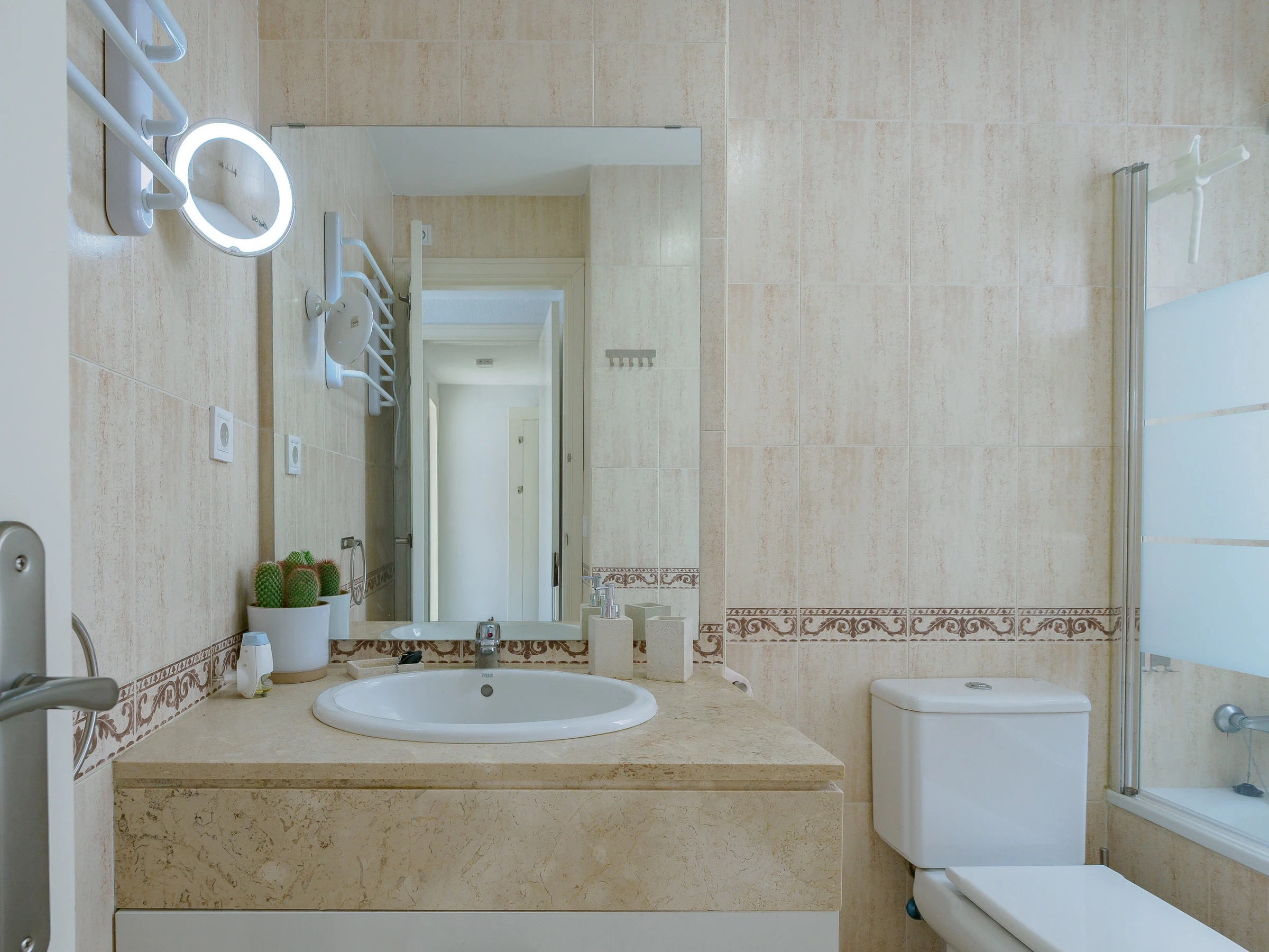 L'appartement dispose d'un grand salon-salle à manger, d'une cuisine indépendante entièrement équipée avec une zone de buanderie, et de la climatisation dans toutes les pièces pour votre confort maximal. Idéal pour 4 personnes, il comprend deux chambres : une chambre principale avec un lit de matrimonial et une salle de bain attenante, et une deuxième chambre avec deux lits individuels. De plus, il dispose de deux salles de bains complètes avec baignoire, parfaites pour les familles ou les petits groupes.