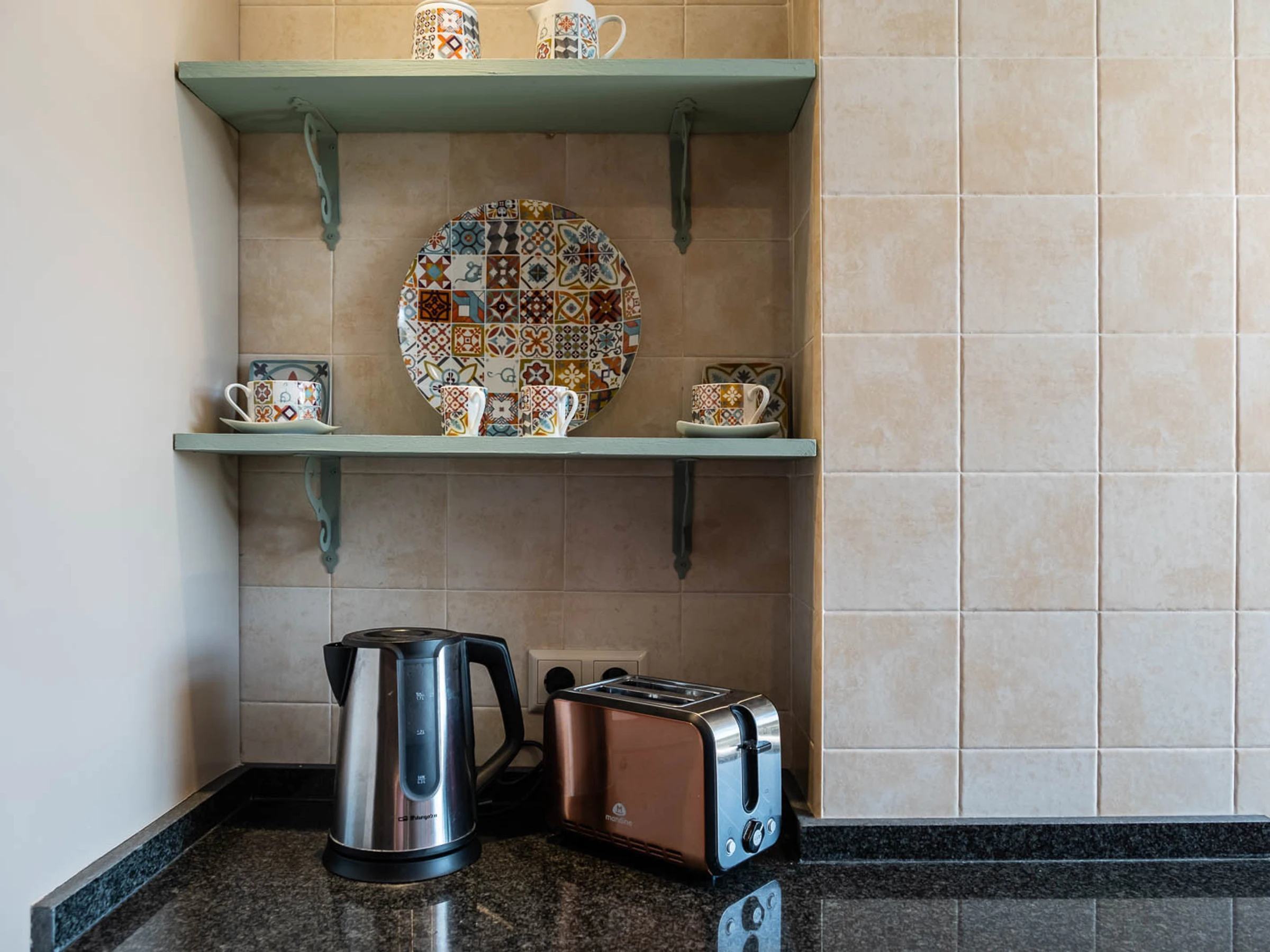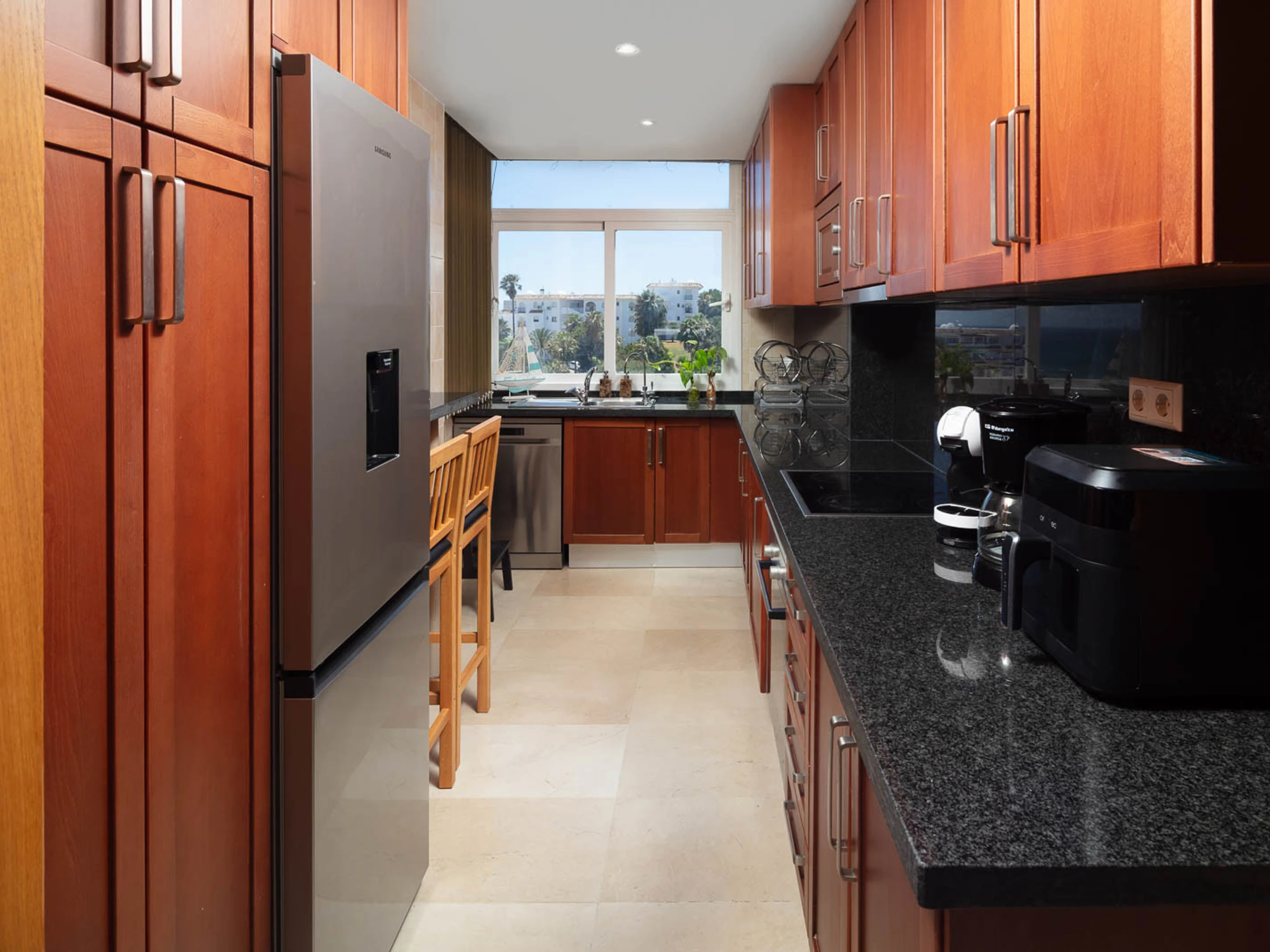 La cuisine indépendante, à vitrocéramique, est équipée avec réfrigérateur, micro-ondes, four, congélateur, lave-vaisselle, vaisselle/couverts, ustensiles/cuisine, cafetière, grille pain, bouilloire et presse-agrumes.