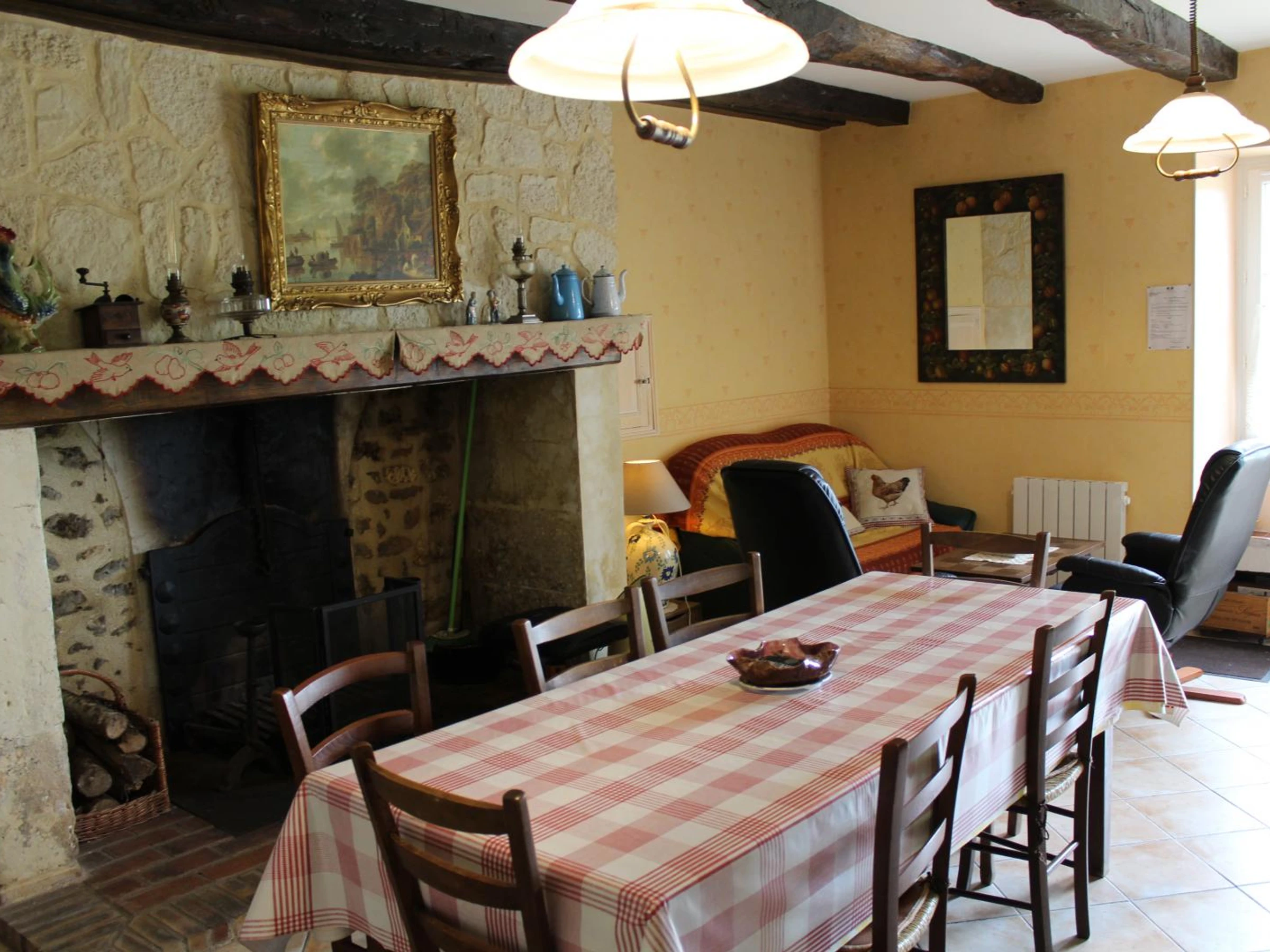 Salon de jardin, Cheminée/Poêle, Télévision, Terrain clos, Cour, Jeux extérieurs enfants, Equipement bébé, Parking, Local stock matériel, Lave-linge, Barbecue ou plancha, Micro onde, Four, Combiné congélateur, Jardin, Animaux acceptés, Location draps/linge, A proximité des prop, Maison Individuelle.