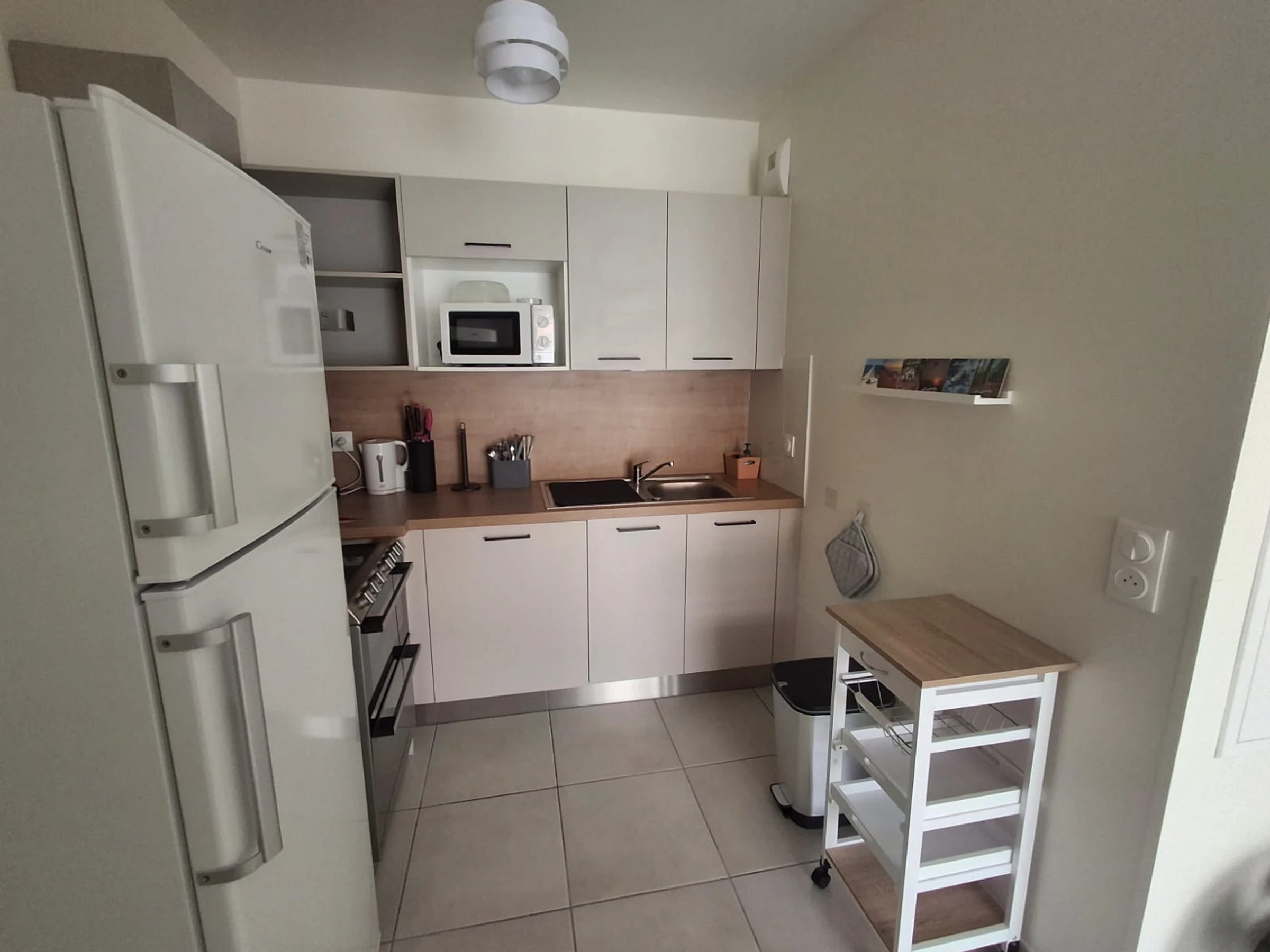 Le séjour dispose d'un canapé et d'une TV écran plat pour vos moments de détente après une journée bien remplie. Le coin cuisine est entièrement équipé avec plaque de cuisson, four, lave-vaisselle, micro-ondes, cafetière filtre, bouilloire et grille-pain, vous permettant de préparer vos repas en toute simplicité.
