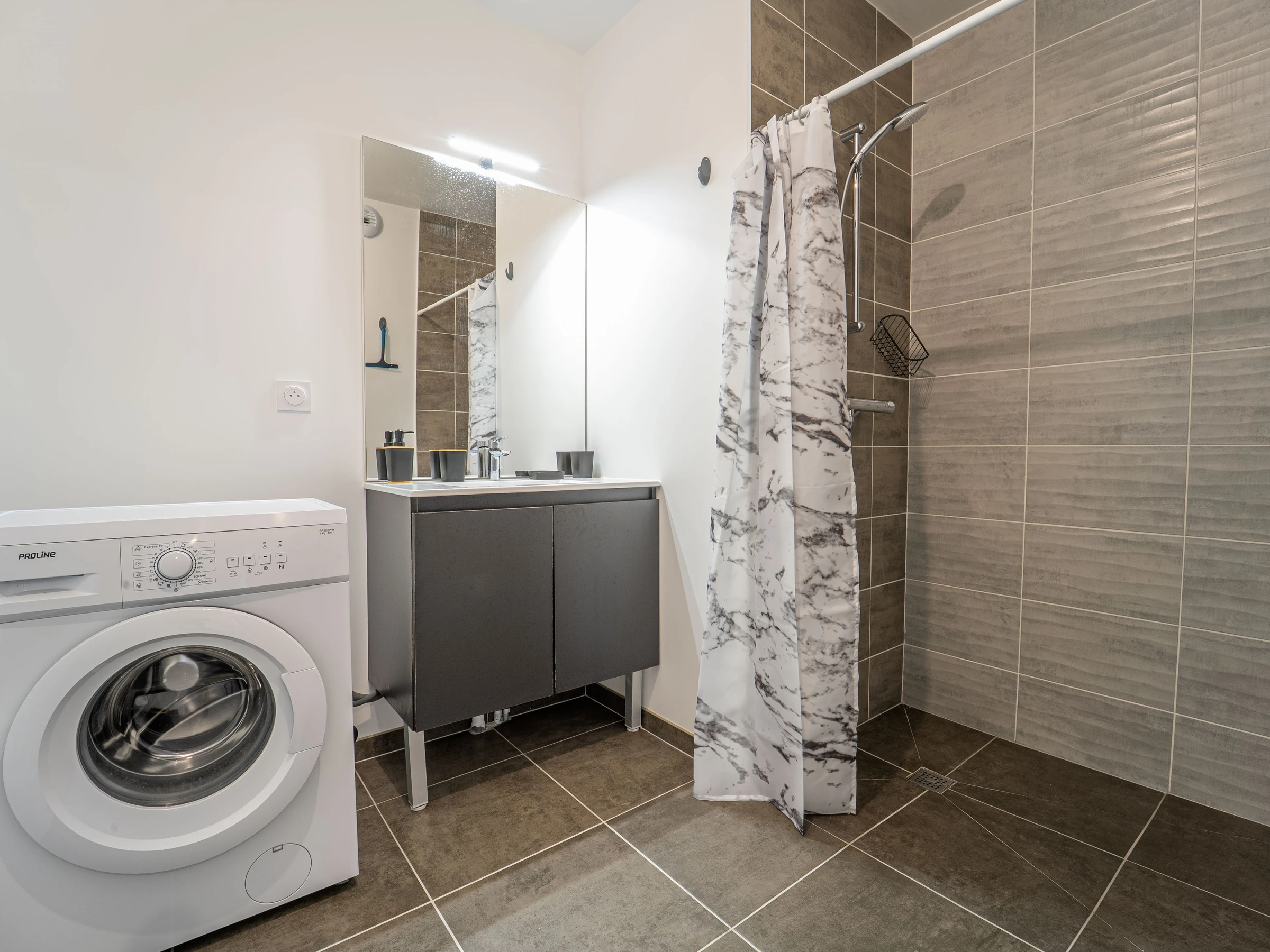 La salle d’eau est équipée d’une douche, d’une vasque, d’un lave-linge et d’un sèche-cheveux. Les toilettes sont séparées pour plus de confort. À l’extérieur, un jardinet privé avec salon de jardin et barbecue vous attend pour profiter pleinement de vos repas en plein air.