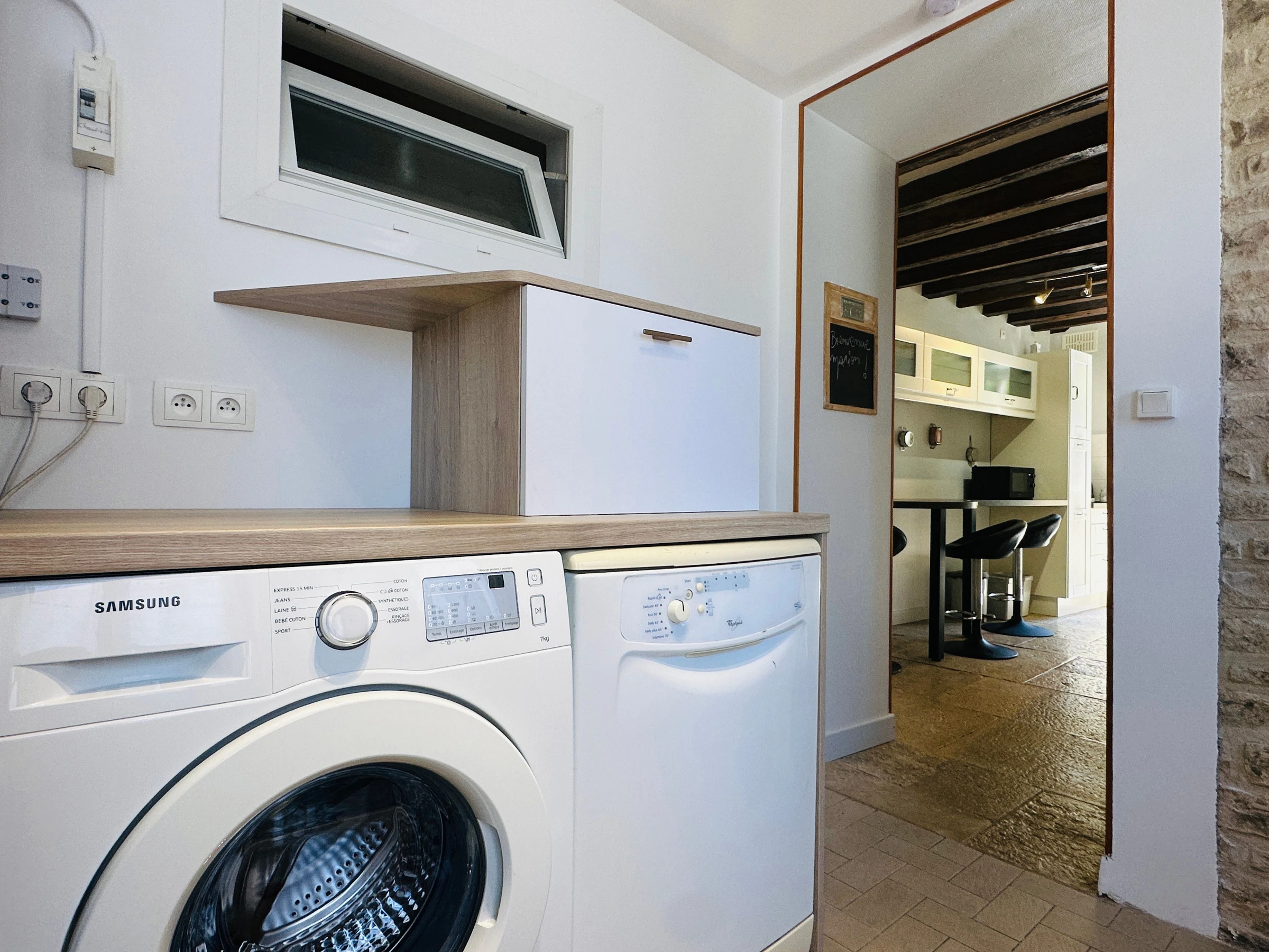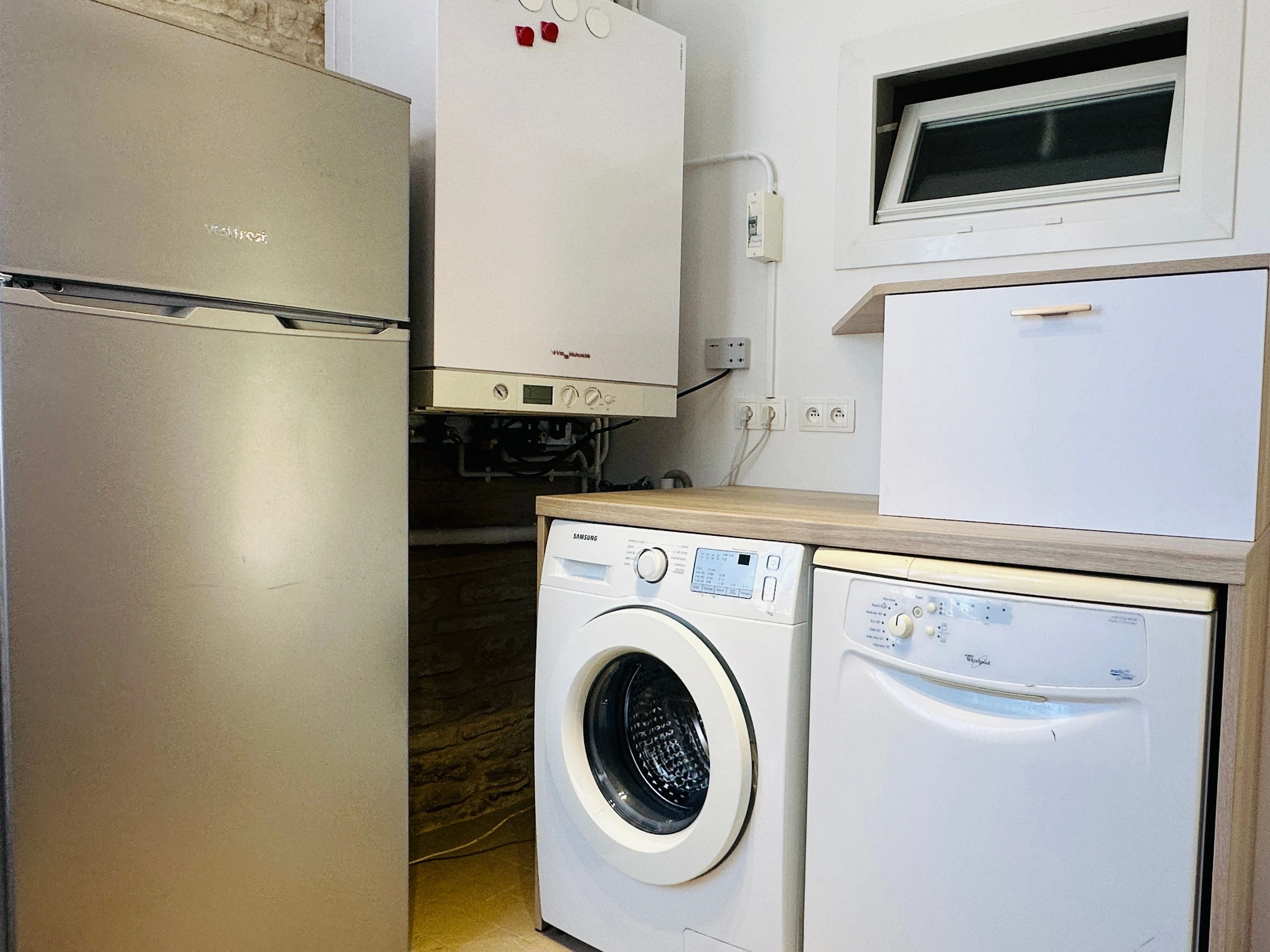 La cuisine est indépendante et entièrement équipée (réfrigérateur-congélateur, four, micro-ondes, plaques de cuisson, petit électroménager). Machine à café à grains. Dans la prolongement, un espace buanderie avec lave-linge et lave-vaisselle est accessible.