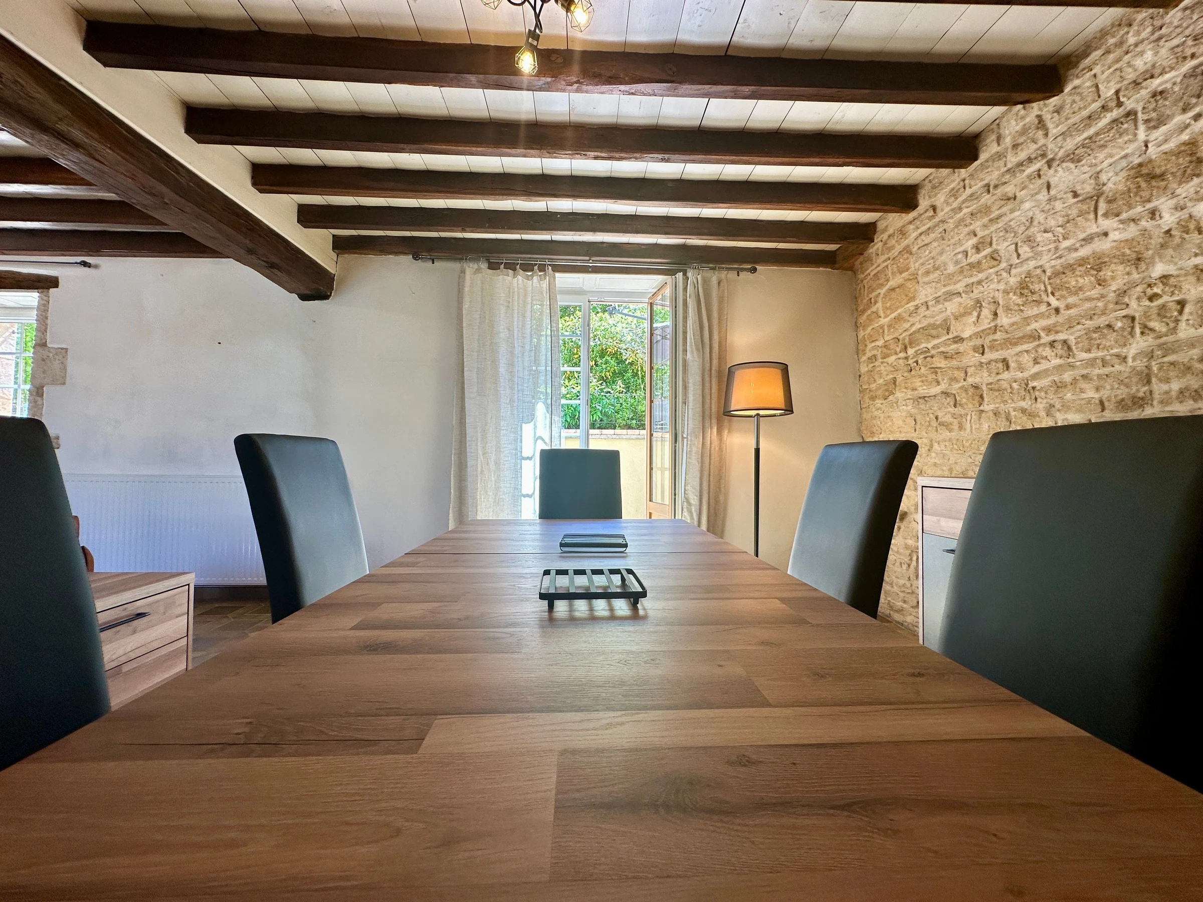 Au rez-de-chaussée, vous trouverez un grand séjour avec coin salon et espace repas. La cheminée est le promesse de belles soirées cocooning au coin du feu.