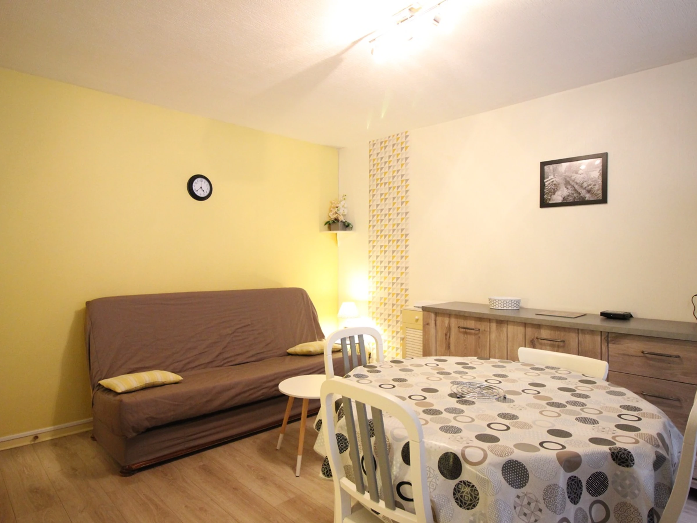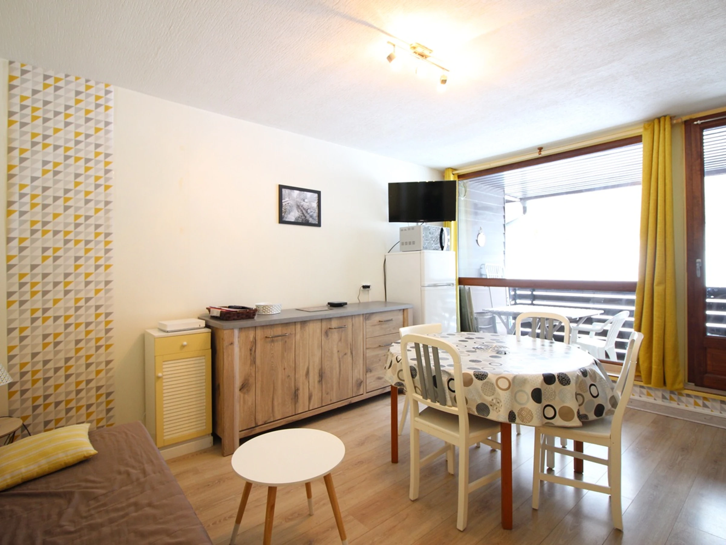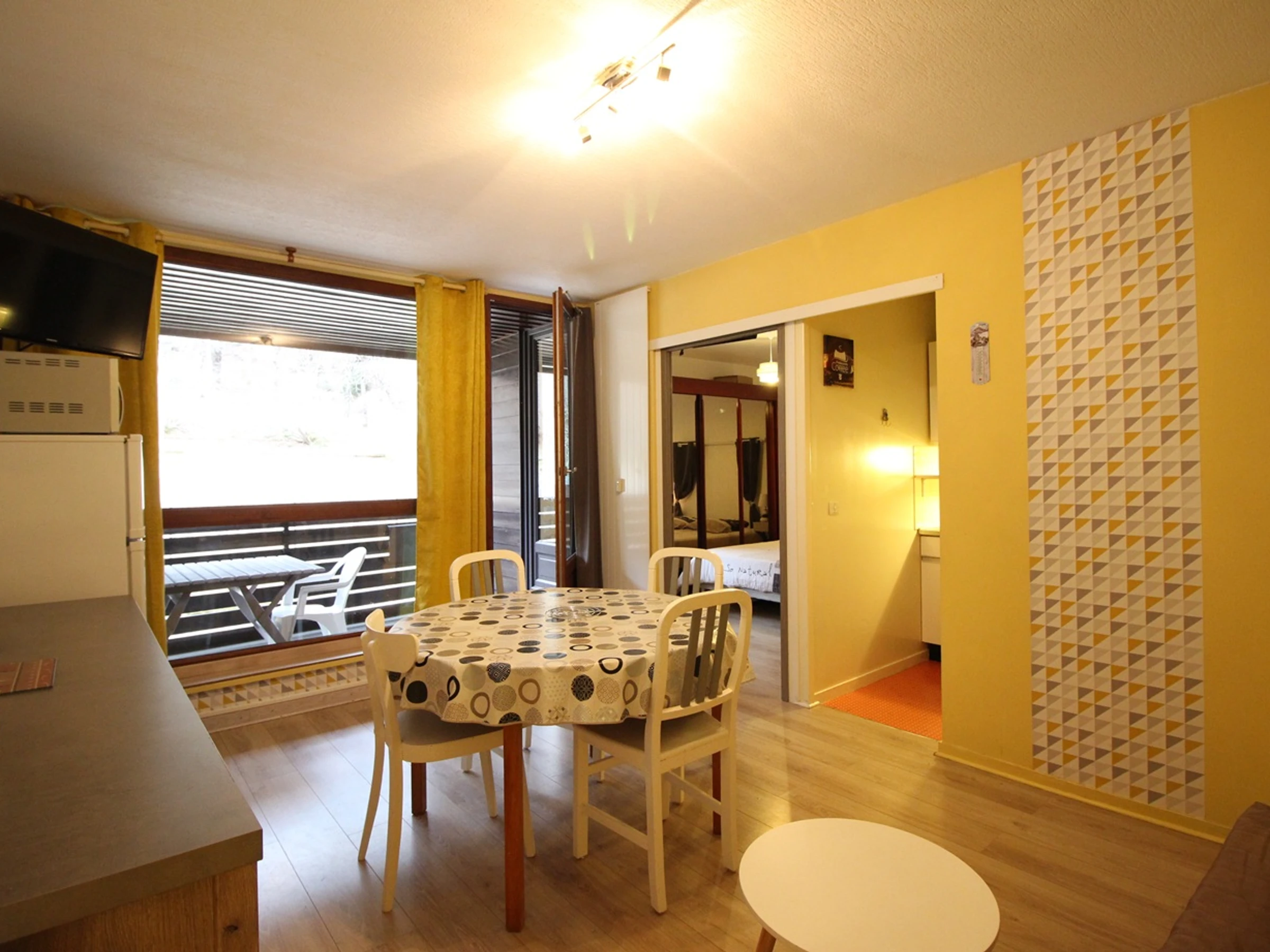 Il se compose d'une pièce à vivre équipée d'un clic-clac 2 personnes ouvrant sur balcon,