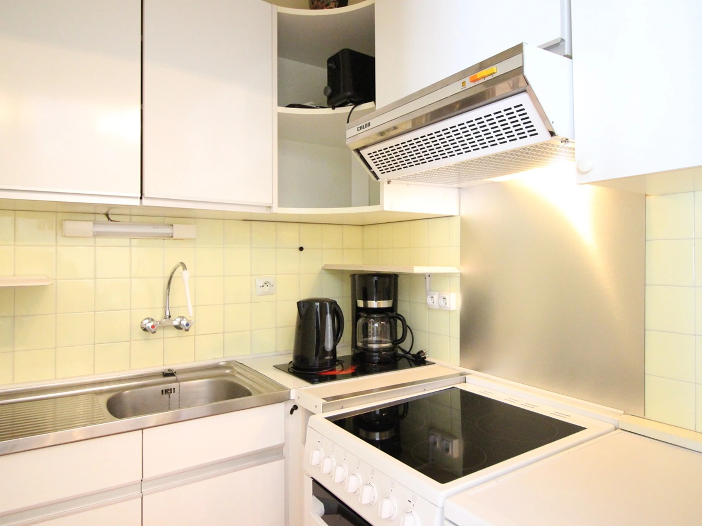 Une kitchenette équipée avec plaque vitrocéramique 4 zones, hotte, four, réfrigérateur grand modèle avec congélateur, lave vaisselle, micro-ondes...