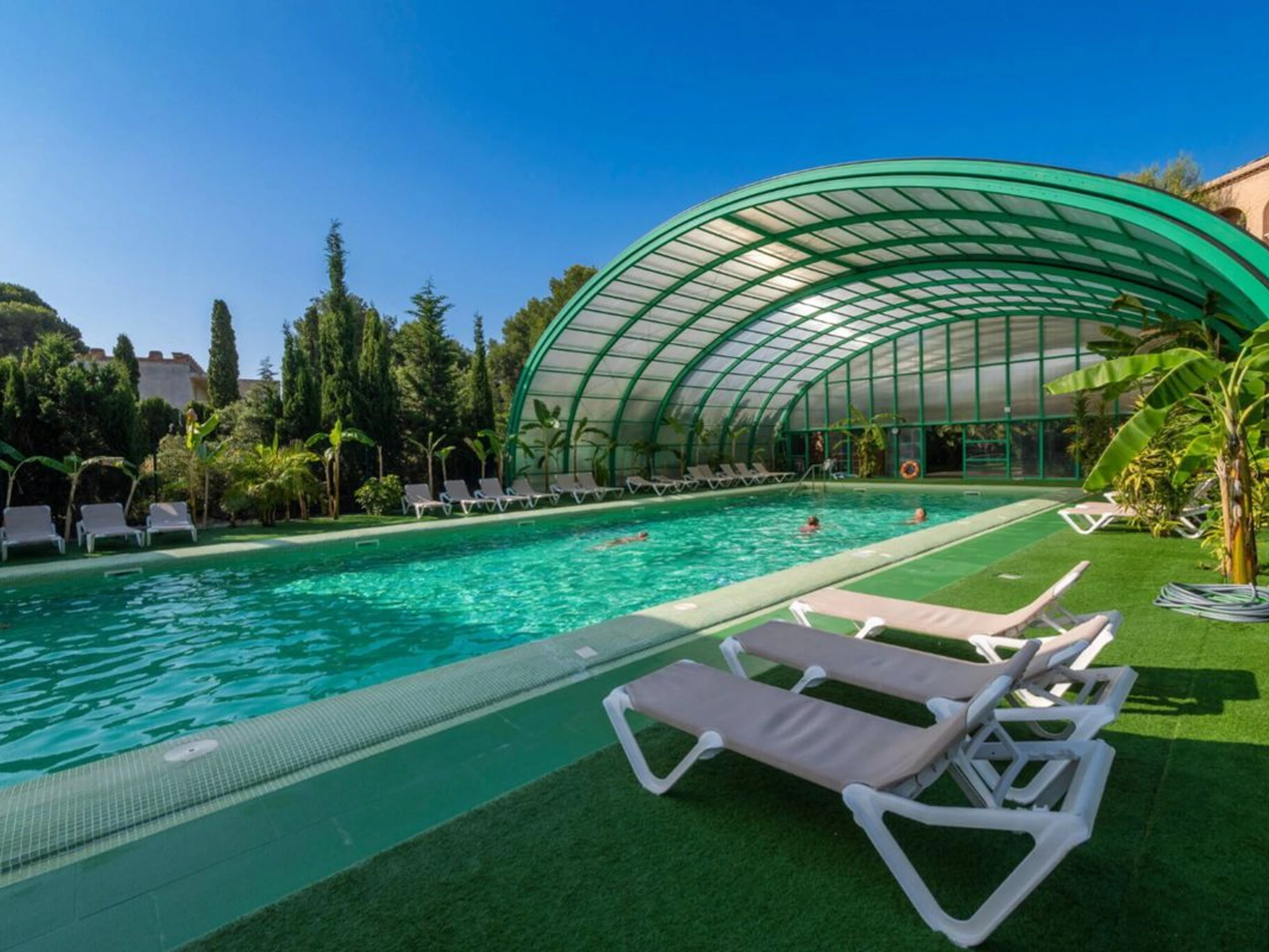 - Piscine intu00e9rieure avec toit ru00e9tractable. rnIMPORTANT: Interdit de porter de caleu00e7on, de short ou tout autre type de maillot de bain, uniquement slip autorisu00e9.rnOuvert toute la saison,