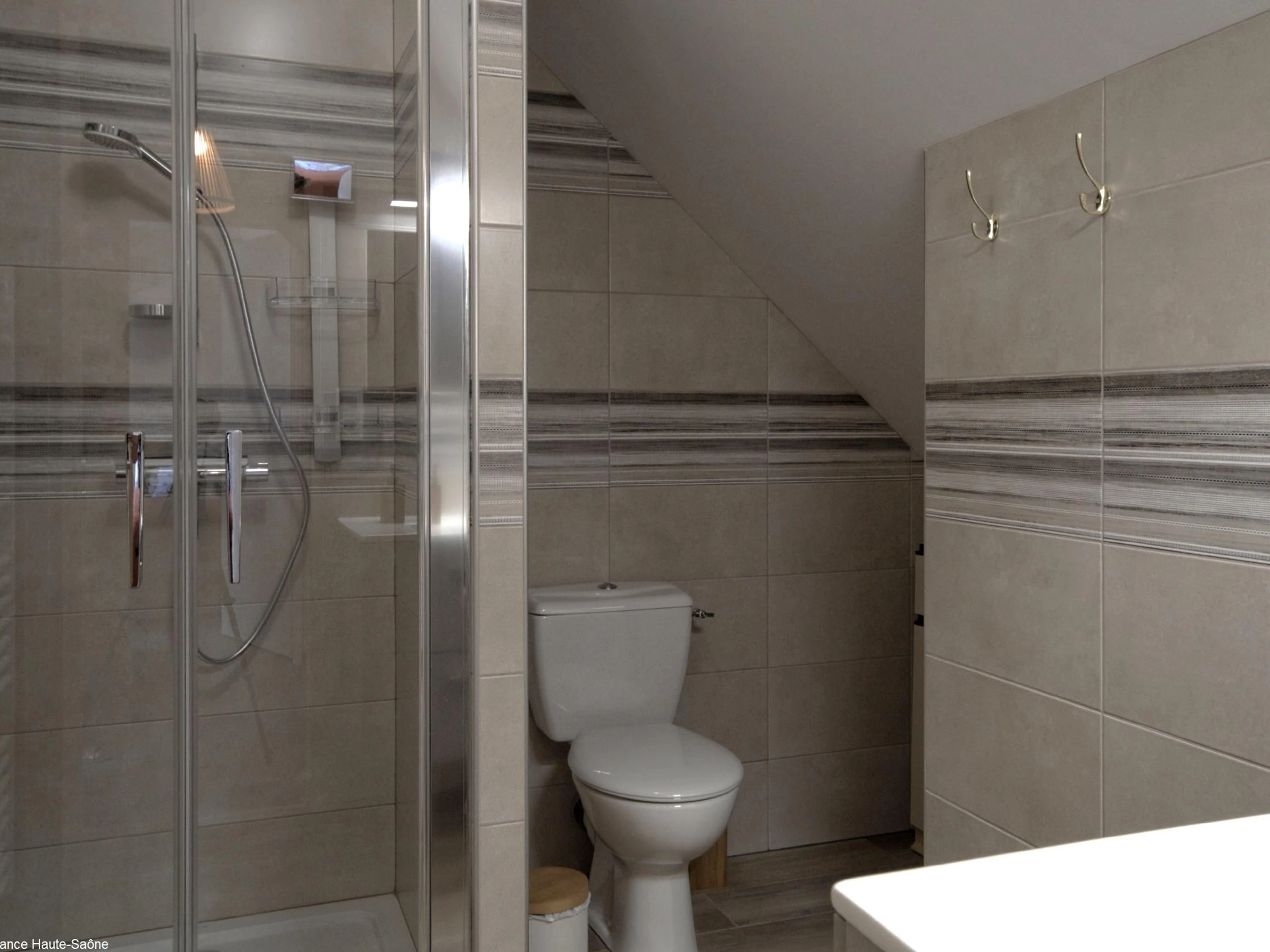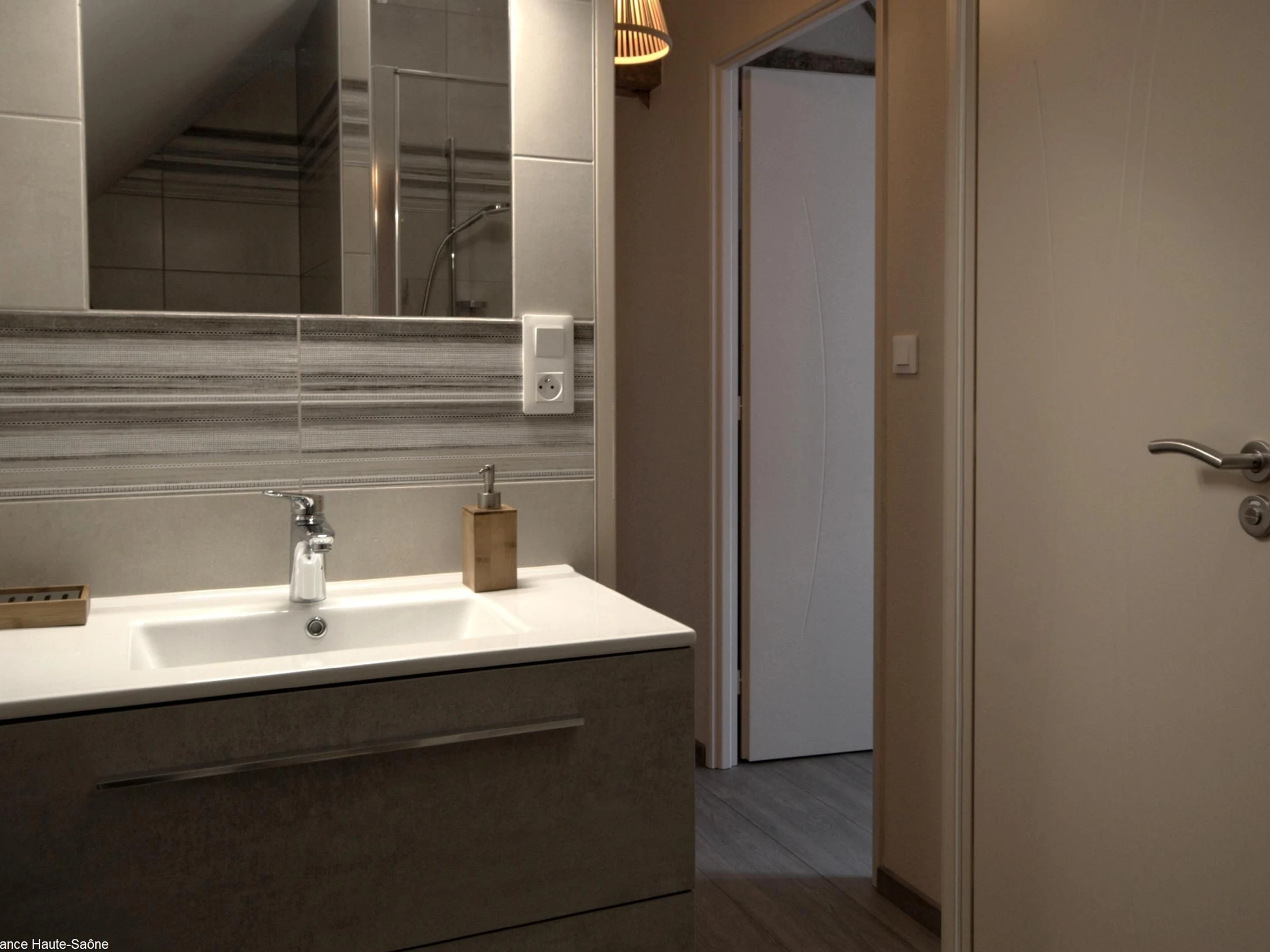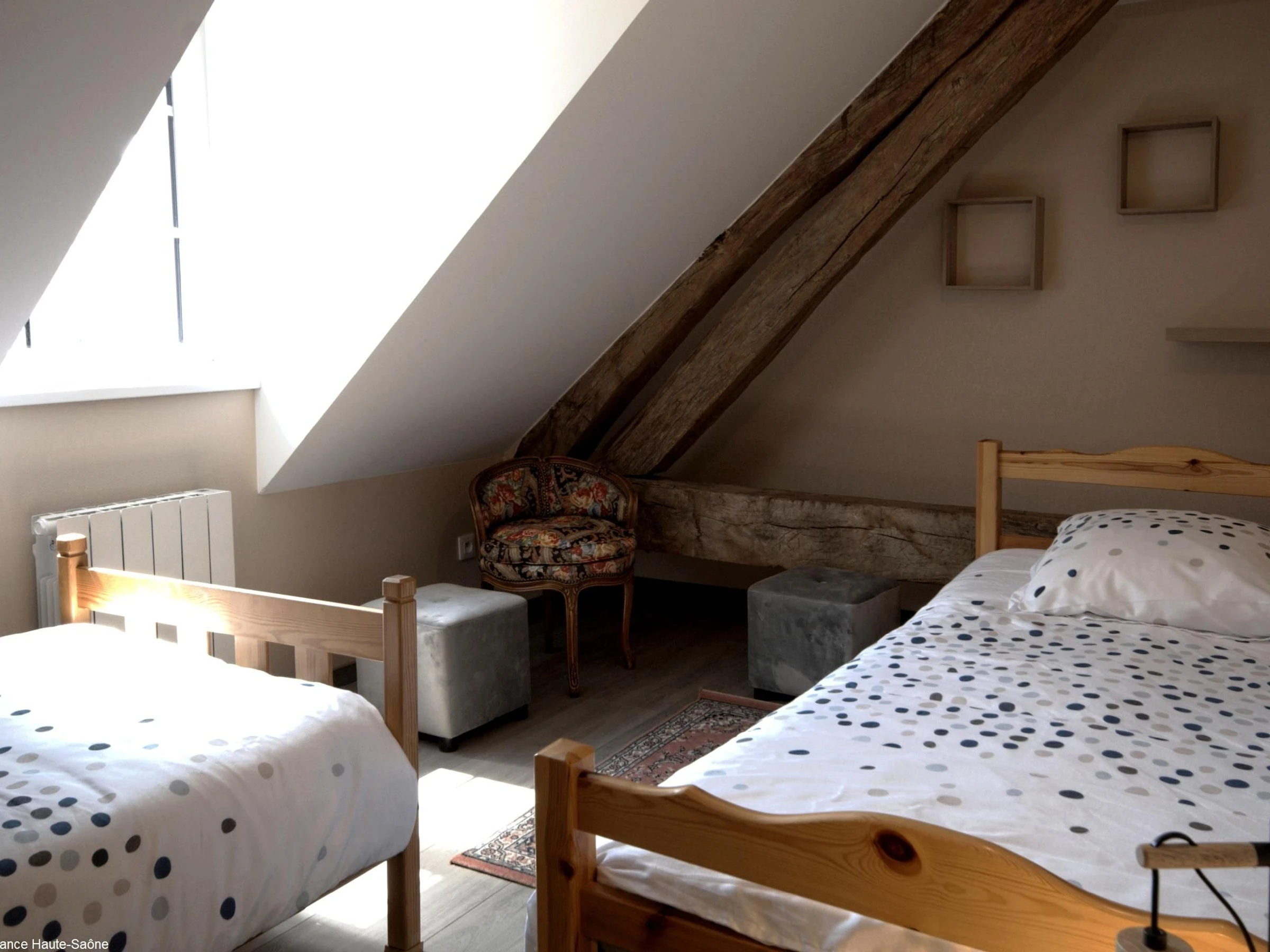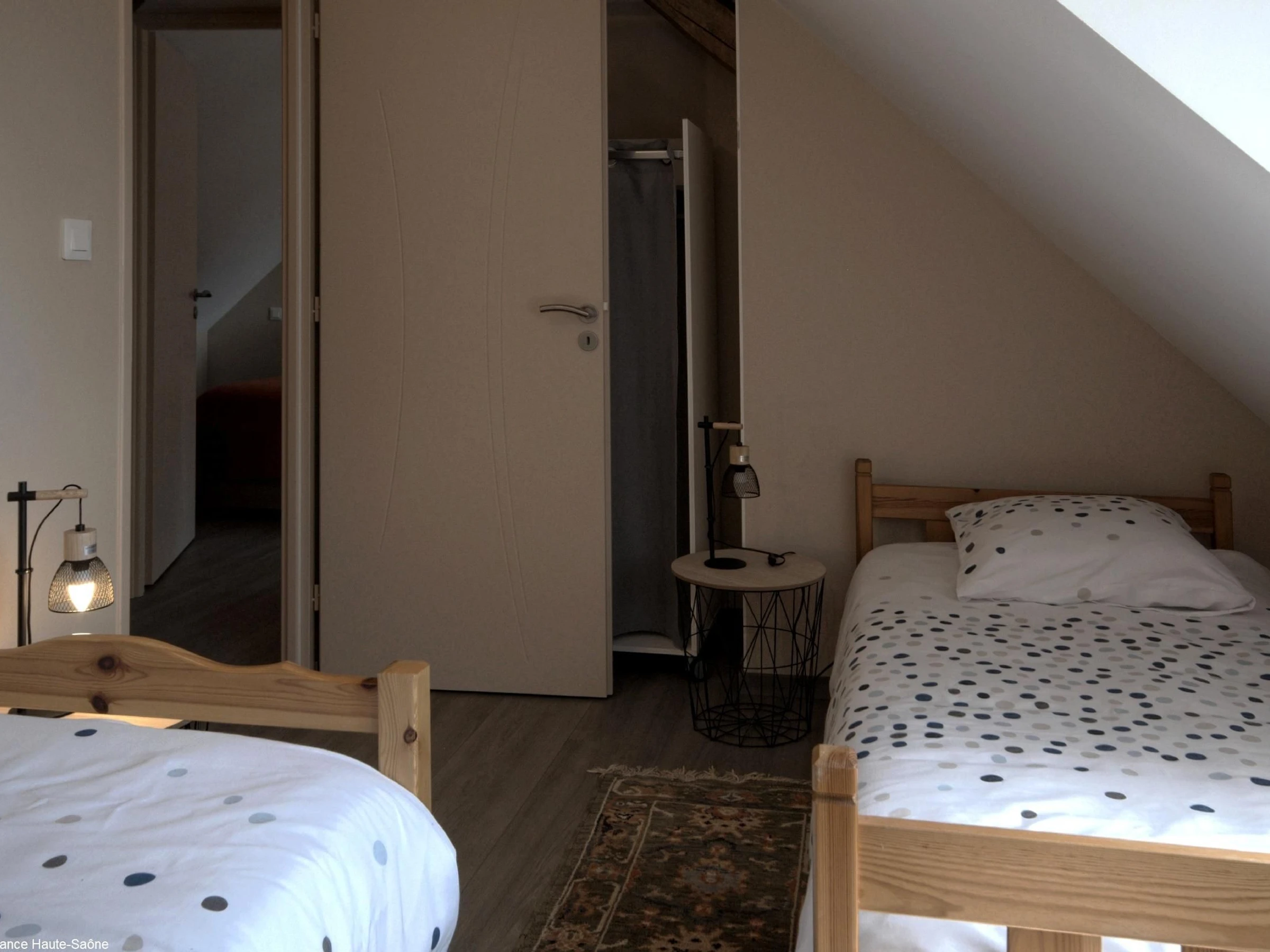 - À l'étage : une chambre avec deux lits de 90 cm, une chambre avec un lit de 160 cm, salle d'eau moderne avec WC. Un lit parapluie et une chaise haute à disposition. Petits animaux acceptés sur demande auprès des propriétaires.