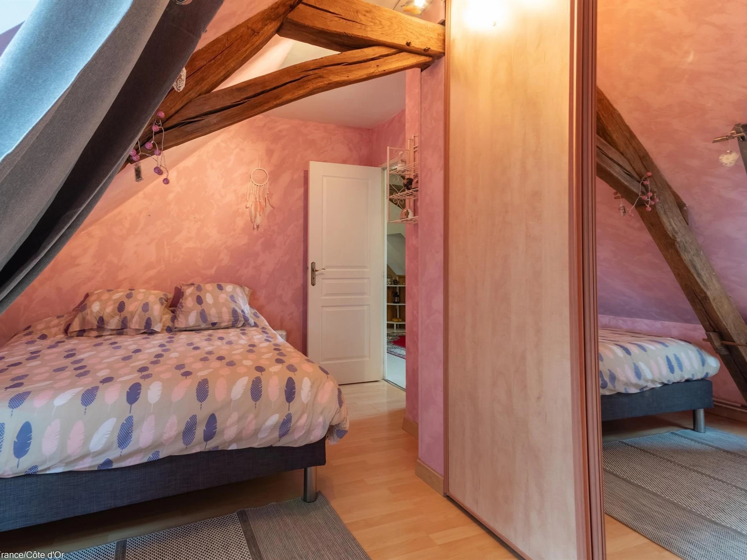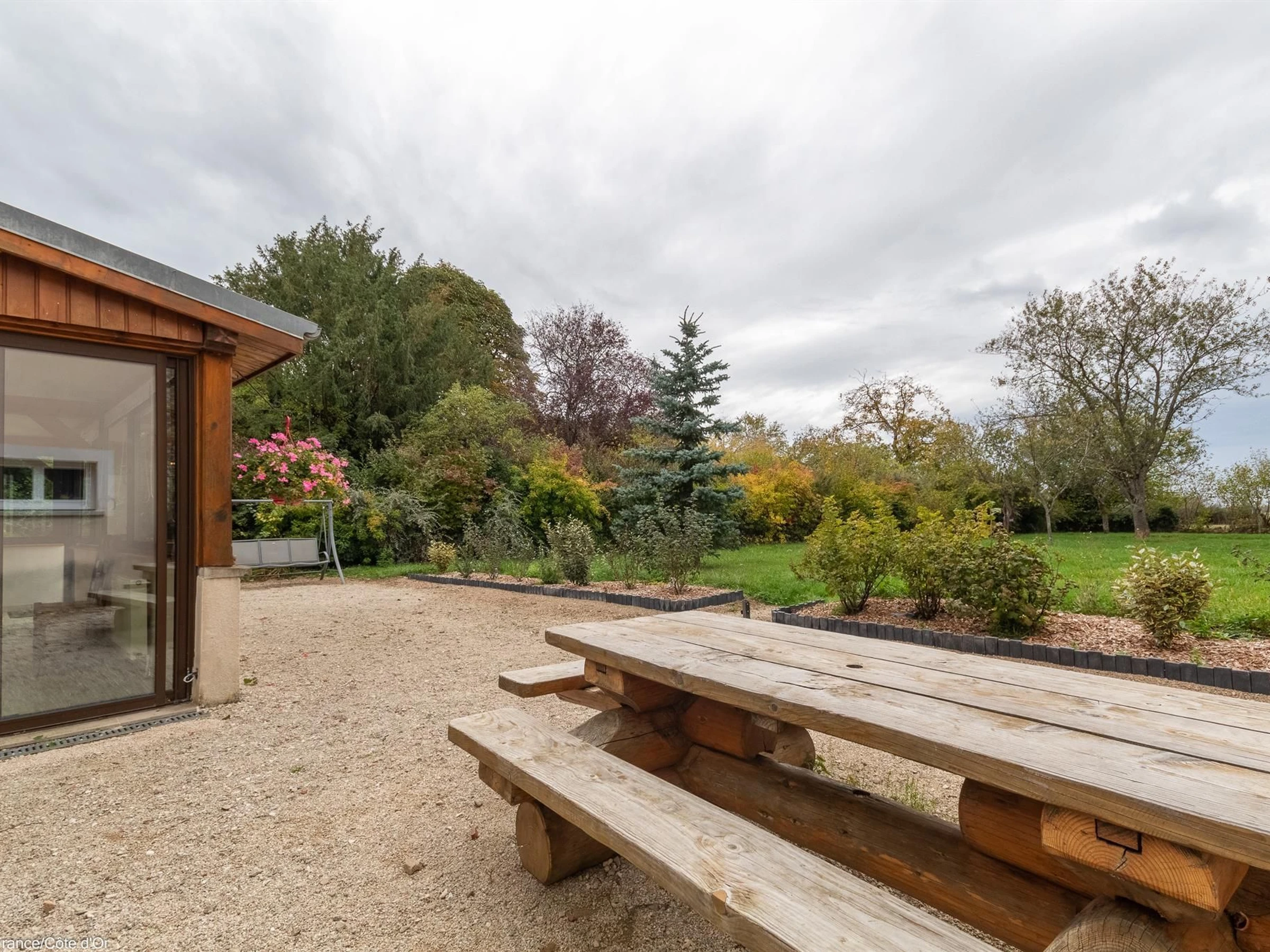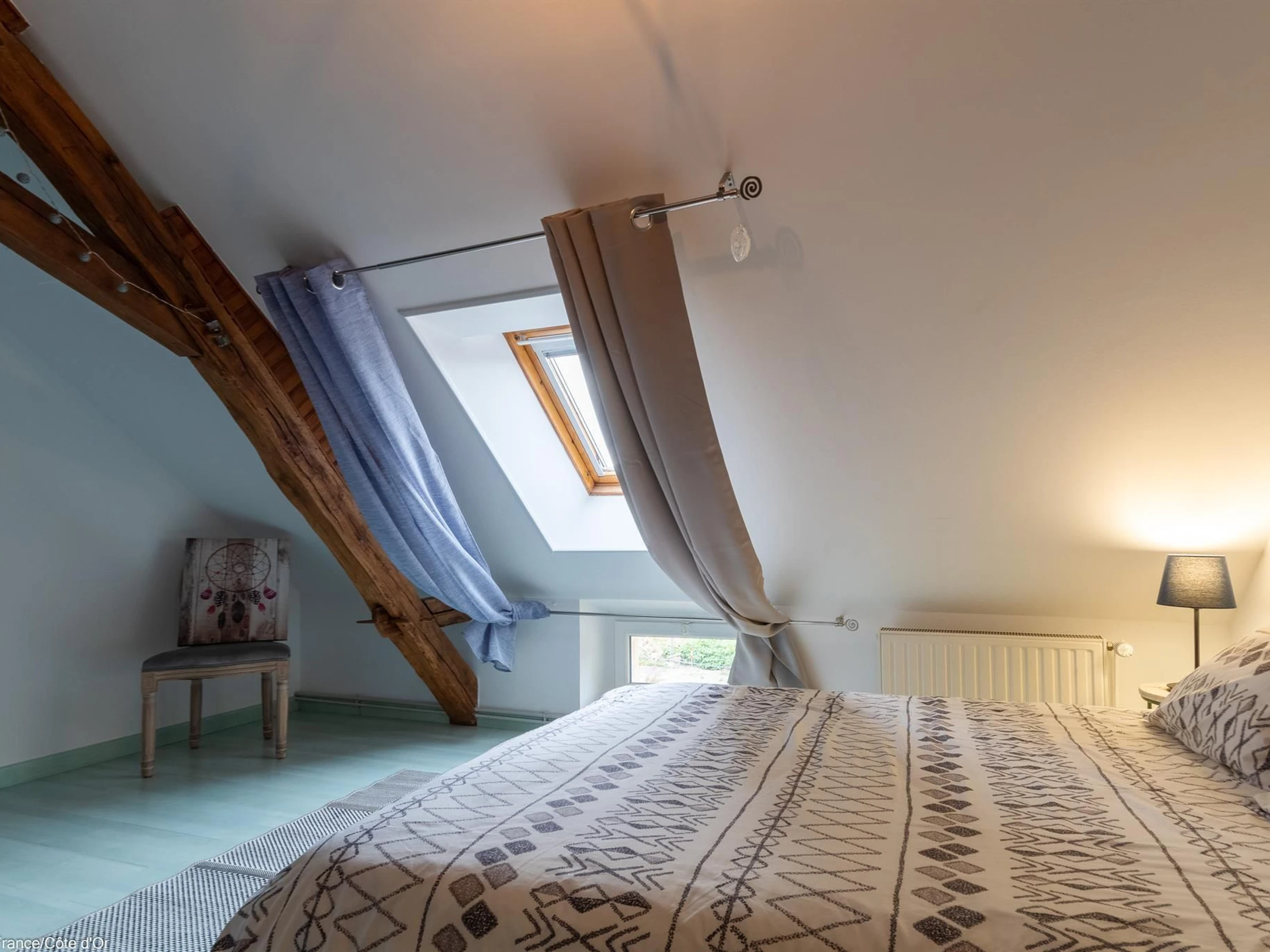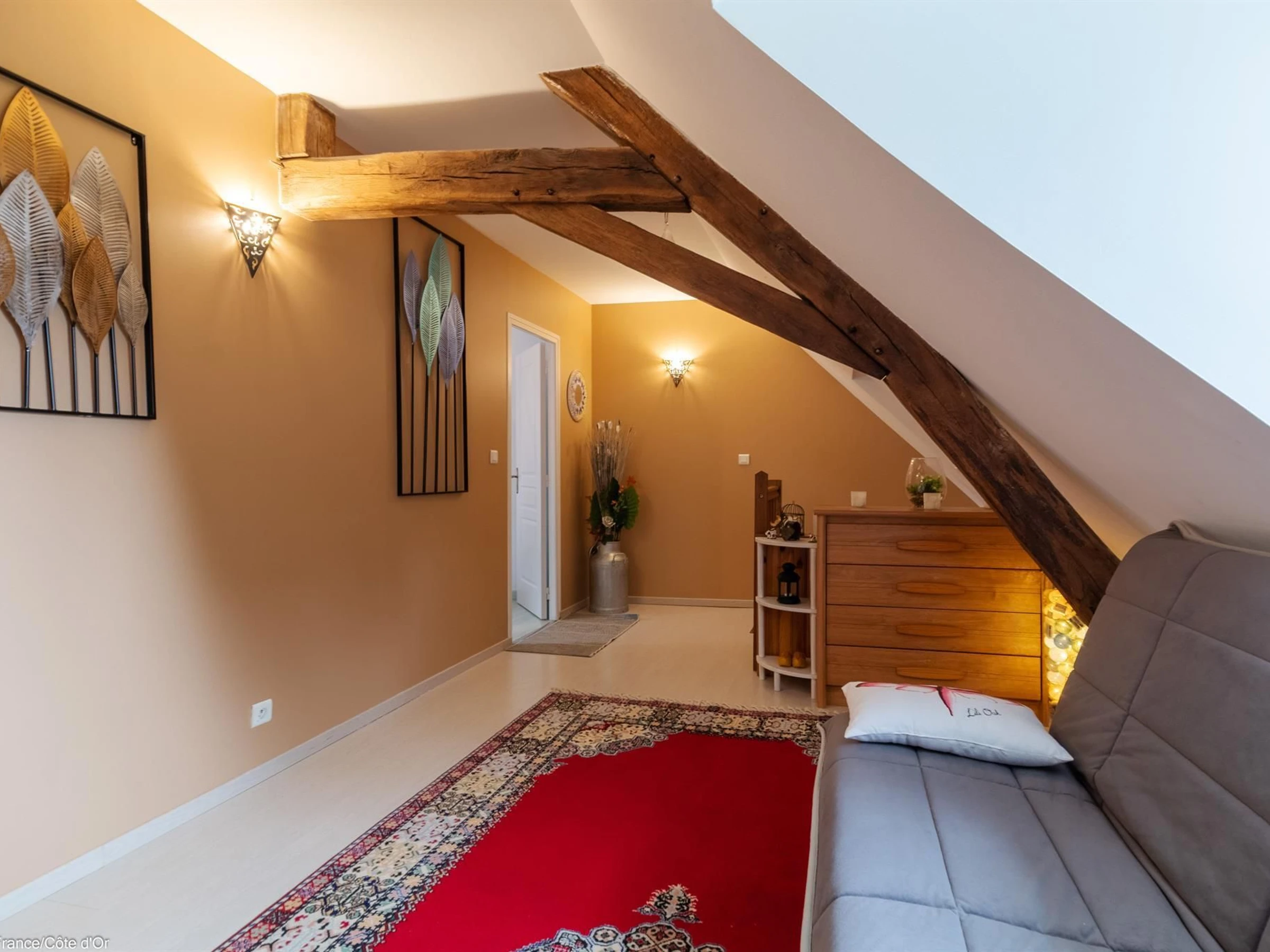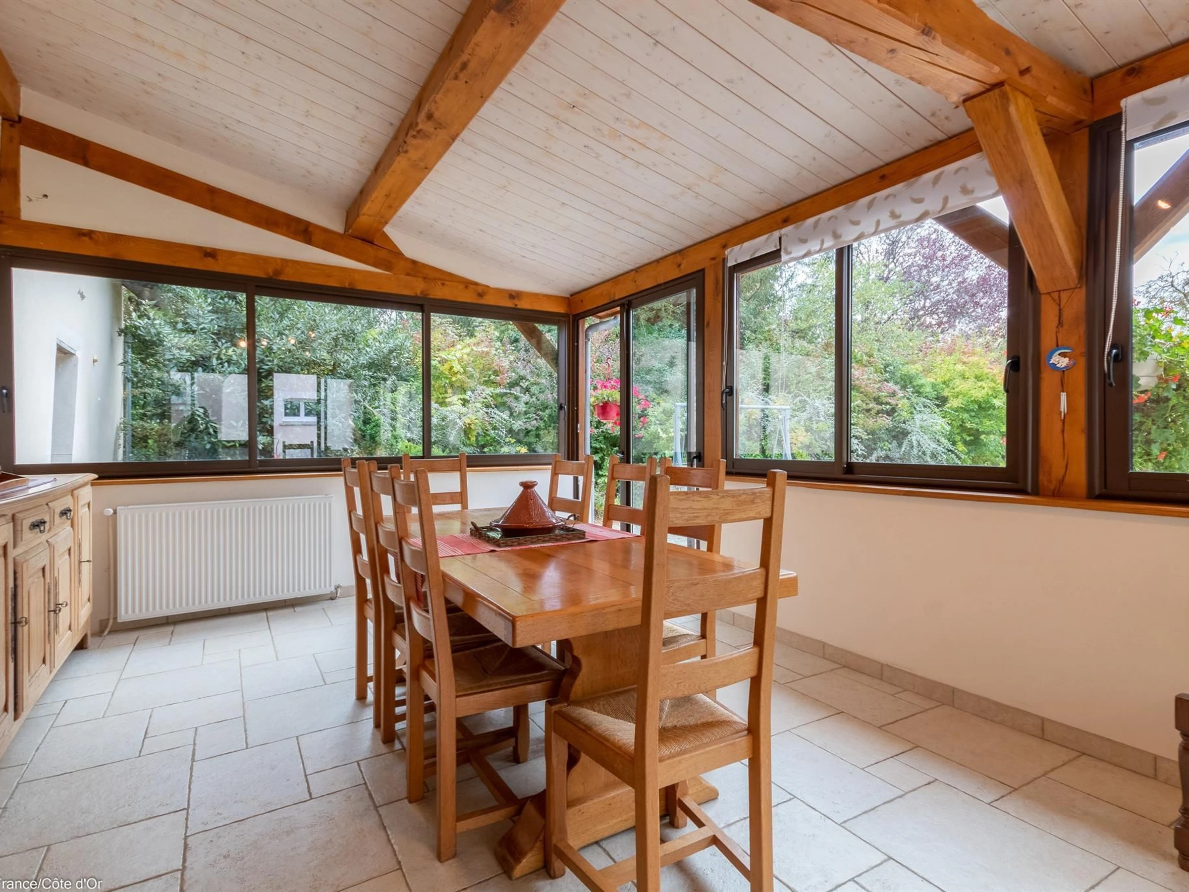 Rez-de-chaussée : salon de caractère avec dalles de Bourgogne, poutraison et cheminée insert, communicant avec la cuisine équipée. Grande véranda de 35 m² accueillant la salle à manger avec une belle vue sur le jardin. Une chambre avec 2 lits 90x200 jumelables. Salle d'eau avec WC.