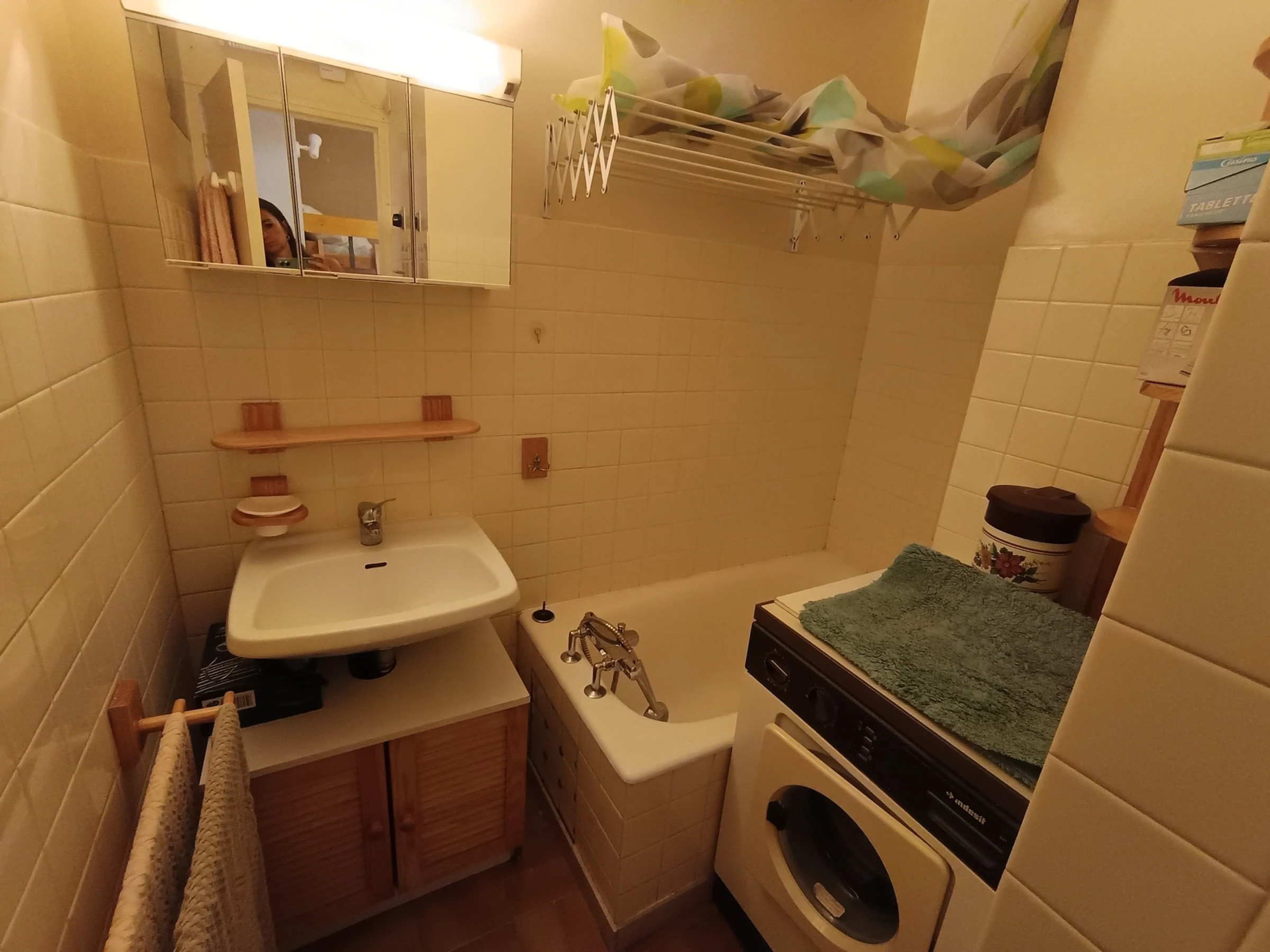 Salle d'eau au 1/2 étage : Baignoire avec rideau douche, lavabo, lave-linge, miroir, meuble rangement, étendage à linge.