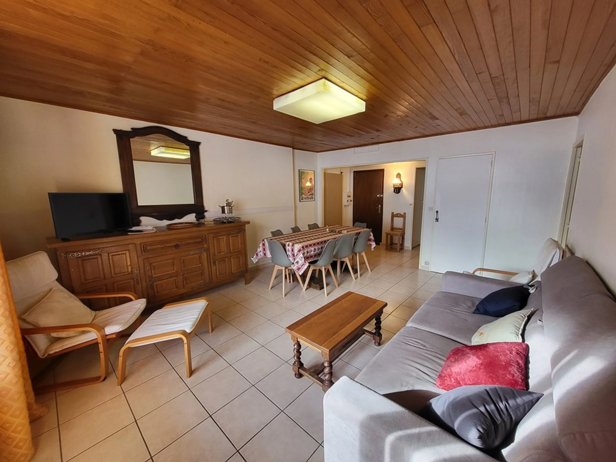 - d'un grand séjour avec un canapé, une télévision, 2 fauteuils, une table avec 8 chaises donnant sur un balcon exposition sud,
