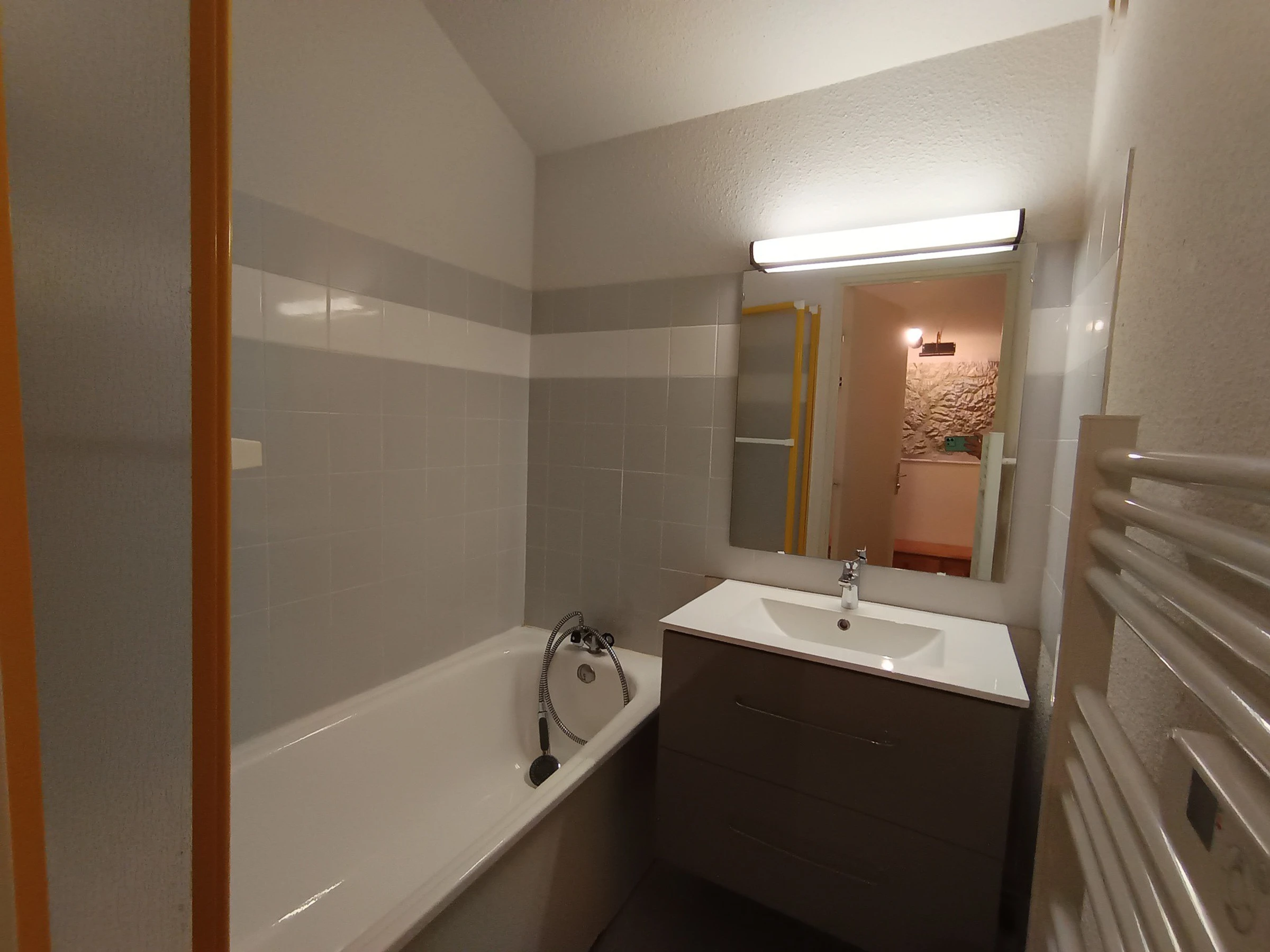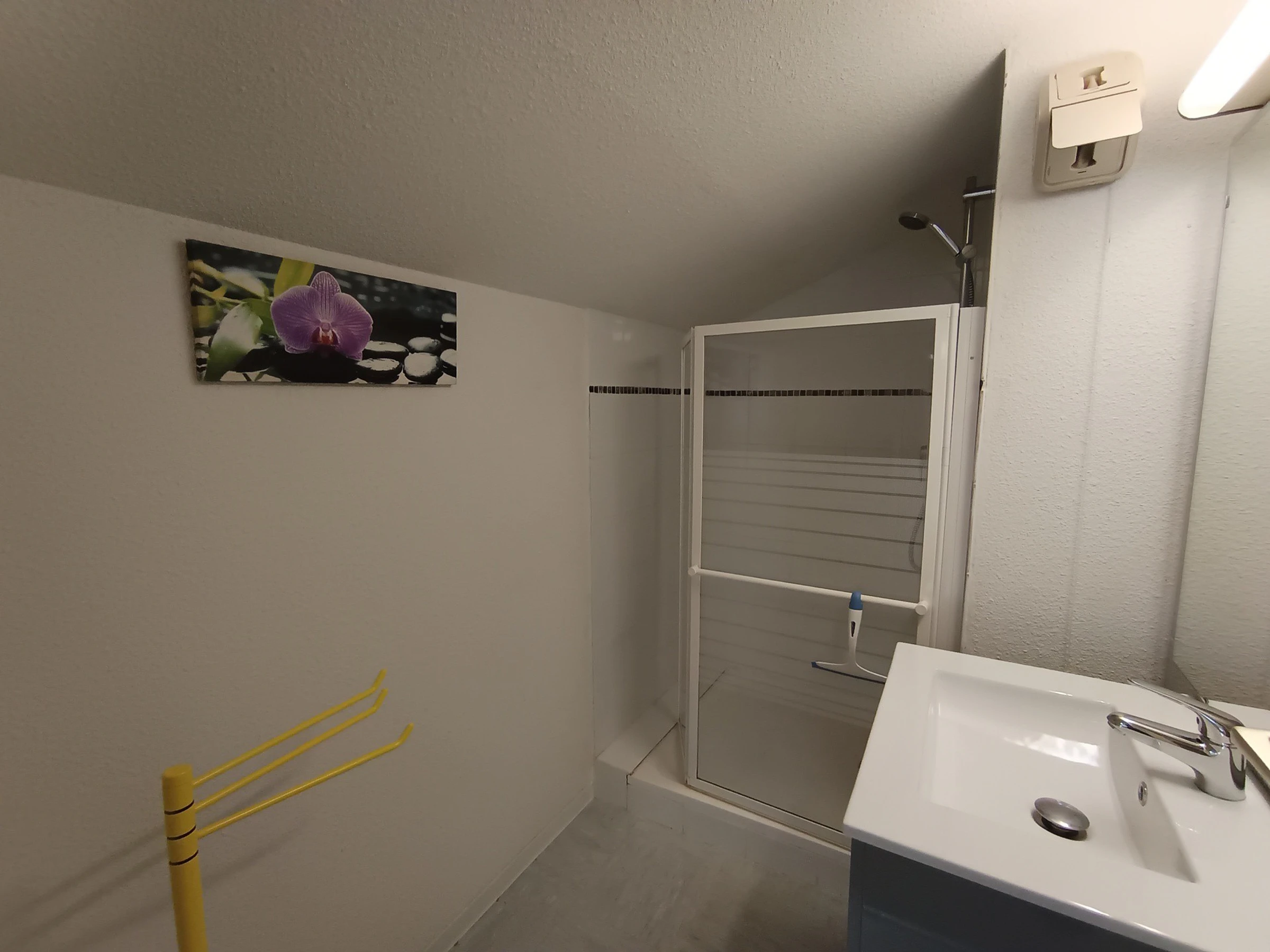 Salle d'eau : Cabine douche avec pare-douche, meuble avec vasque, sèche-servietes mural électrique.