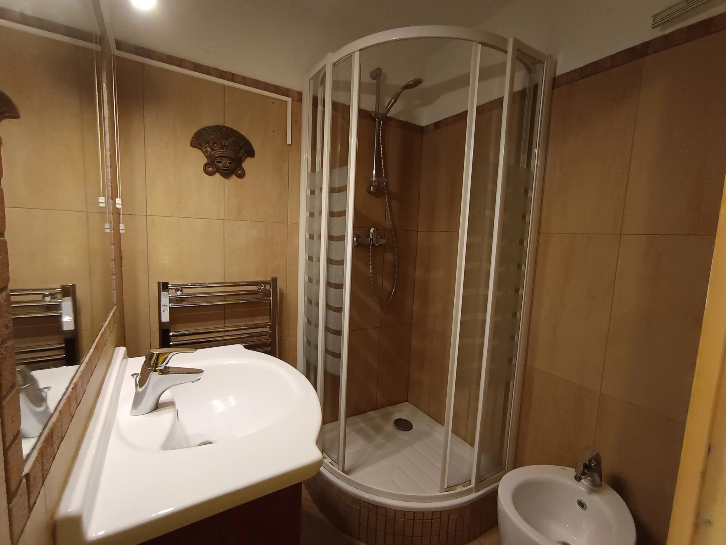 Salle de douche : Cabine douche avec pare-douche, meuble avec vasque, bidet, sèche-serviettes électrique mural.