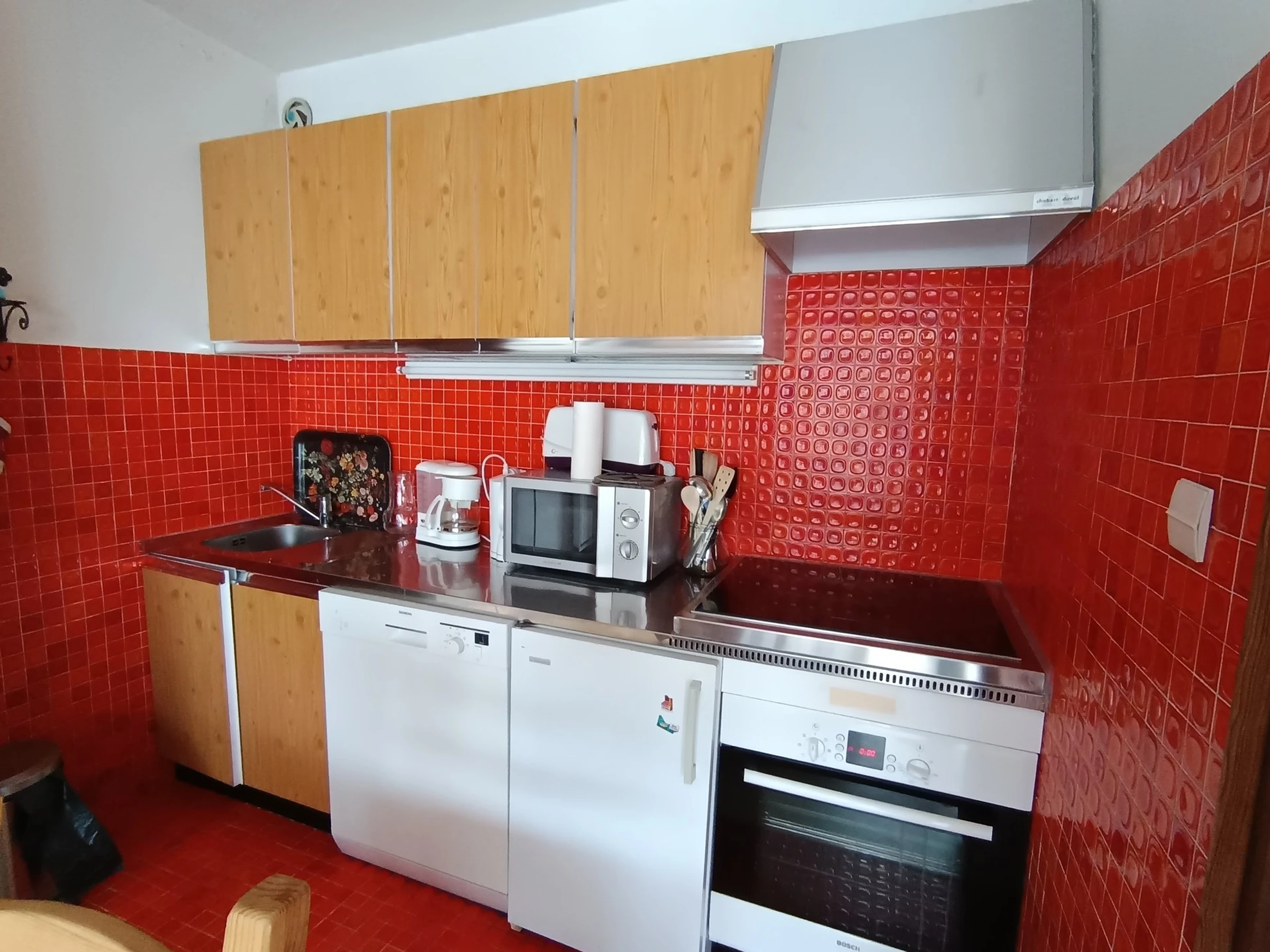 Coin cuisine : réfrigérateur top, lave-vaisselle, four, micro-ondes, 4 plaques à induction, cafetière, bouilloire, grille-pain.
