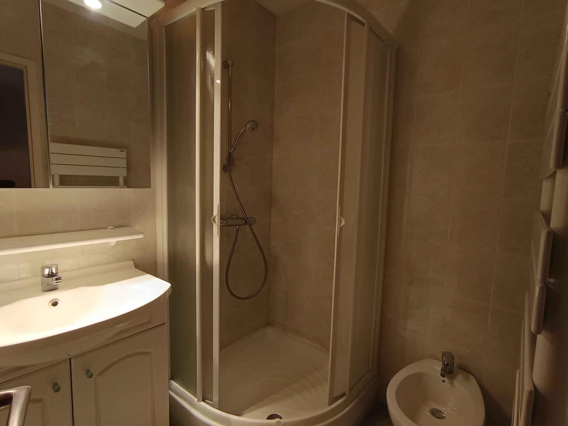 Salle d'eau : Cabine douche, meuble avec vasque, bidet, sèche-serviettes électrique mural, miroir.