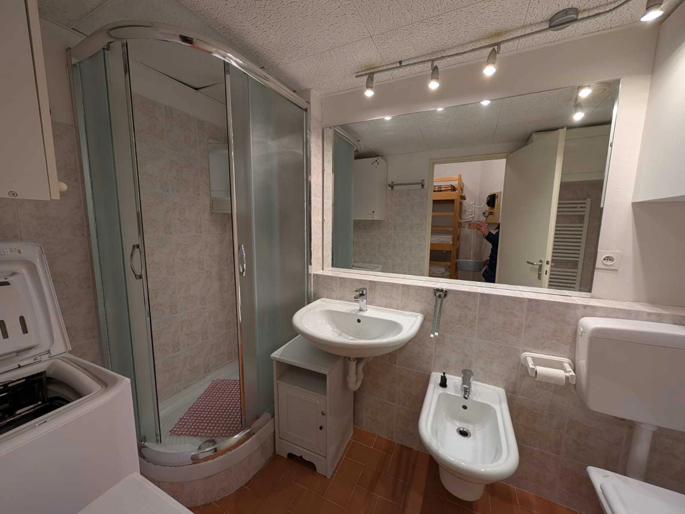 Salle d'eau : Cabine douche, vasque, rangement, WC, lave-linge, 1 commode, 1 meuble suspendu.