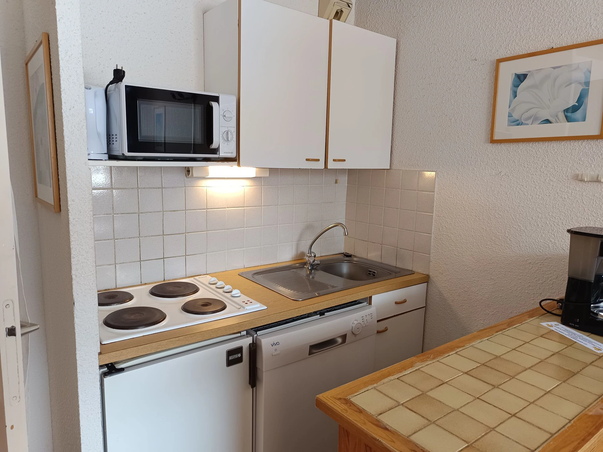 Coin cuisine : 2 plaques électriques, 1 mini-four, 1 micro-ondes, 1 lave-vaisselle, 1 réfrigérateur, 1 cafetière, 1 grille-pain, 1 bouilloire.