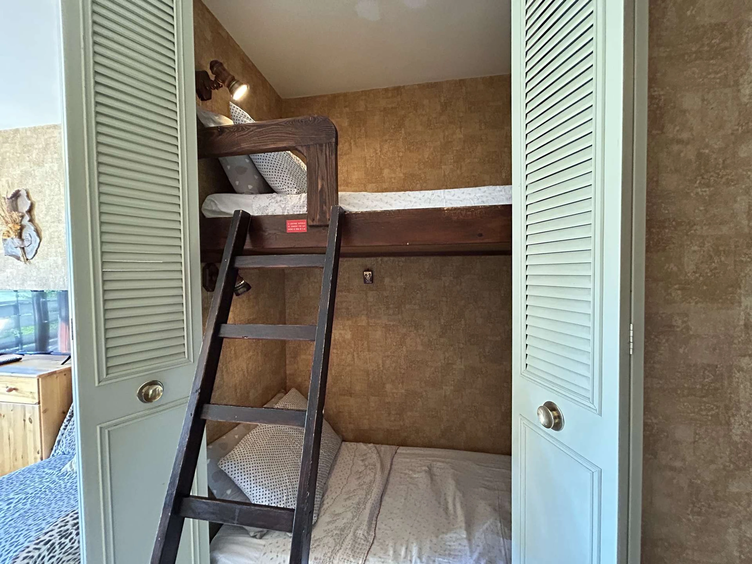 - un coin nuit avec deux lits superposés 1 personne , fermé par des portes en accordéon