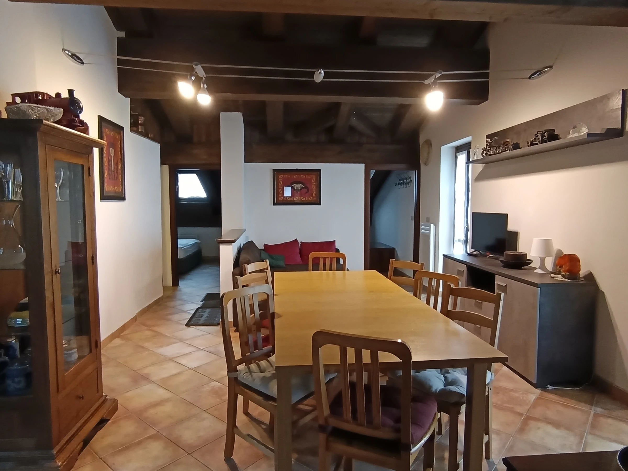 Séjour : Canapé, télévision, buffet, coin repas pour 8 personnes.
