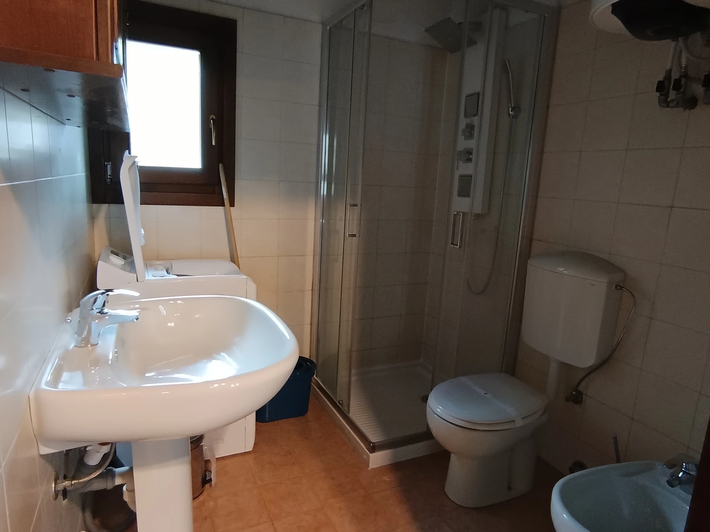 Salle d'eau : Cabine douche, WC, meuble avec vasque, bidet, placard, lave-linge.
