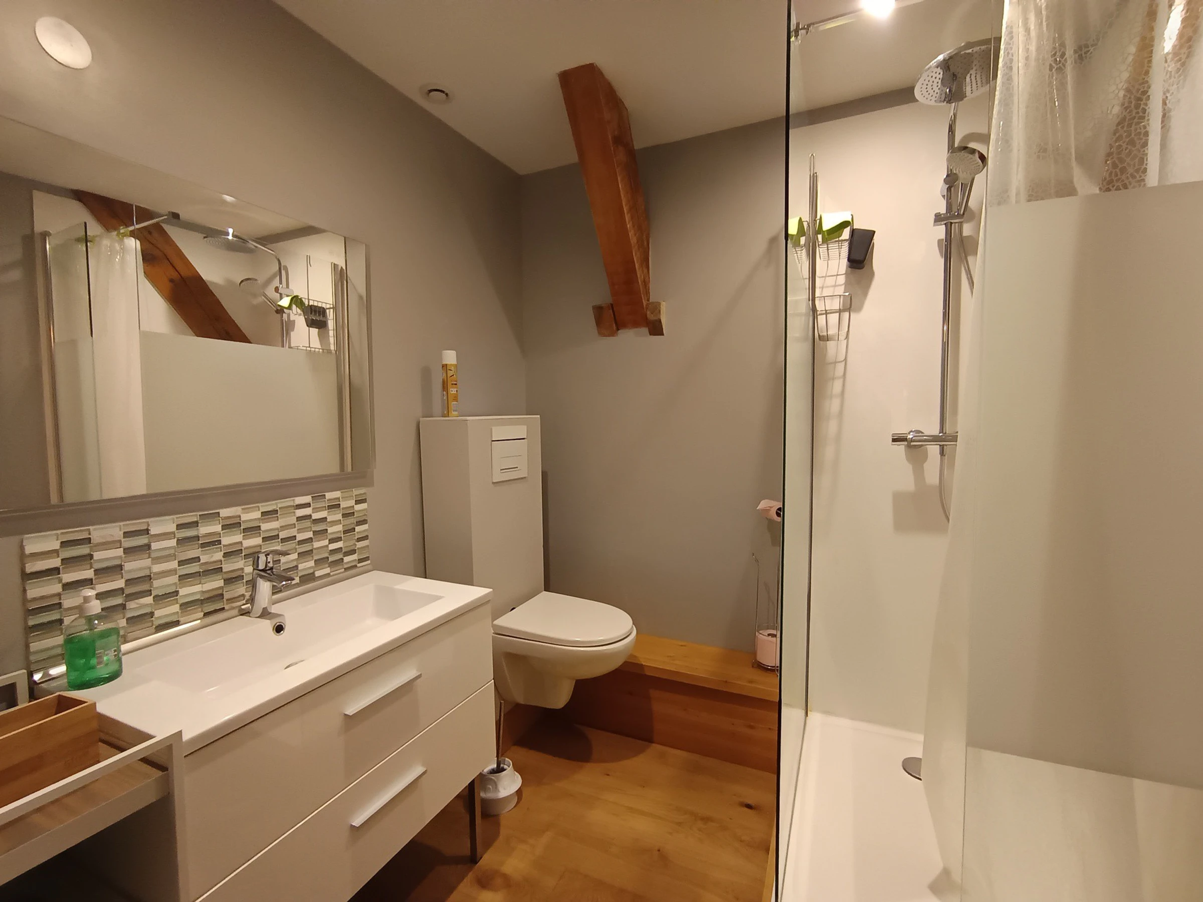 1 Salle d’eau : avec douche à l’italienne, meuble avec vasque, grand miroir, sèche-serviettes électrique mural, wc.