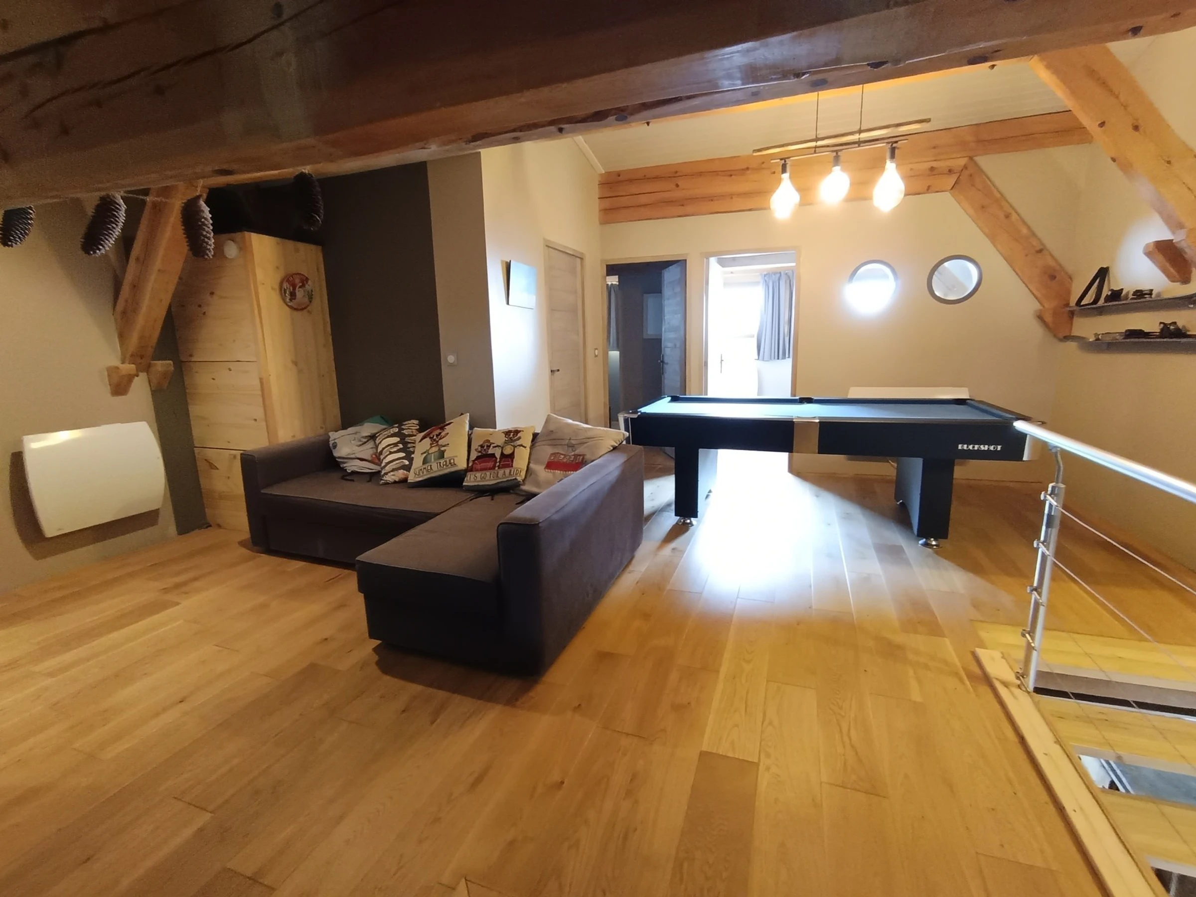 1 espace détente avec billard, canapé d’angle, TV avec grand écran.