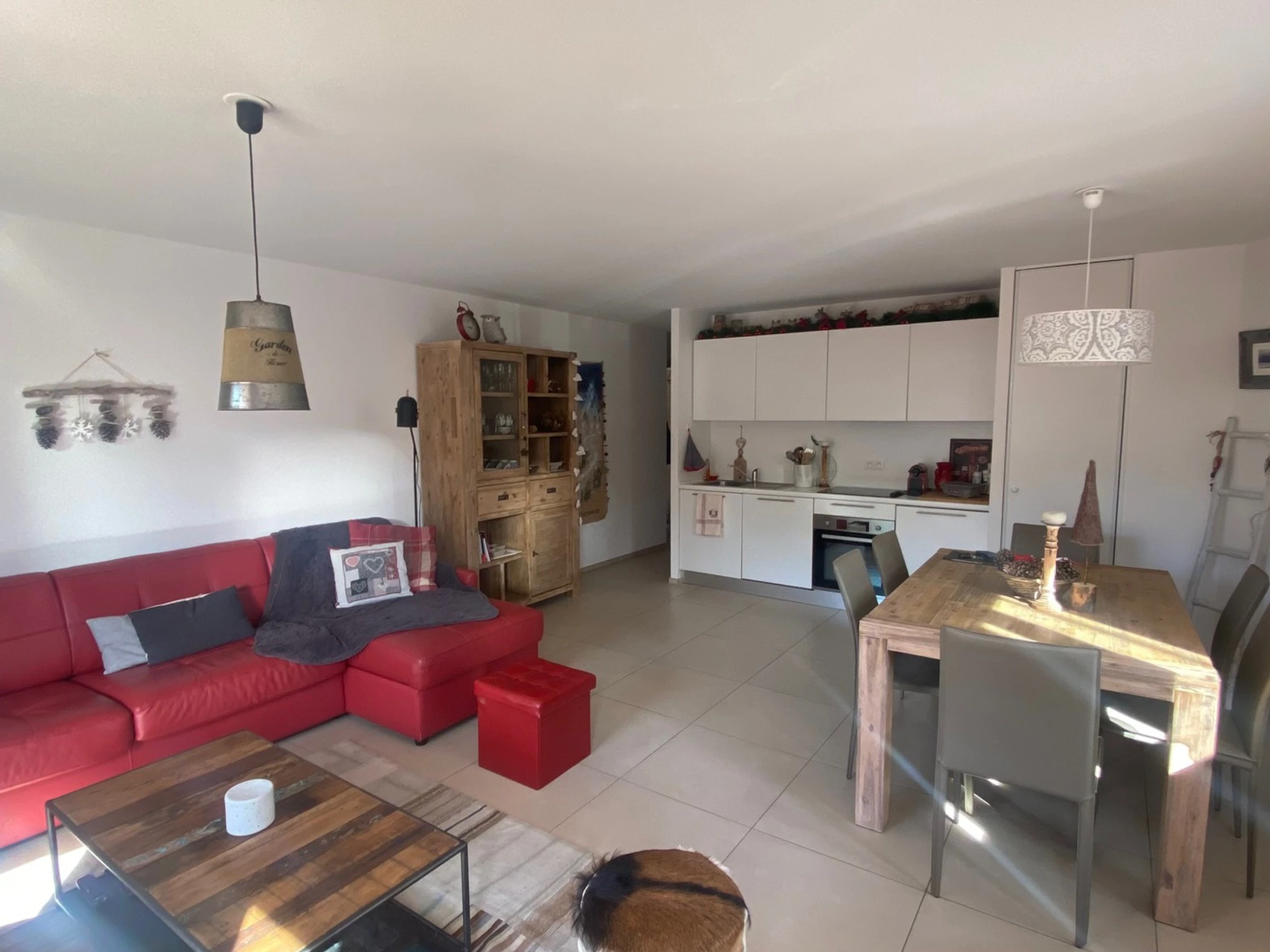 Grand séjour avec canapé d’angle – Meuble bas avec TV écran plat - table basse – Table de repas en bois avec chaises, grand placard bois de rangement divers, accès balcon plein sud de 7m² avec vue Janus.