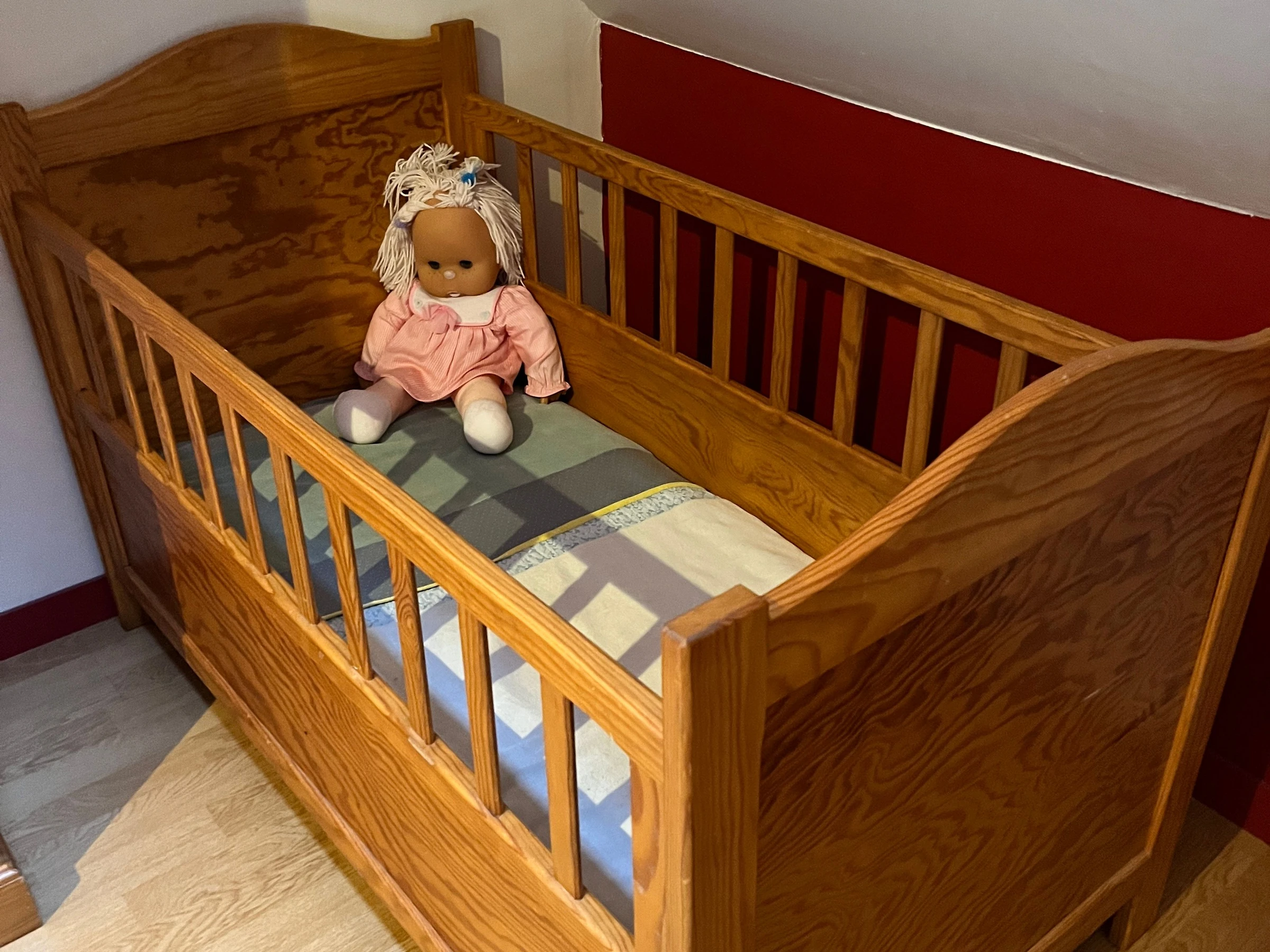 Lingerie avec lave-linge, sèche-linge et réfrigérateur, Lit et chaise bébé