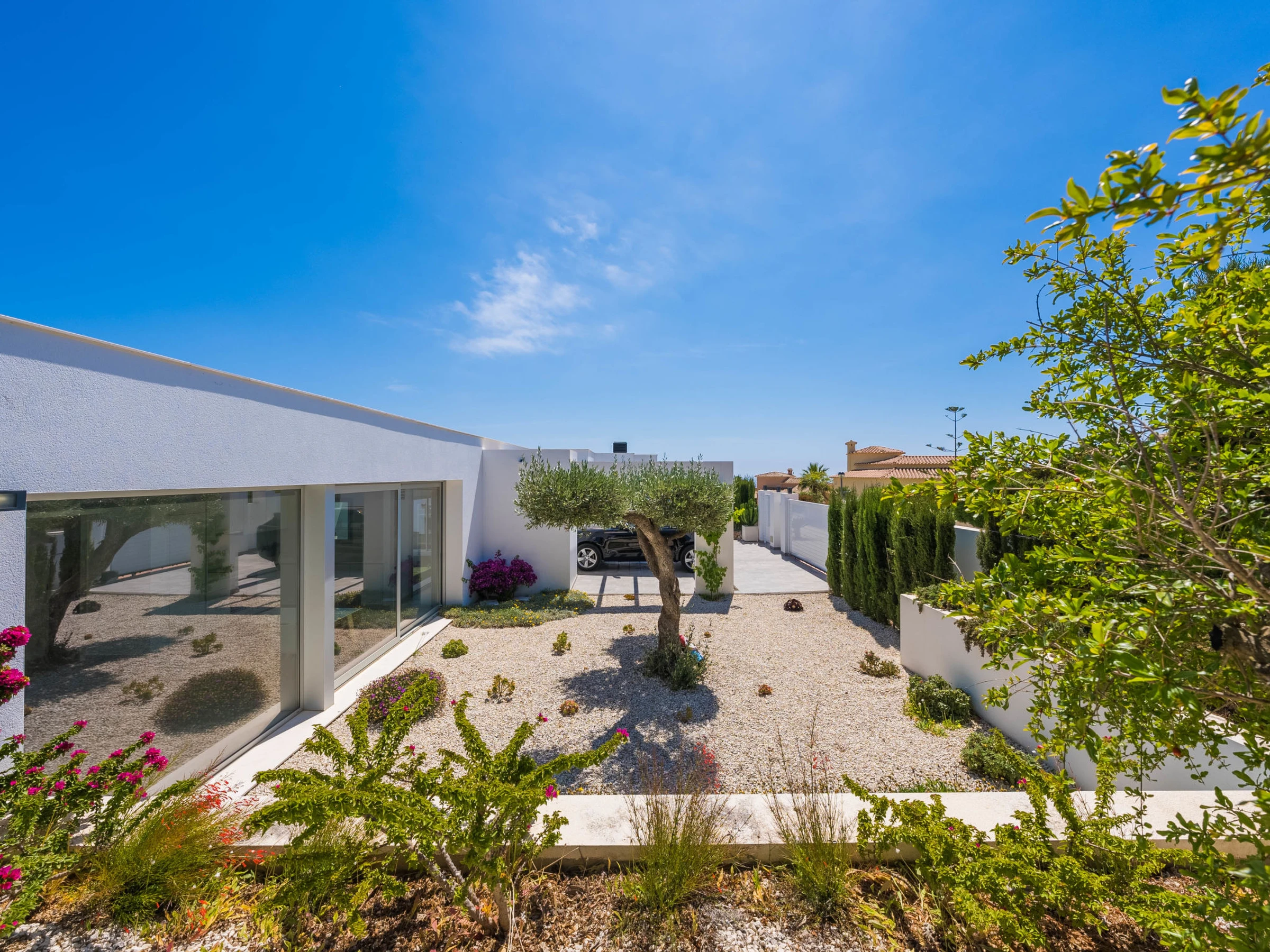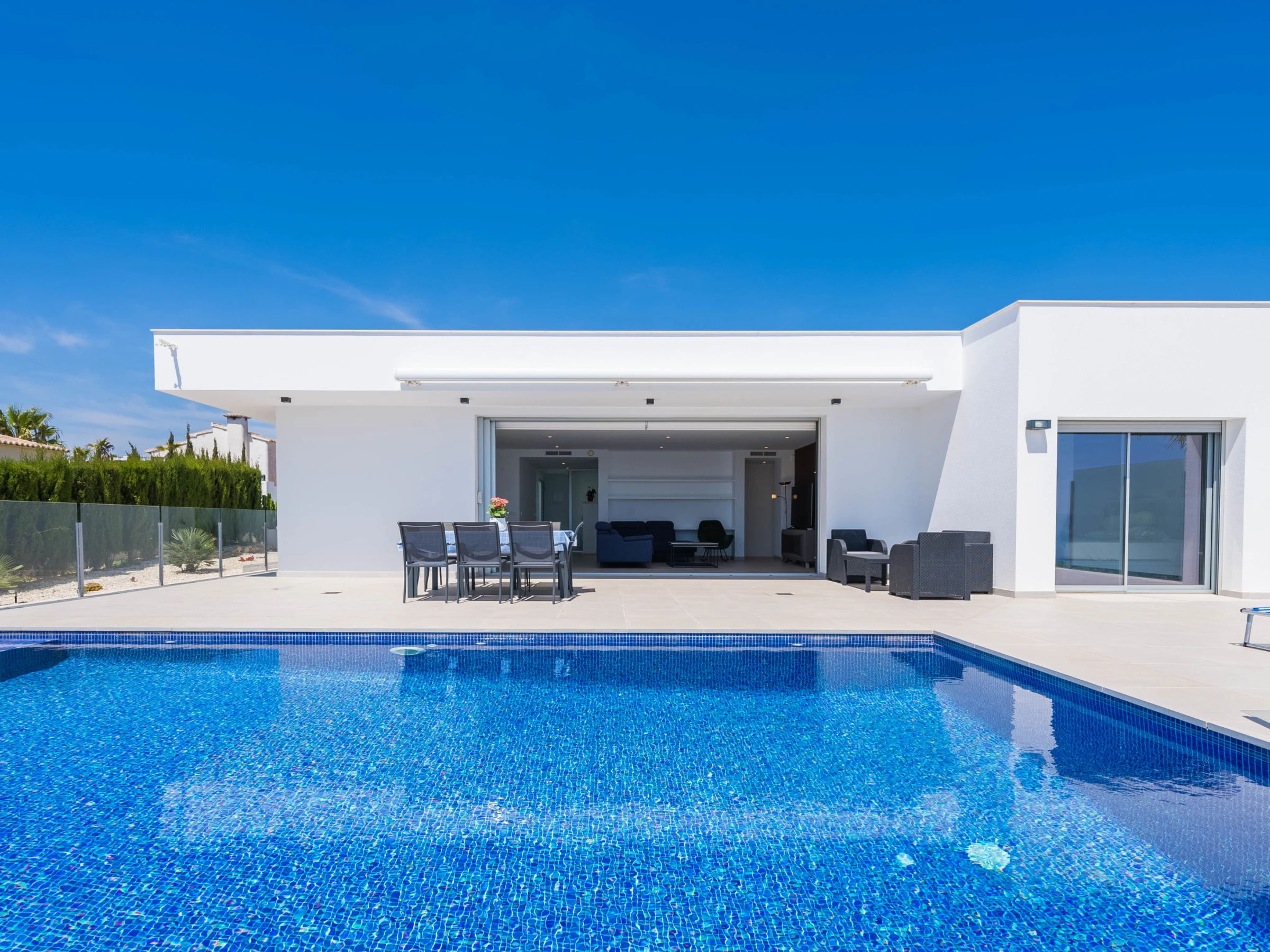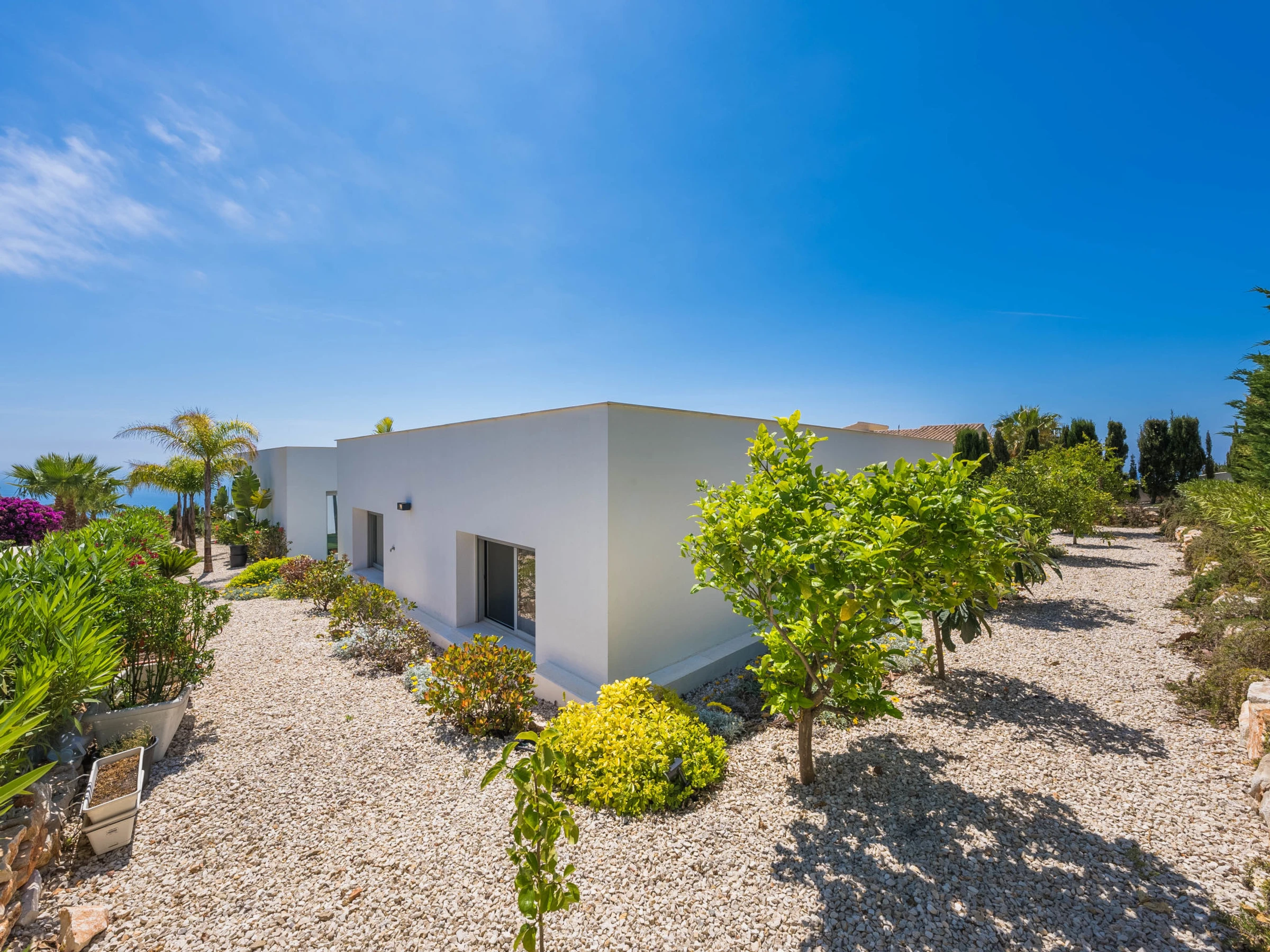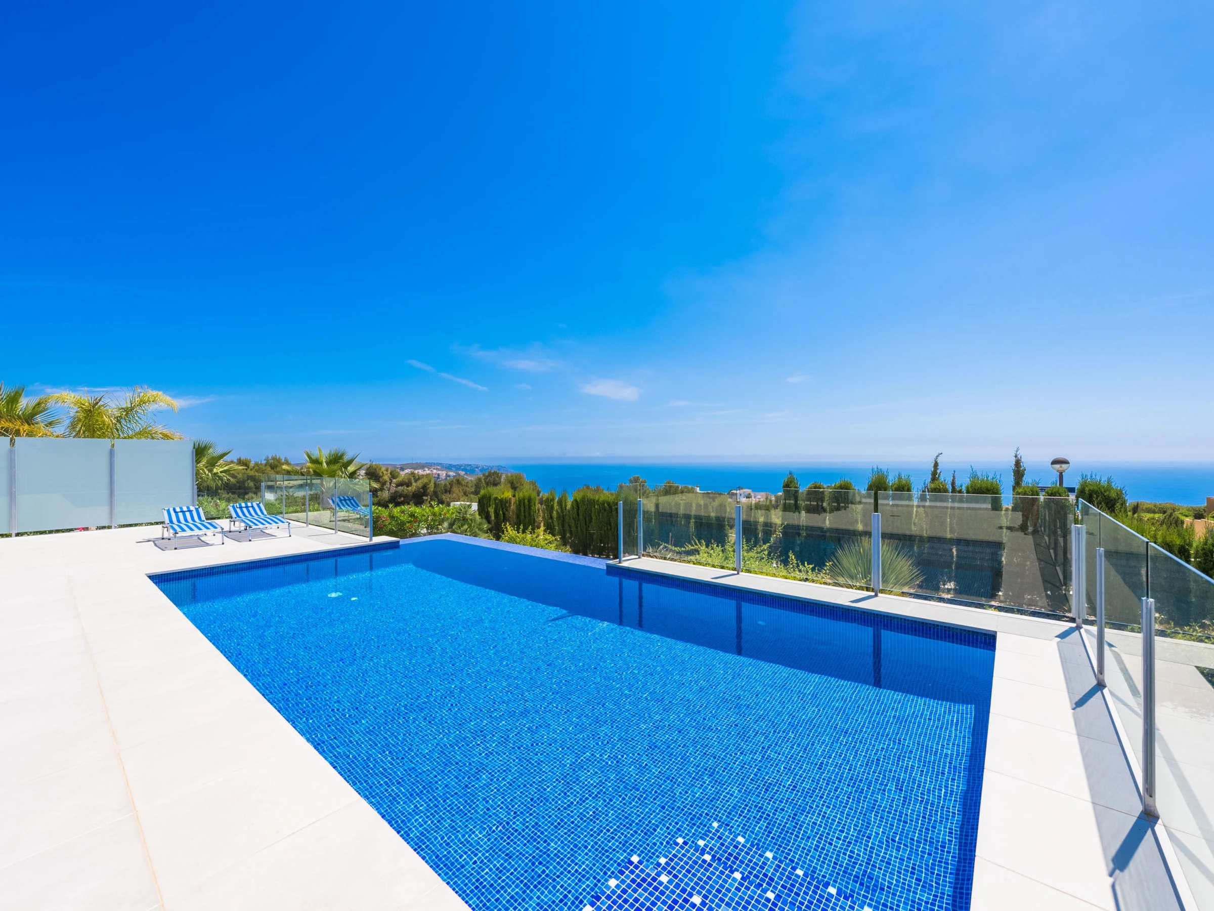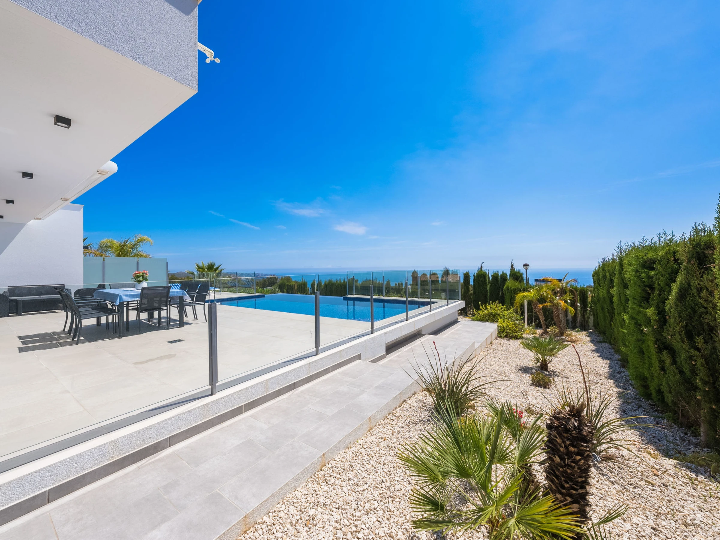 Cumbre del Sol: Belle villa moderne "Lirios View". Dans la localité, à 6 km du centre de Moraira, dans l'arrondissement Cumbre del Sol, situation tranquille, ensoleillée quartier résidentiel, zone avec peu de trafic, à 1.6 km de la mer, à 1.6 km de la plage. A usage privé: terrain 1'024 m2 (clôturé), piscine (8 x 4 m, disponibilité saisonnière: [hidden] - [hidden] avec marches intérieures. Douche extérieure, terrasse. Magasin d'alimentation 5 km, supermarché 5 km, restaurant 2 km, arrêt de bus "Benitachell" 5.2 km, gare ferroviaire "Teulada" 8.7 km, ferry "Denia" 24.3 km, plage de sable "Playa de la Ampolla" 7 km, plage de rochers "Cala del Moraig" 1.6 km. Port plaisance 7 km, marina 7 km, terrain de golf (18 trous) 9 km. Attractions à proximité: Aqualandia, Les Fonts de l'Algar, Castillo de Guadalest, Mundomar, Terra Mítica, Terra Natura. Le propriétaire n'accepte pas les groupes de jeunes.