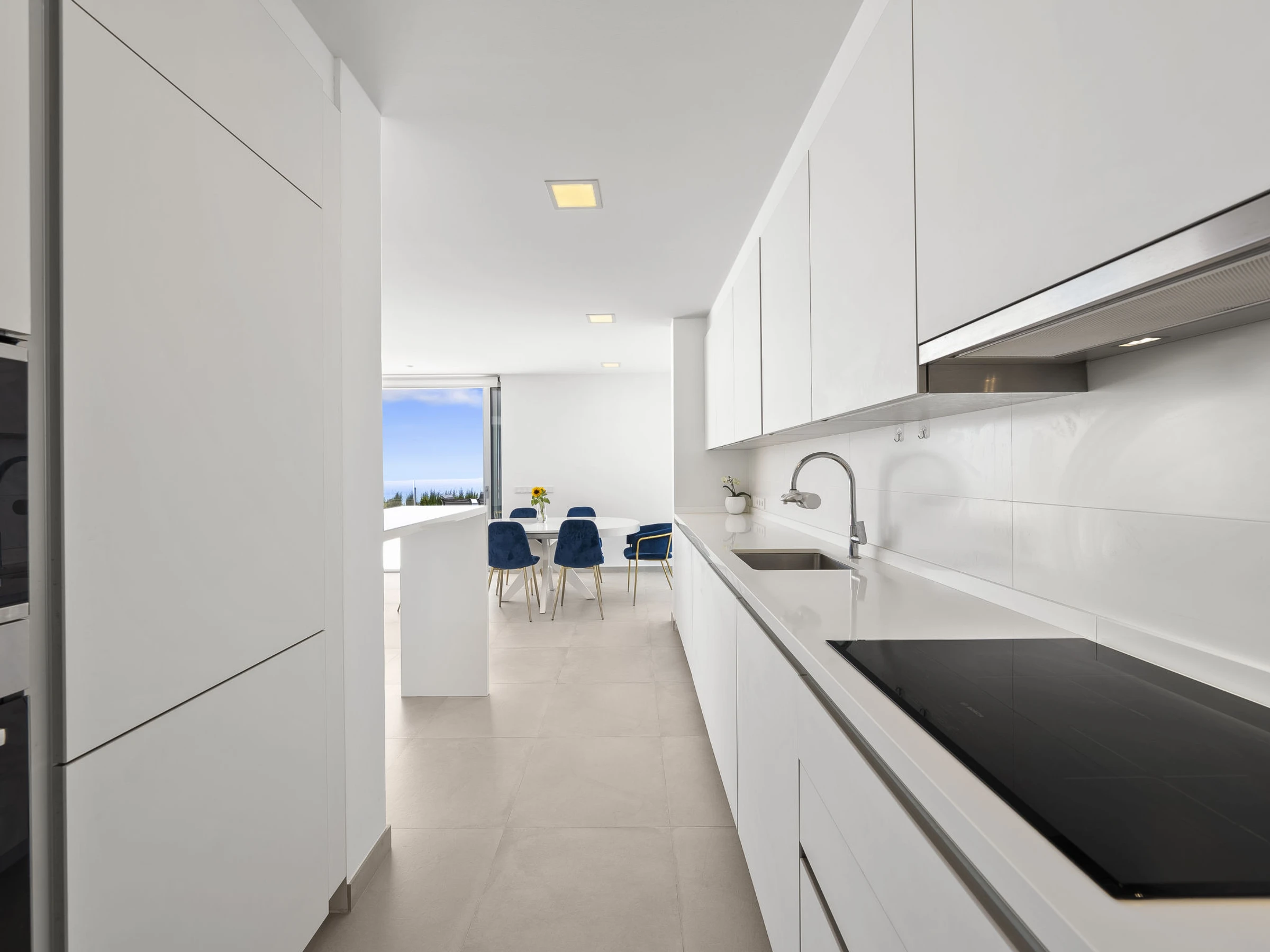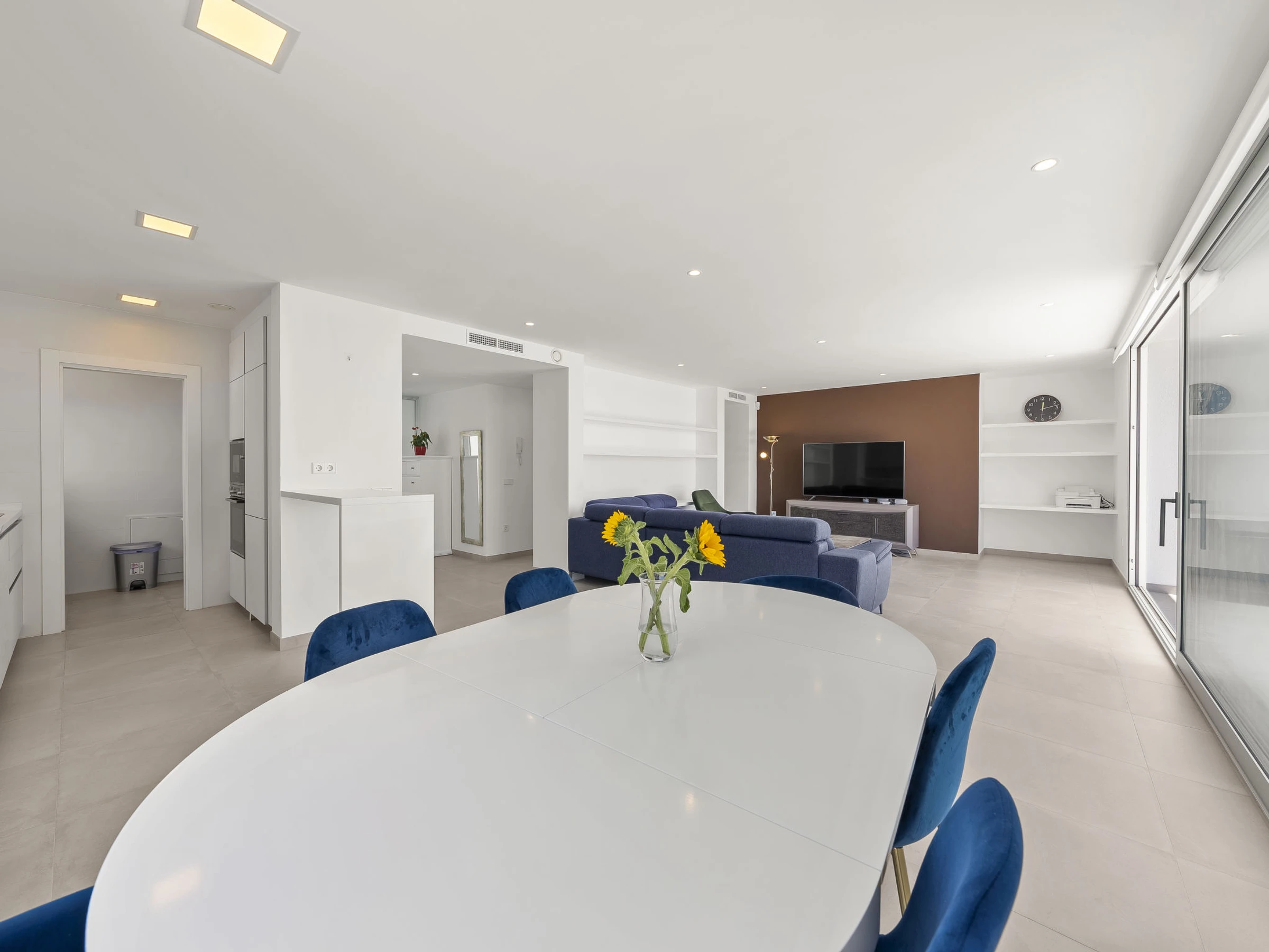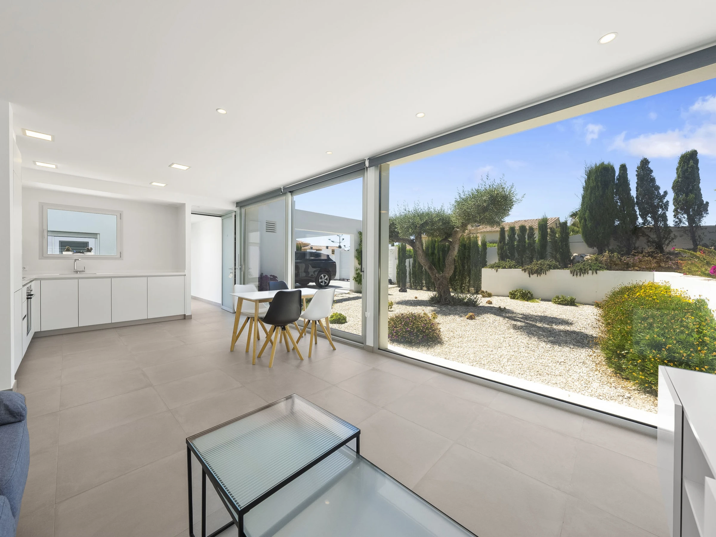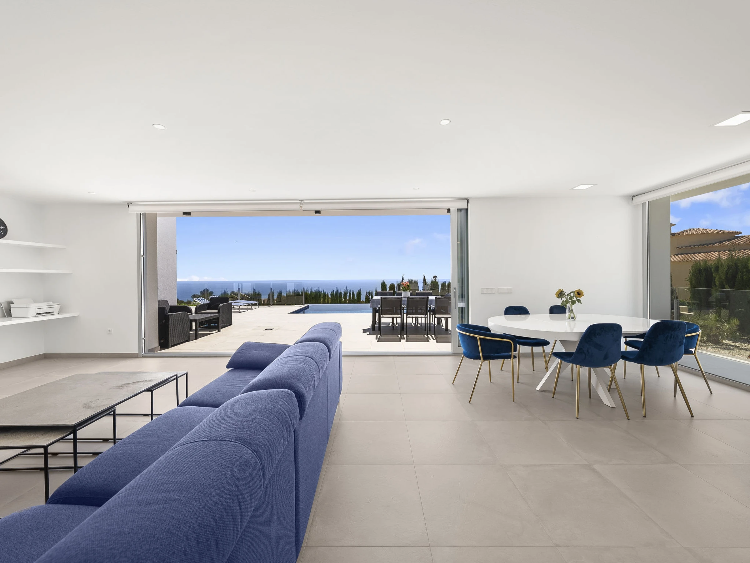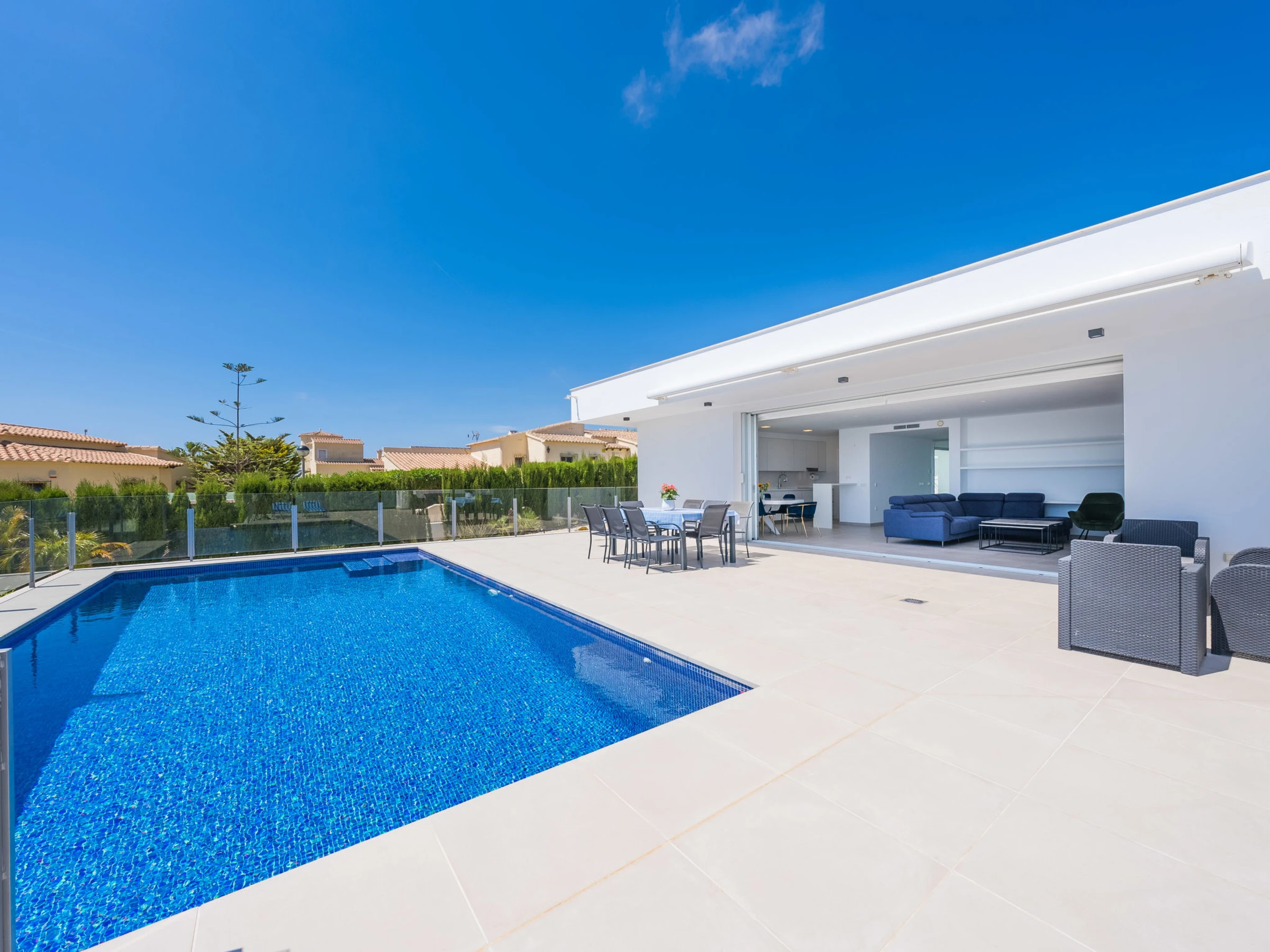 Cumbre del Sol: Belle villa moderne "Lirios View". Dans la localité, à 6 km du centre de Moraira, dans l'arrondissement Cumbre del Sol, situation tranquille, ensoleillée quartier résidentiel, zone avec peu de trafic, à 1.6 km de la mer, à 1.6 km de la plage. A usage privé: terrain 1'024 m2 (clôturé), piscine (8 x 4 m, disponibilité saisonnière: [hidden] - [hidden] avec marches intérieures. Douche extérieure, terrasse. Magasin d'alimentation 5 km, supermarché 5 km, restaurant 2 km, arrêt de bus "Benitachell" 5.2 km, gare ferroviaire "Teulada" 8.7 km, ferry "Denia" 24.3 km, plage de sable "Playa de la Ampolla" 7 km, plage de rochers "Cala del Moraig" 1.6 km. Port plaisance 7 km, marina 7 km, terrain de golf (18 trous) 9 km. Attractions à proximité: Aqualandia, Les Fonts de l'Algar, Castillo de Guadalest, Mundomar, Terra Mítica, Terra Natura. Le propriétaire n'accepte pas les groupes de jeunes.